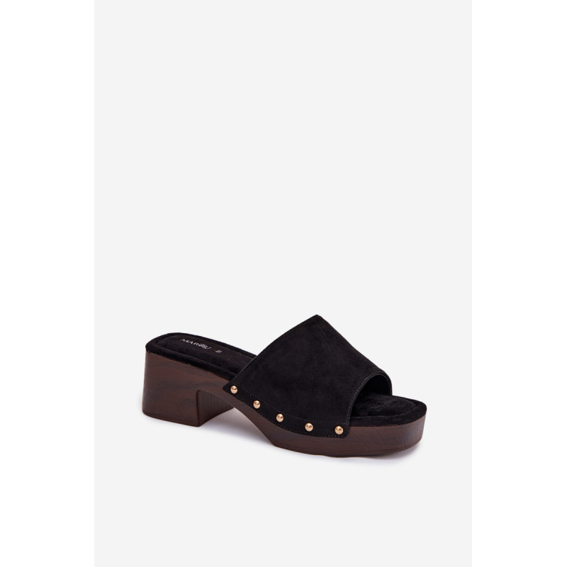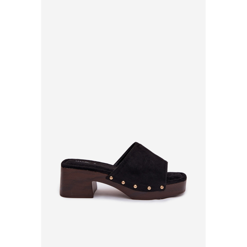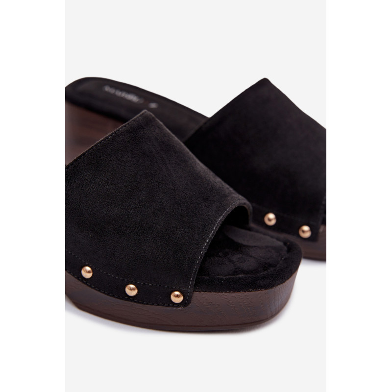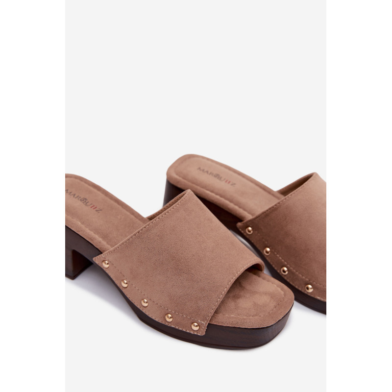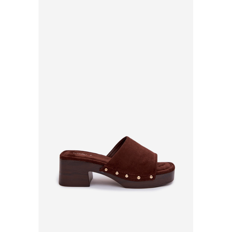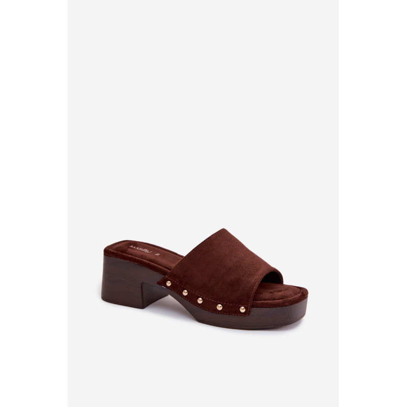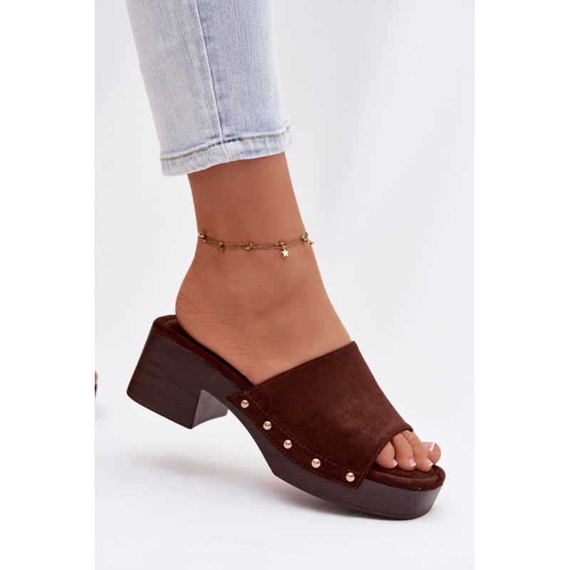 Moteriškos šlepetės, pagamintos iš ekologiško zomšos, yra stilingas pasiūlymas moterims, kurios mėgsta mados akcentus. Modelis su stabilia kubo formos kulnu ir platforma užtikrina patogumą ir pasitikėjimą žingsniu. Minkšta įdėklas rūpinasi komfortu, o auksiniai kniedės šonuose suteikia visumai išraiškingo charakterio. Šios šlepetės puikiai tinka tiek kasdieniam dėvėjimui, tiek labiau stilingiems vasaros deriniams. Renkantis dydį, vadovaukitės dydžių lentele.