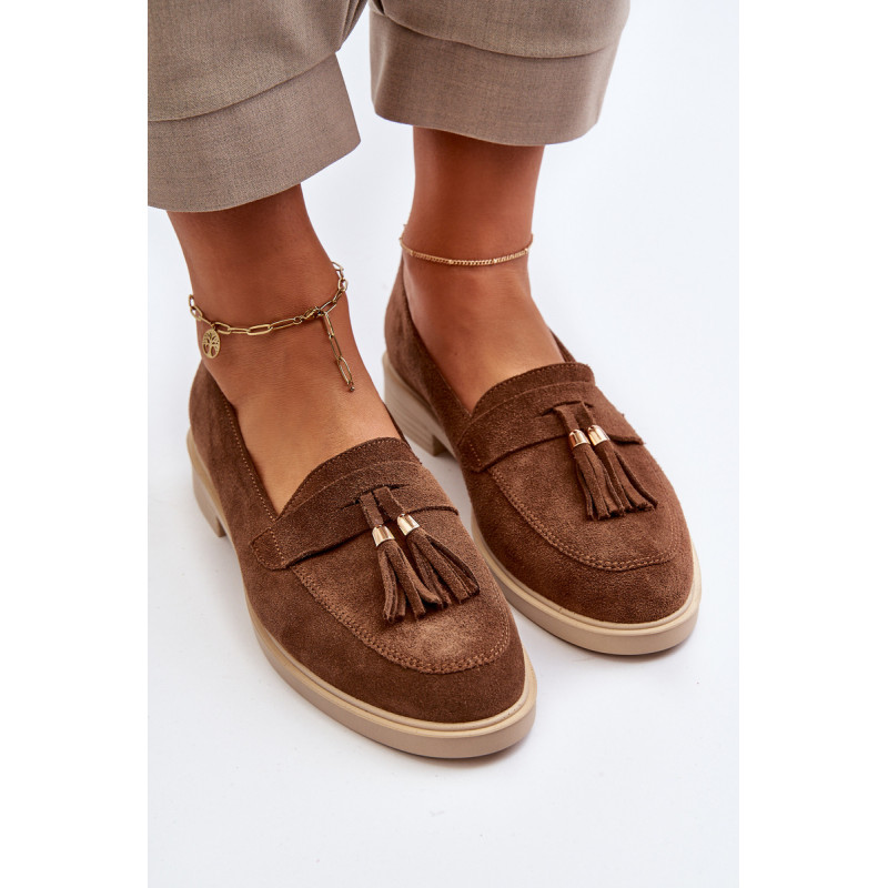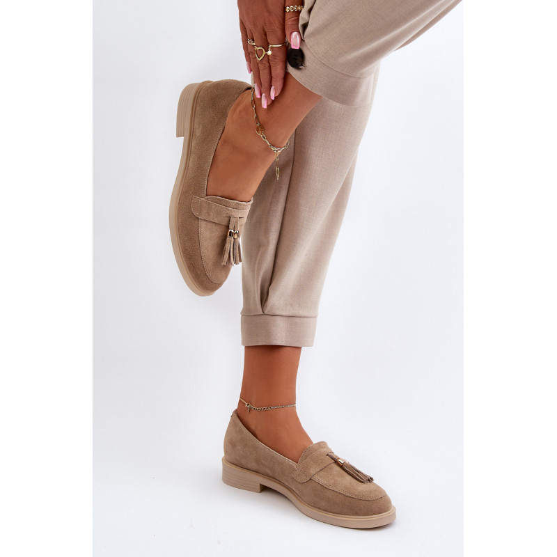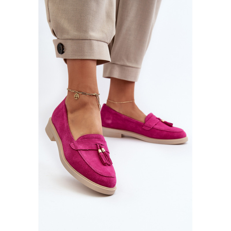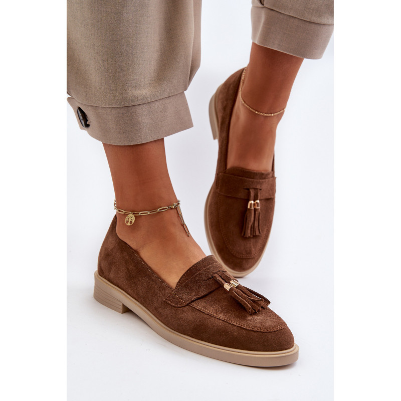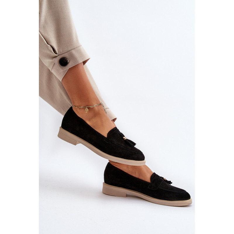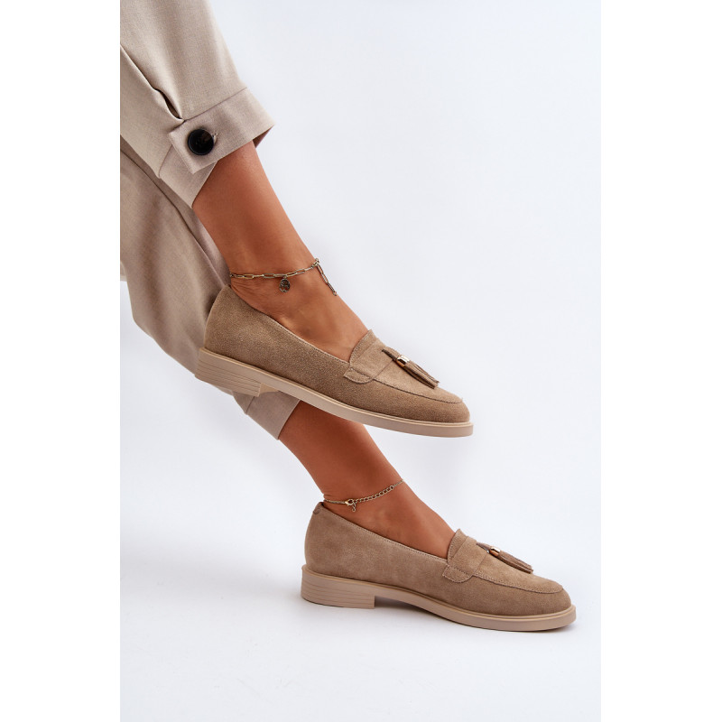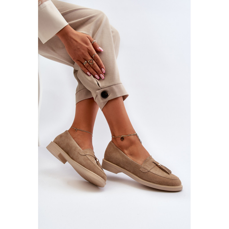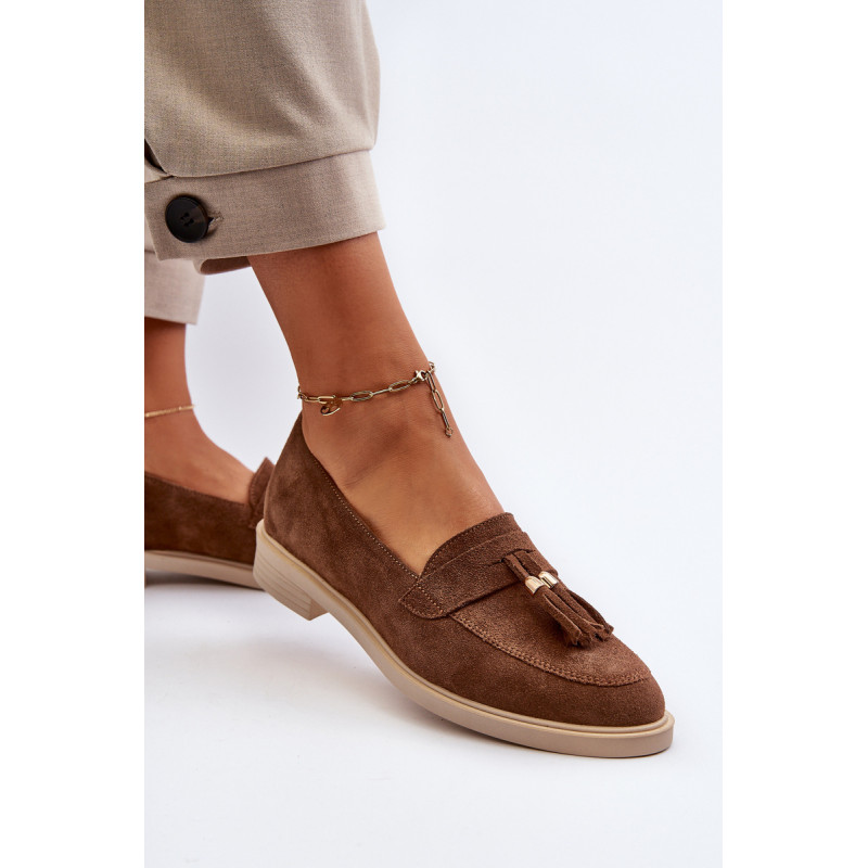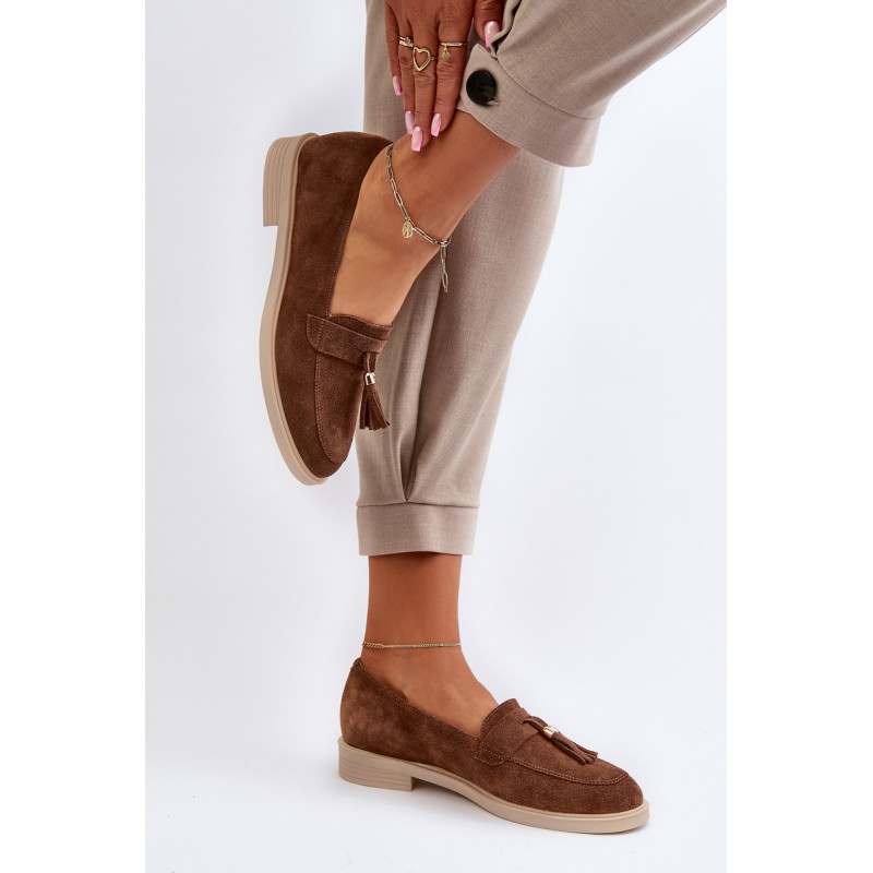 Moteriški mokasinai iš natūralios zomšos, pasižymintys plokščiu kulnu, užtikrinančiu stabilumą einant. Priekinė dalis dekoruota subtiliais kutais, kurie suteikia subtilumo ir stiliaus. Profiliuotas vidpadis suteikia papildomo komforto ilgalaikio dėvėjimo metu. Tai puikus pasirinkimas tiems, kurie vertina tiek madingą išvaizdą, tiek patogumą. Rinkdamiesi dydį žiūrėkite dydžių lentelę.
