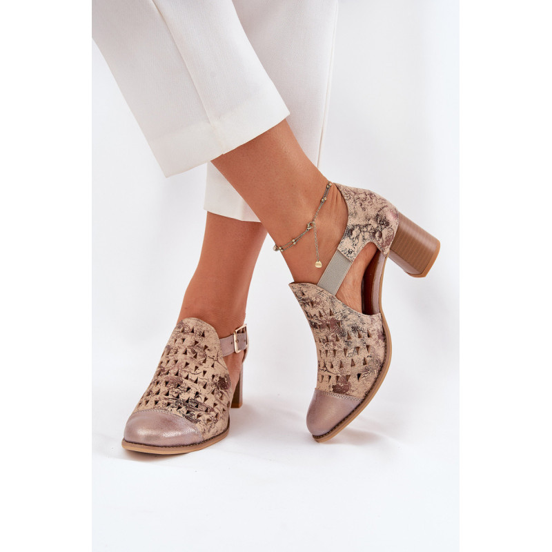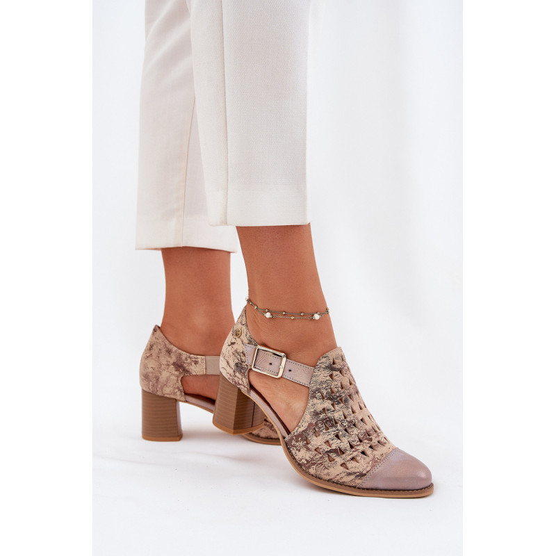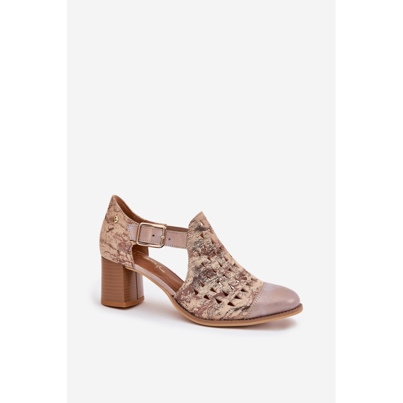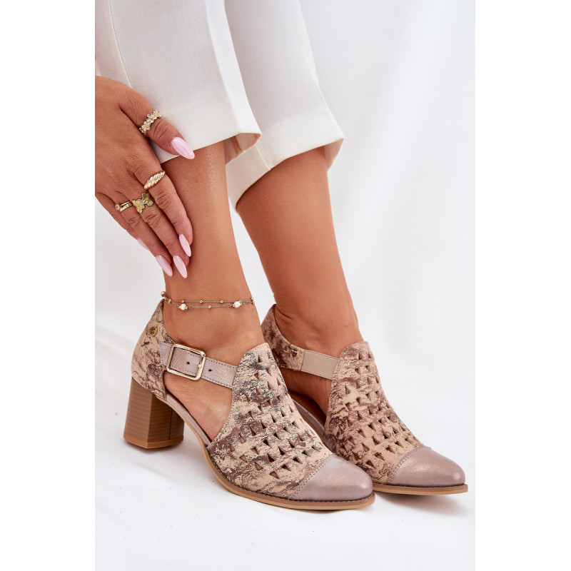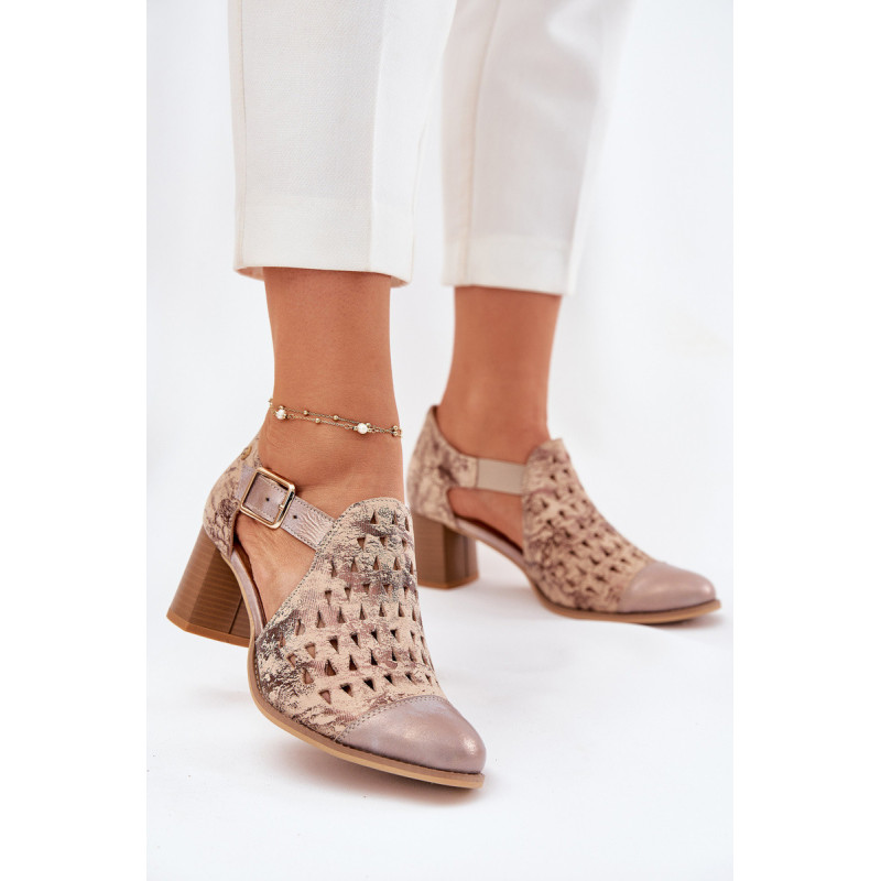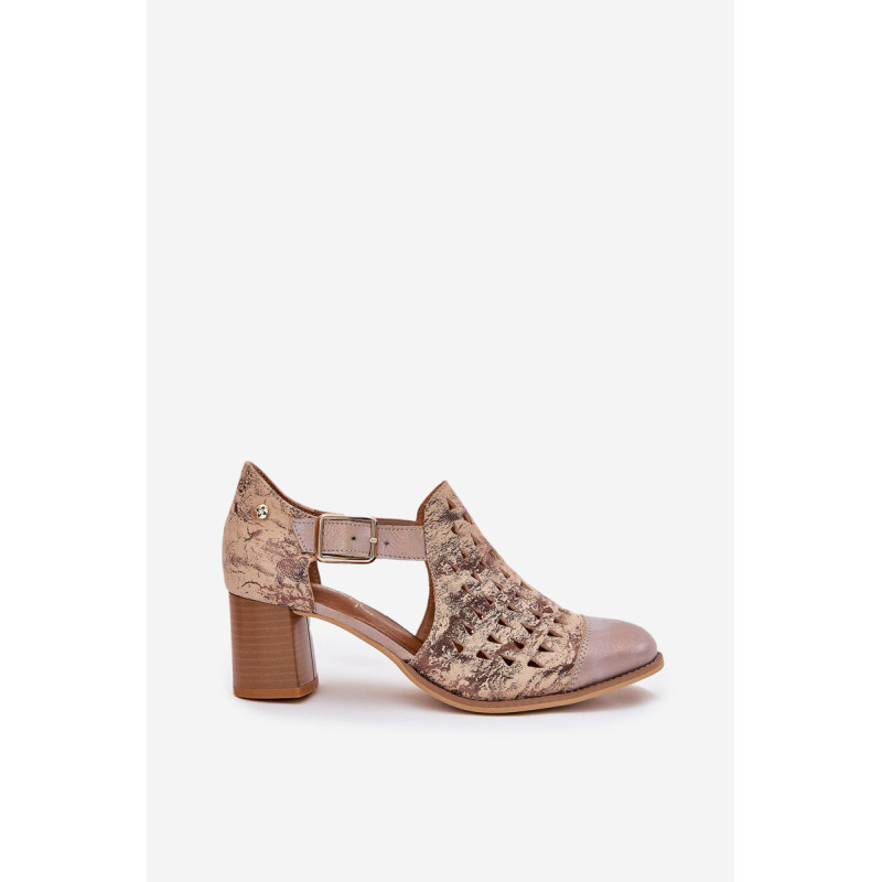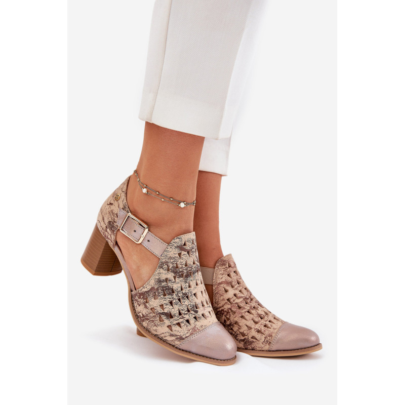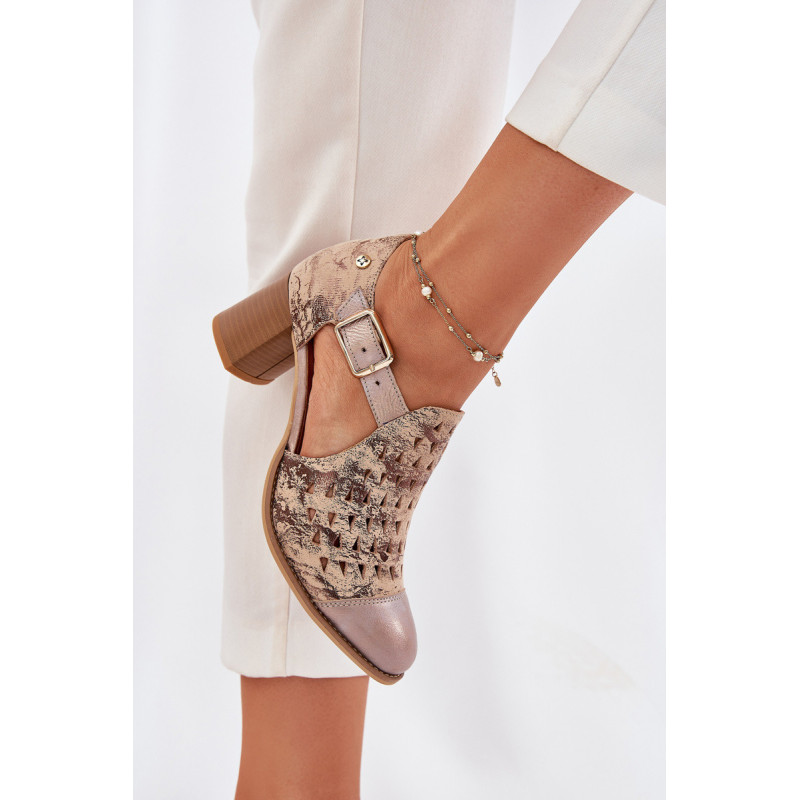 Batai su migdolų formos pirštu. Jie turi reguliuojamą dirželį, kuris užsegamas aplink čiurną su sagtimi ir elastine juosta. Šoninėse dalyse yra įspūdingos išpjovos. Pagaminti iš natūralios odos. Turi sutvirtintą kulną. Papuošti perforuotu raštu priekinėje dalyje. Minkšta odinė pado dalis leidžia patogiai nešioti batus net visą dieną! Kulnas stabilios kolonos pavidalu. Renkantis dydį, vadovaukitės dydžių lentele.