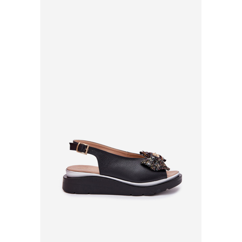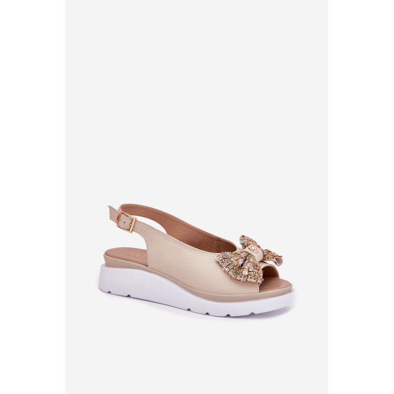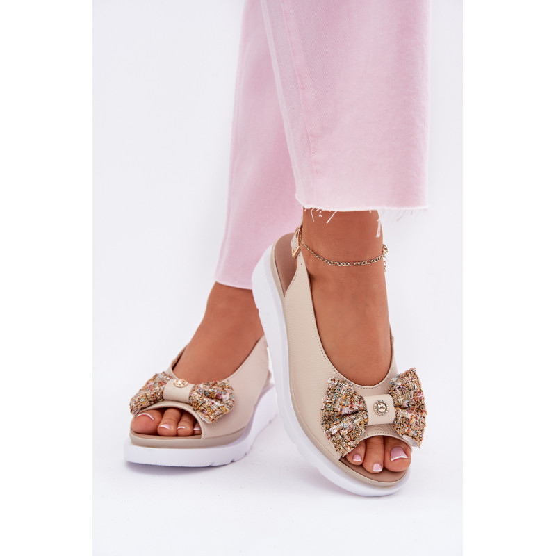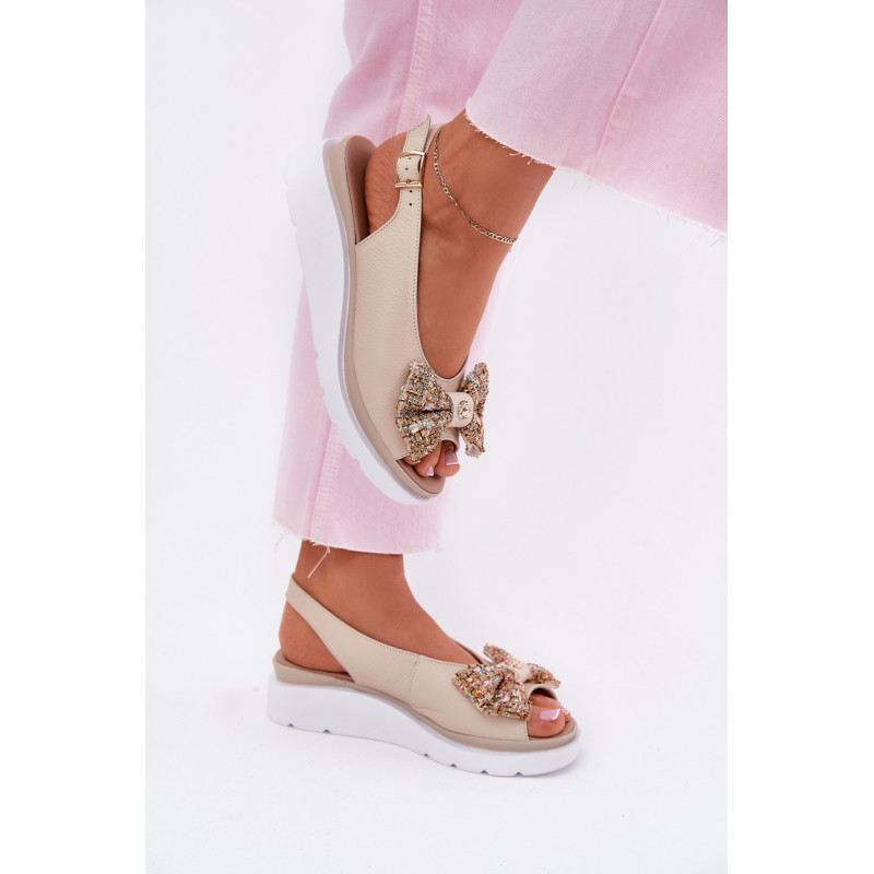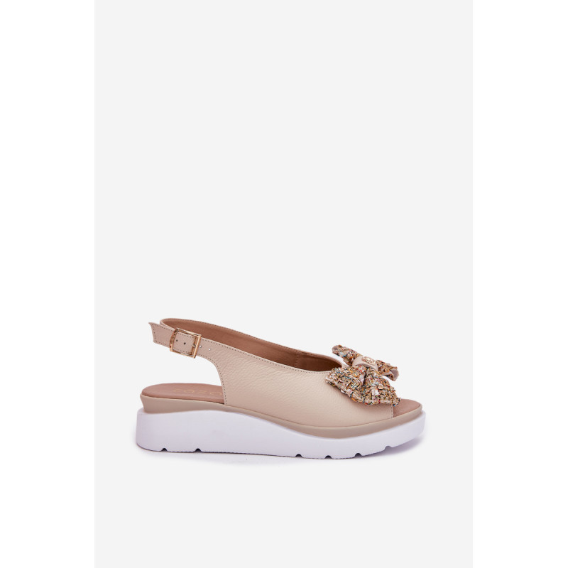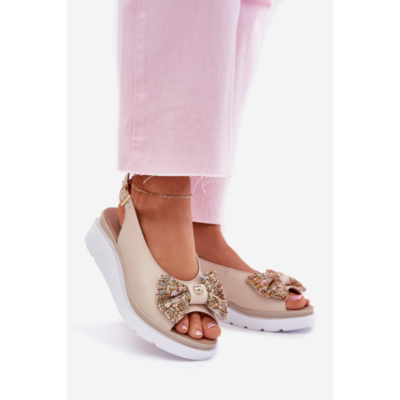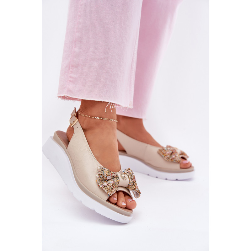 Moteriški sandalai iš natūralios odos, pastatyti ant platformos, yra elegantiška ir patogi pasirinkimo galimybė vasaros dienoms. Uždaryti su sagtimi ir reguliuojamu dirželiu, jie užtikrina tobulą prigludimą prie pėdos. Priekinėje dalyje yra mielas kaspinas su auksiniu akcentu, suteikiantis jiems subtilaus žavesio. Puikiai tinka suknelėms, sijonams ar kelnių, derindami komfortą su madingu įvaizdžiu. Idealiai tinka kasdieniams pasivaikščiojimams ir ypatingoms progoms. Renkantis dydį, vadovaukitės dydžių lentele.