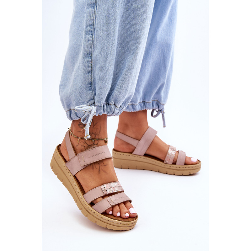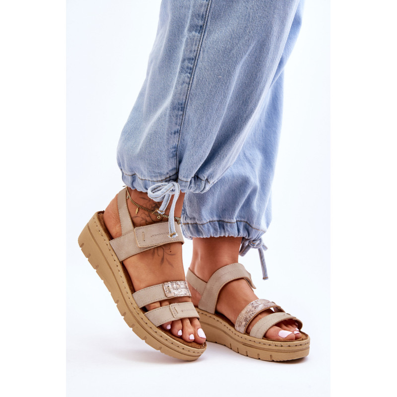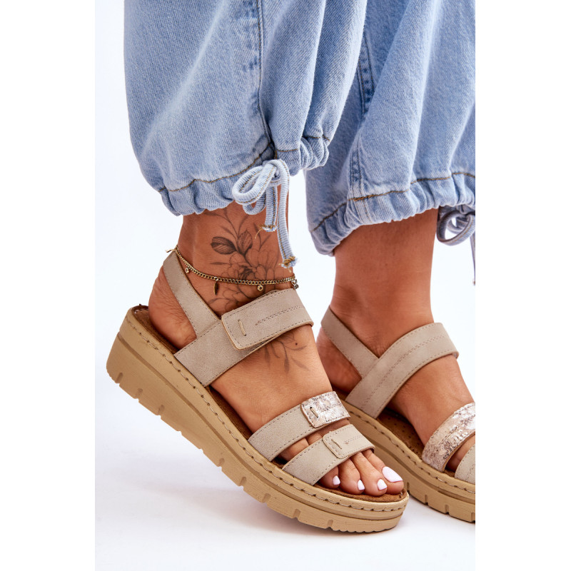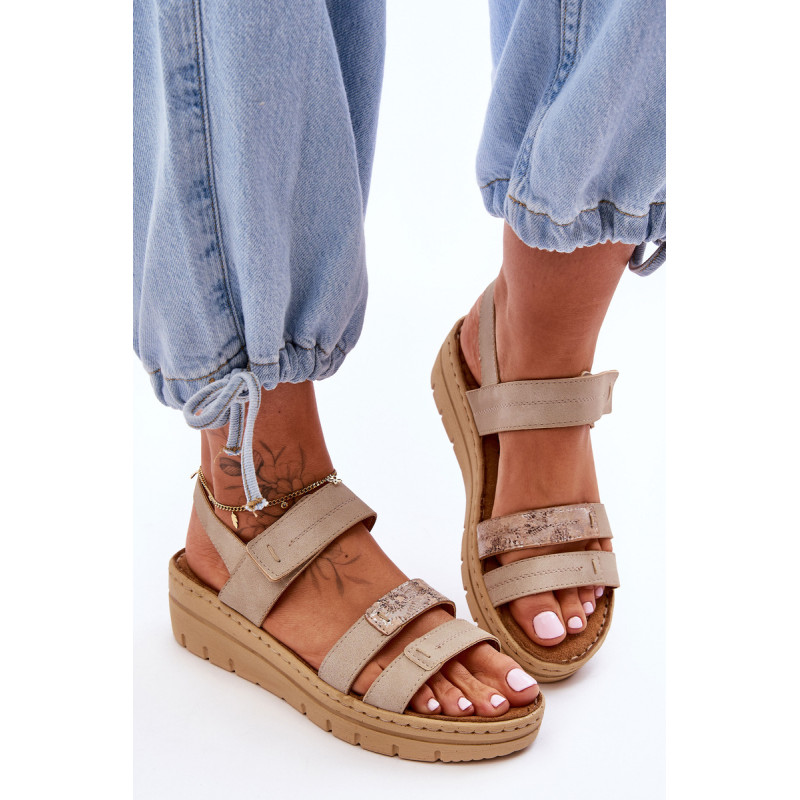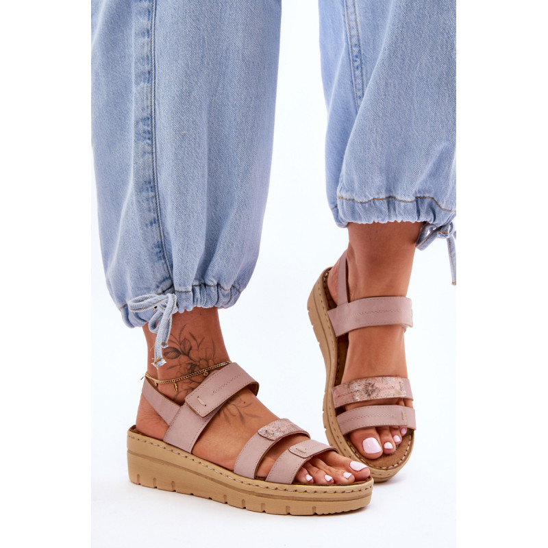 Klasikiniai moteriški sandalai yra pagaminti iš ekologiškos odos. Šis modelis buvo sumontuotas ant pleišto ir platformos. Minkštas vidpadis iš natūralios zomšos papildomai turi perforacijas. Puikus modelis karštoms dienoms. Sandalai turi Velcro užsegimą. Šis modelis turėtų būti jūsų! Rinkdamiesi dydį žiūrėkite dydžių lentelę.