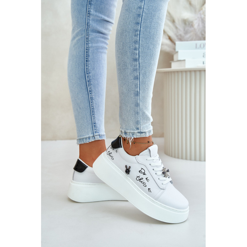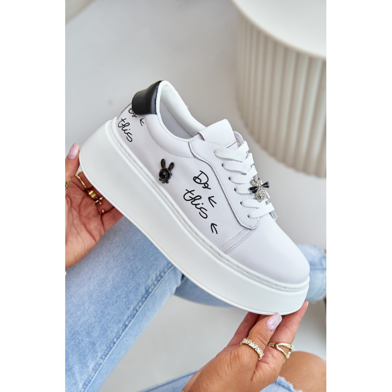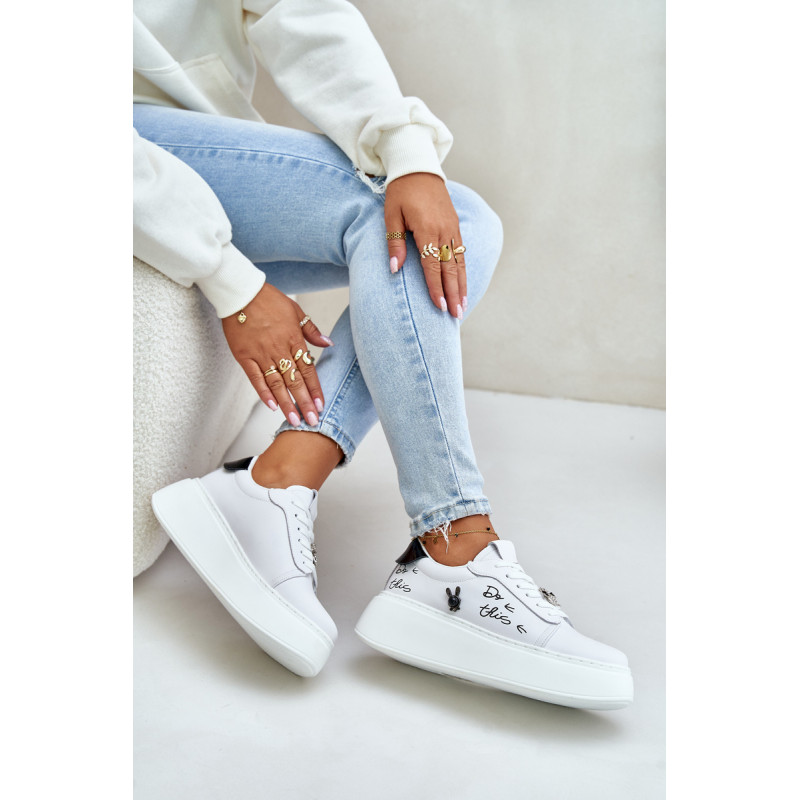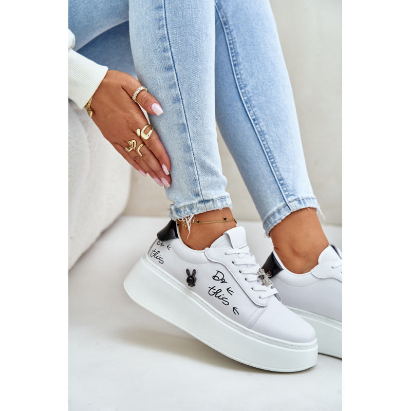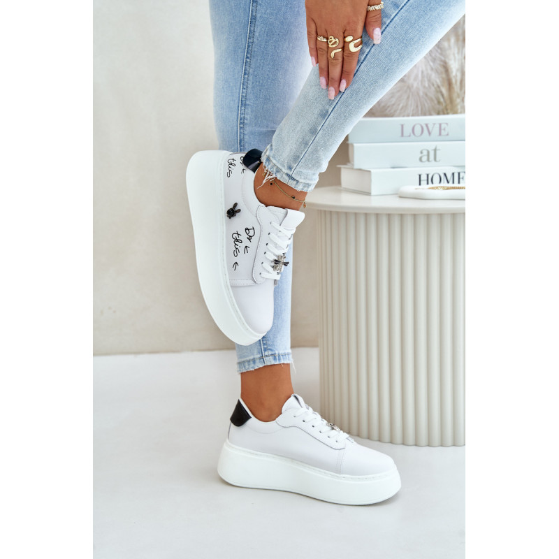 Moteriški sportbačiai iš natūralios odos yra stilinga ir patogi kasdienė avalynė. Šis ant platformos pritvirtintas modelis turi dekoratyvinį smeigtuką, kuris suteikia unikalumo. Ant viršaus yra užrašas, pabrėžiantis jų urbanistinį, madingą stilių. Puikiai tinka moterims, kurios vertina komfortą ir įspūdingą dizainą. Rinkdamiesi dydį, žiūrėkite dydžių lentelę.