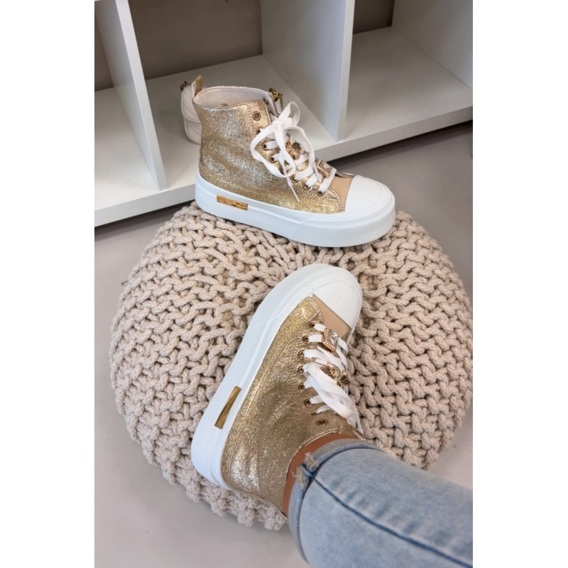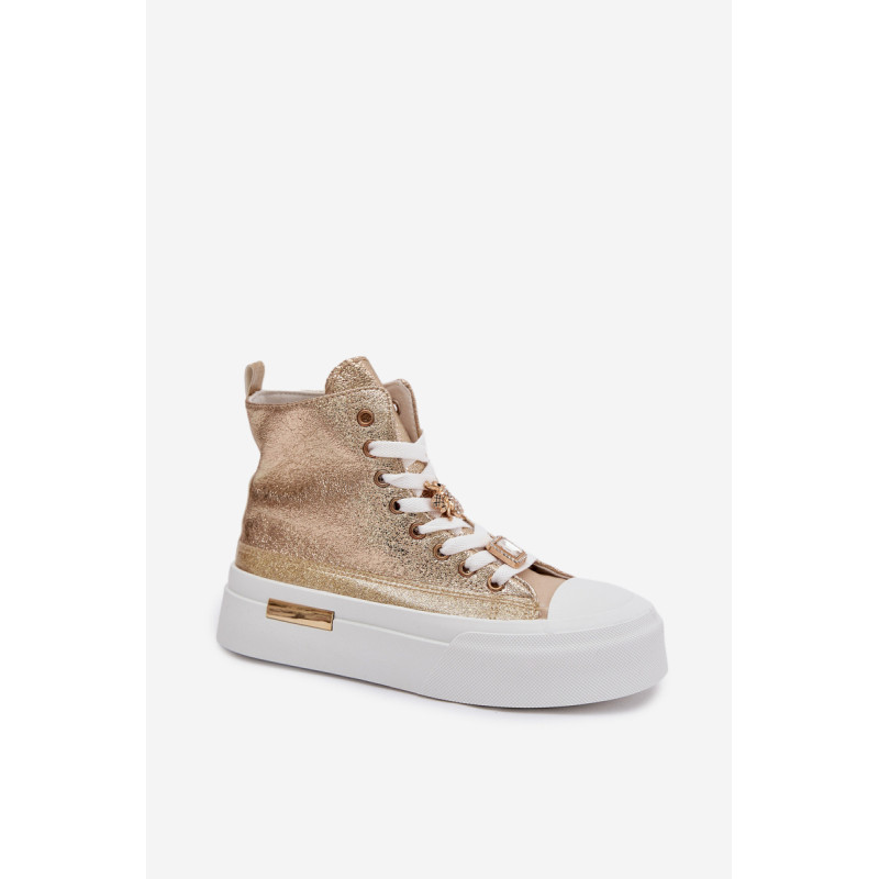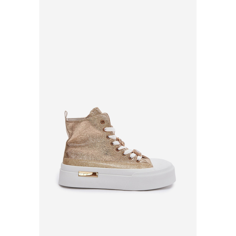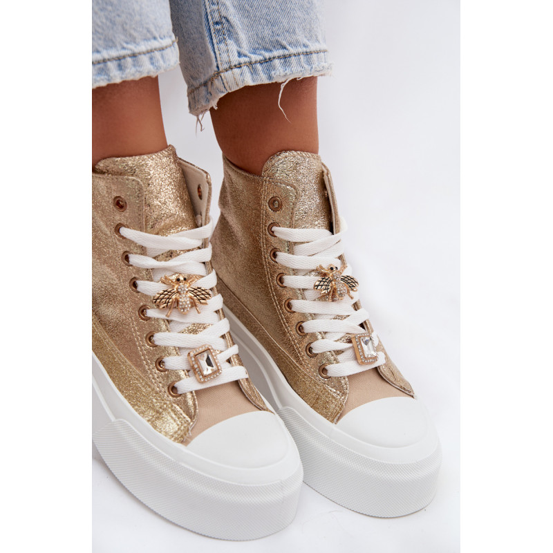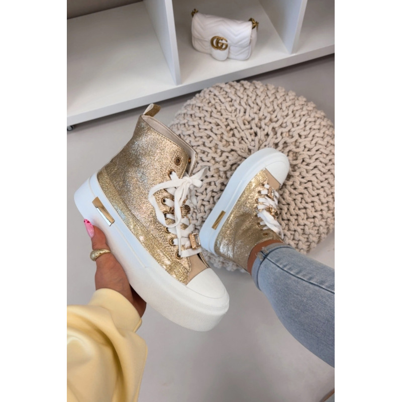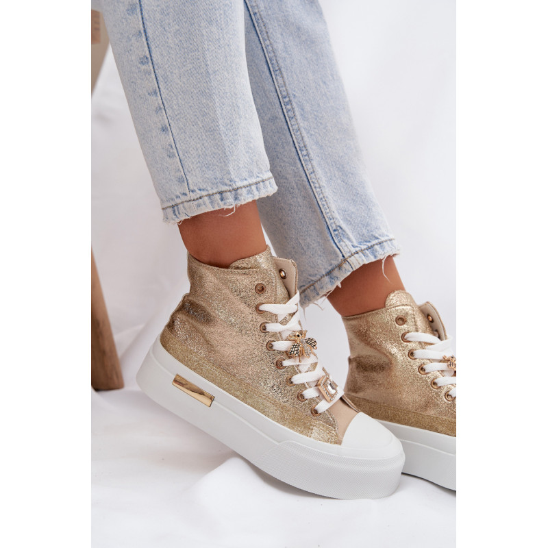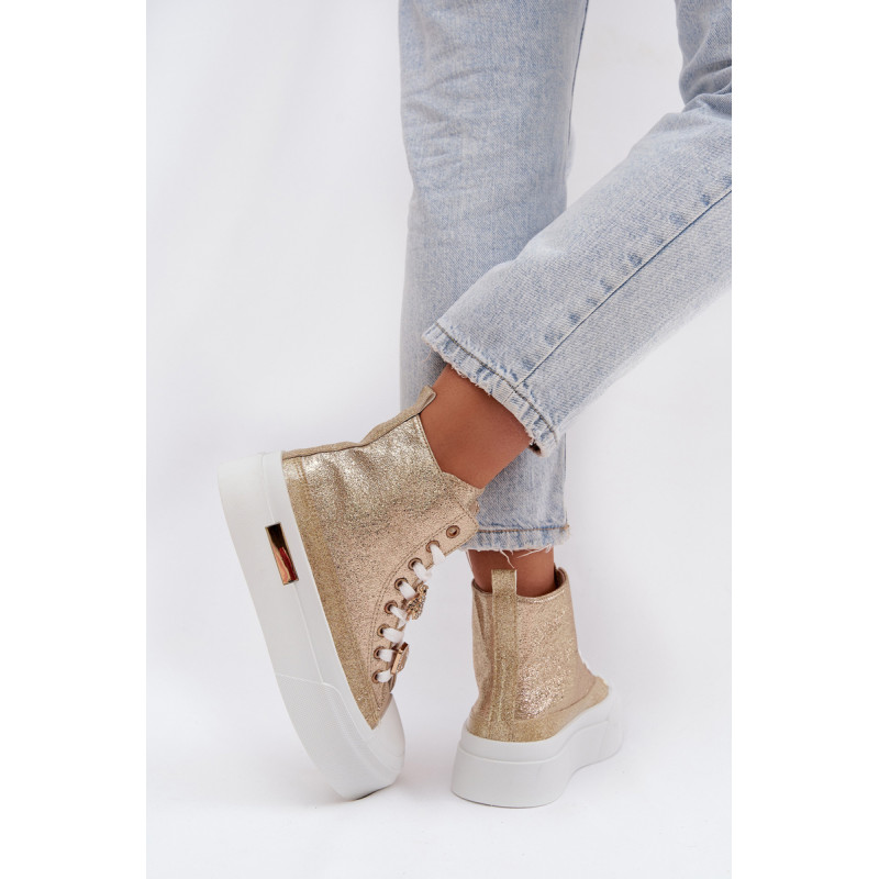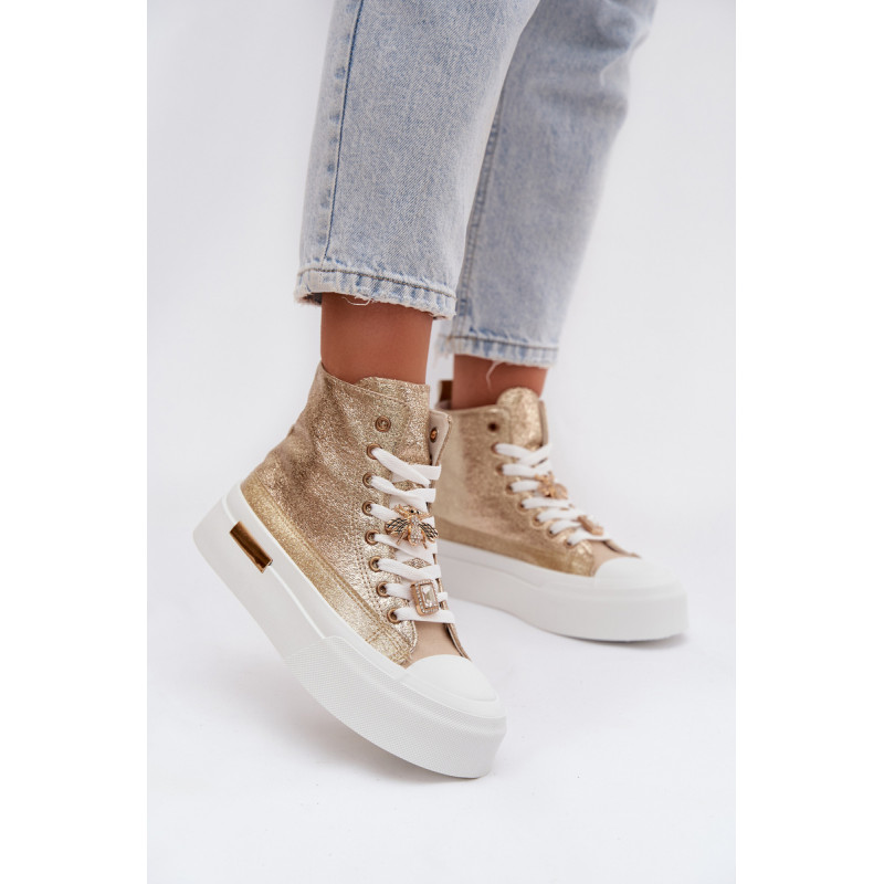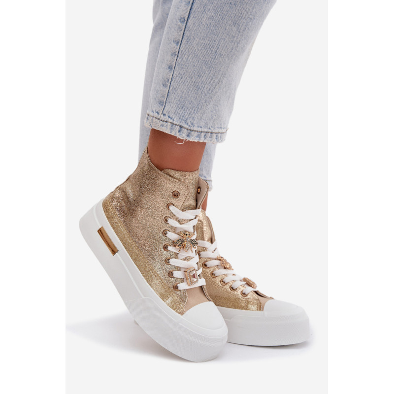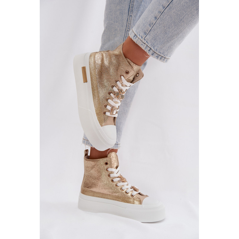 Moteriški sportiniai bateliai su masyviu platformu yra madingas pasirinkimas tiems, kurie mėgsta išraiškingą stilių. Stambus padas suteikia avalynei šiuolaikišką charakterį ir užtikrina patogumą, o auksinis elementas yra akį traukiančios detalės. Raištelių modelis garantuoja gerą pritaikymą prie pėdos, o dekoratyviniai segtukai suteikia originalumo ir madingo įvaizdžio. Šie bateliai puikiai tinka kasdienėms stiliams. Renkantis dydį, vadovaukitės dydžių lentele.
