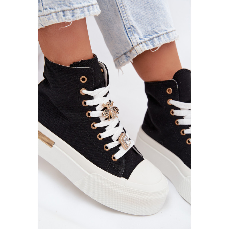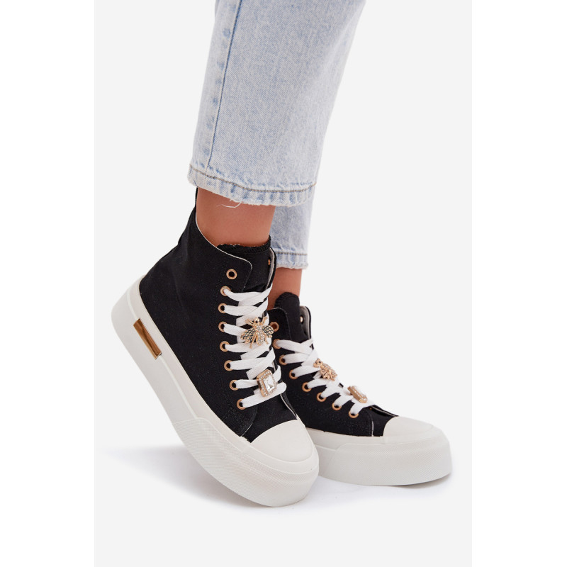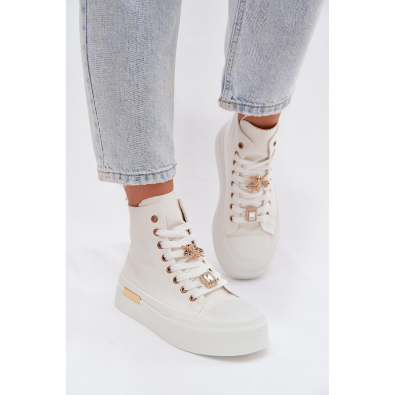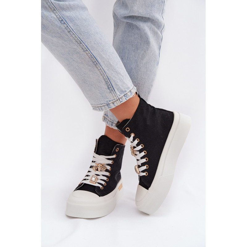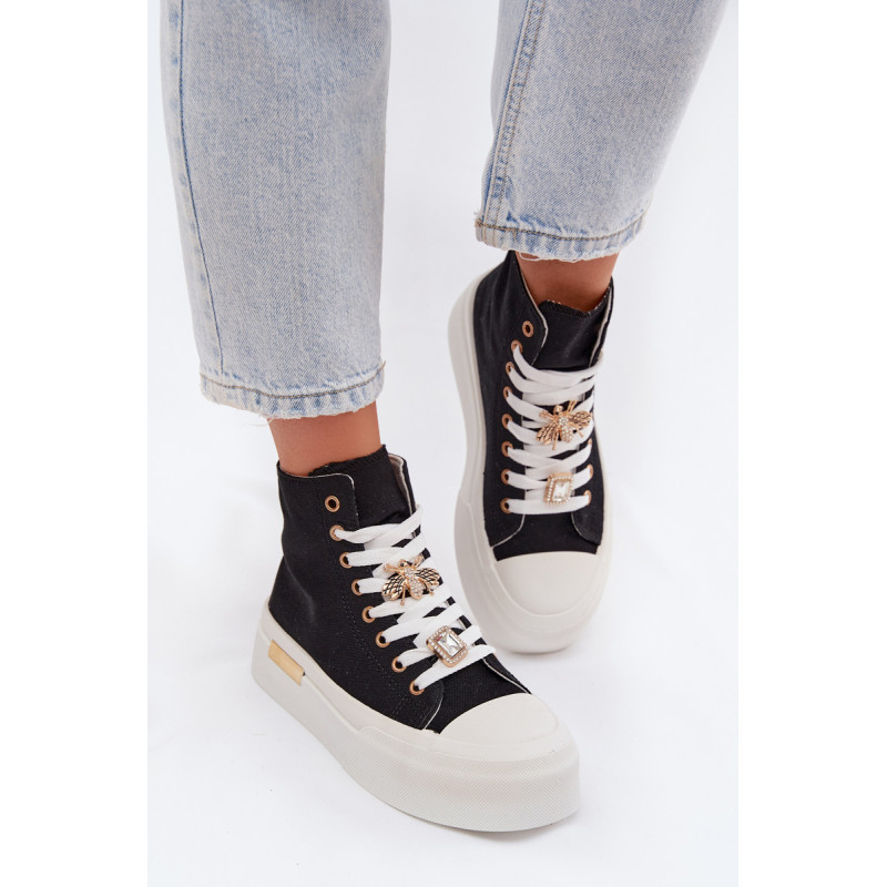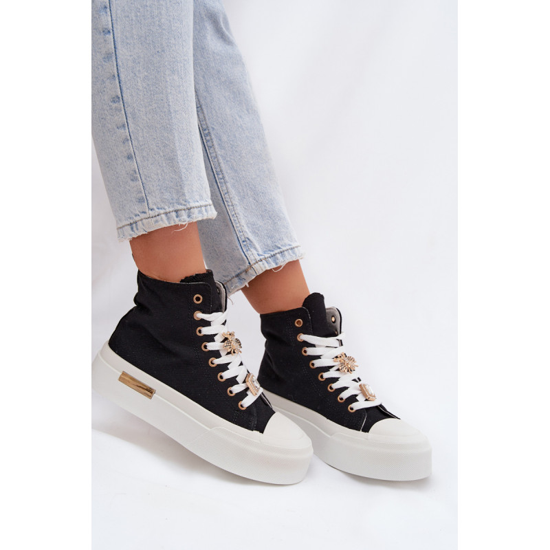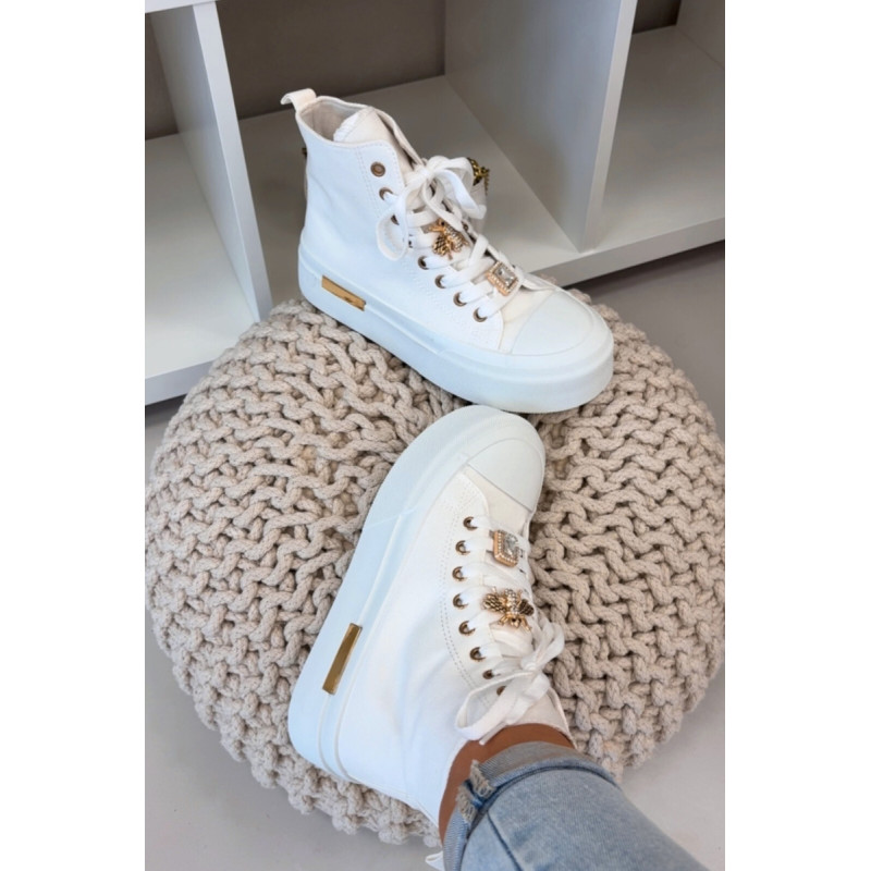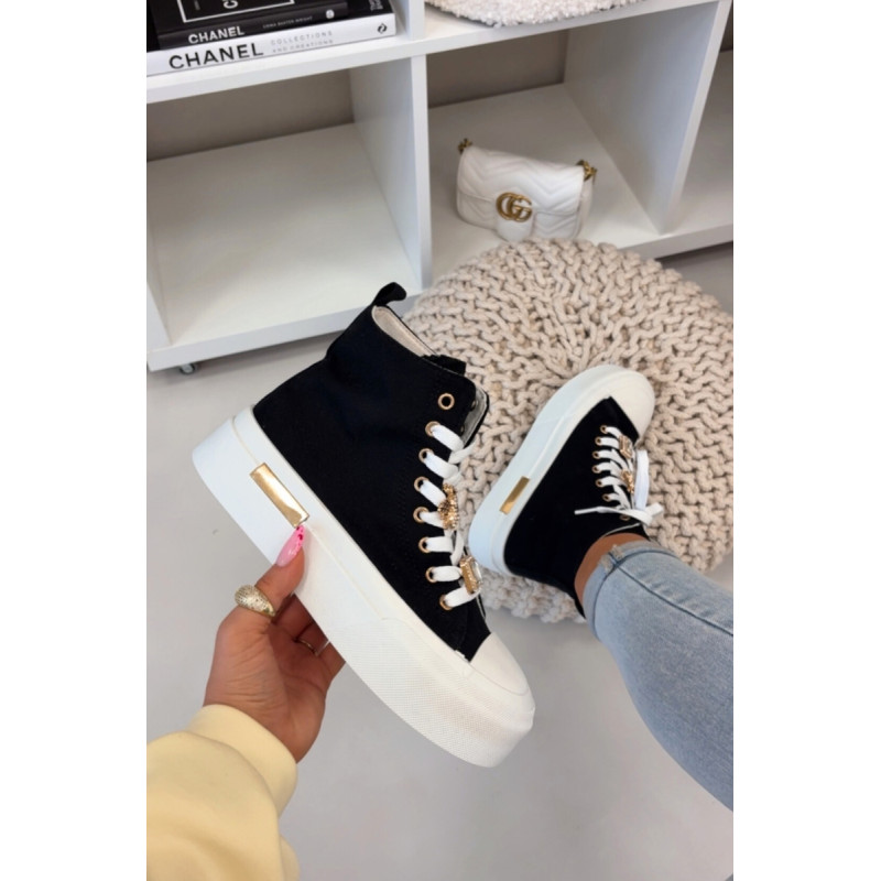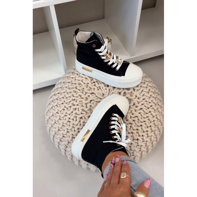 Moteriški sportiniai bateliai su masyviu platformu yra madingas pasirinkimas tiems, kurie mėgsta išraiškingą stilių. Stambus padas suteikia avalynei šiuolaikišką charakterį ir užtikrina patogumą, o auksinis elementas yra akį traukiančios detalės. Raištelių modelis garantuoja gerą pritaikymą prie pėdos, o dekoratyviniai segtukai suteikia originalumo ir madingo įvaizdžio. Šie bateliai puikiai tinka kasdienėms stiliams. Renkantis dydį, vadovaukitės dydžių lentele.