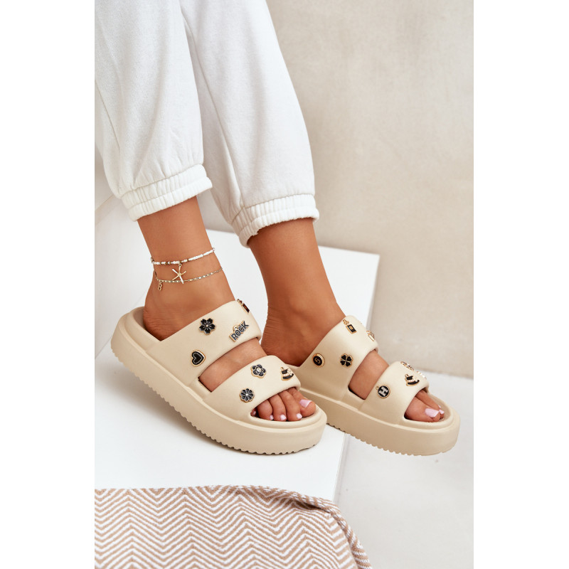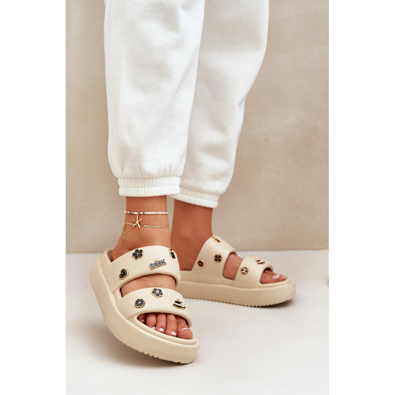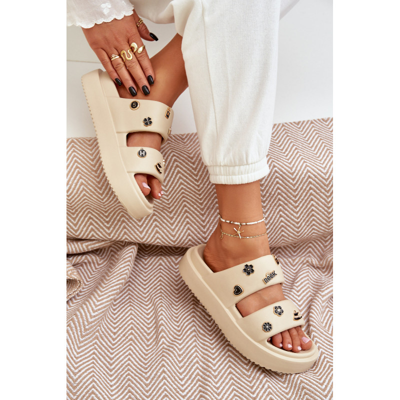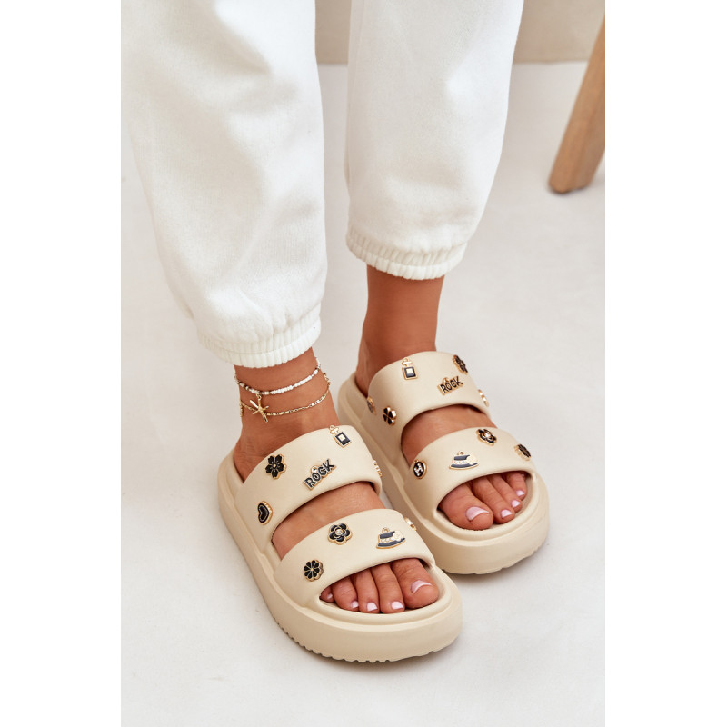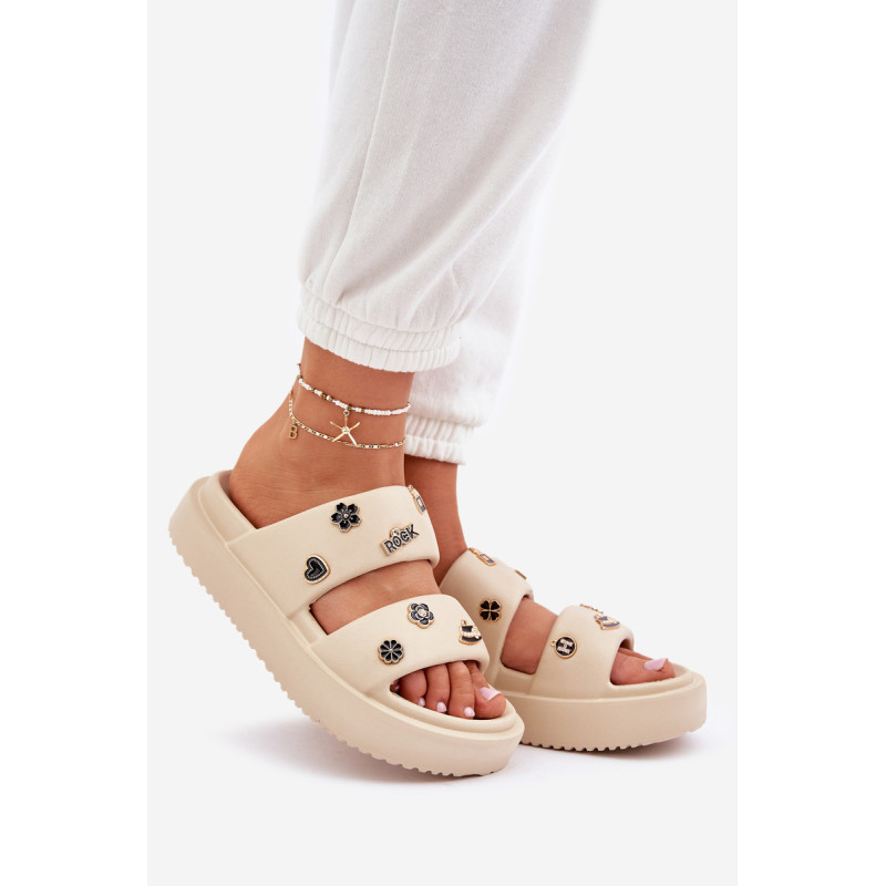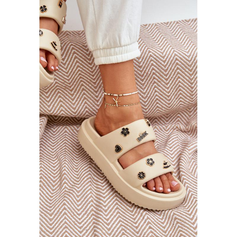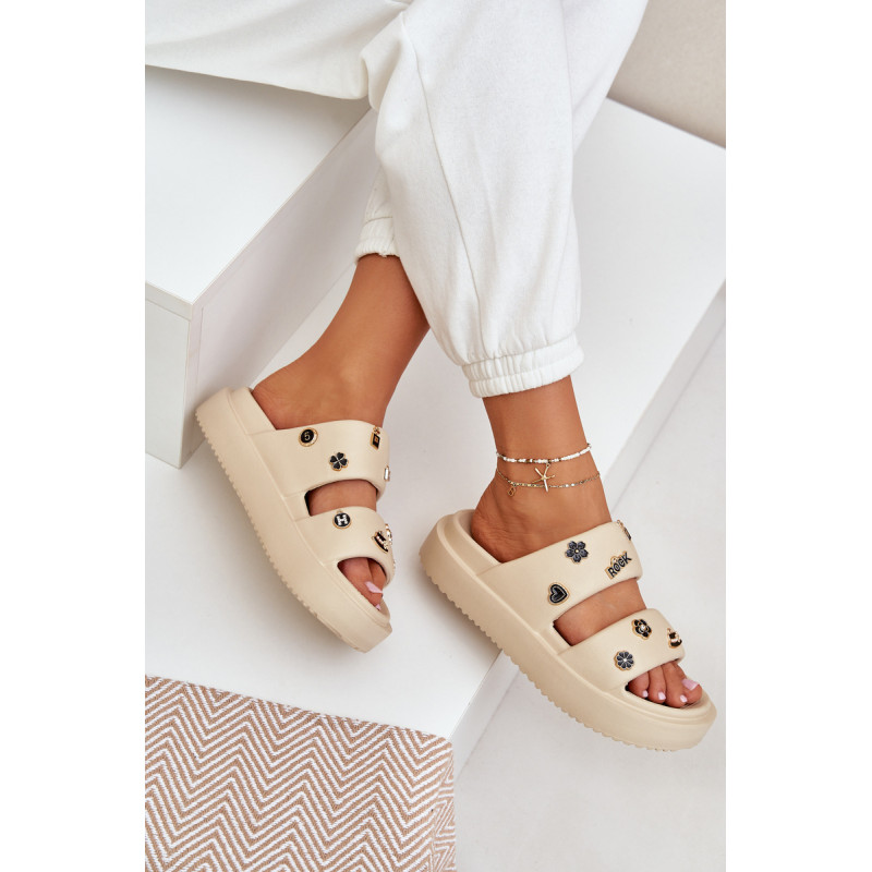 Moteriški šlepetės iš lengvos putos yra stilingas pasirinkimas kiekvienai moteriai. Platforma garantuoja komfortą ir stabilumą. Šlepetės dekoruotos detalėmis, kurios traukia dėmesį, puikiai derančiomis prie vasaros derinių, sujungiančių komfortą su madingu stiliumi. Renkantis dydį, vadovaukitės dydžių lentele.