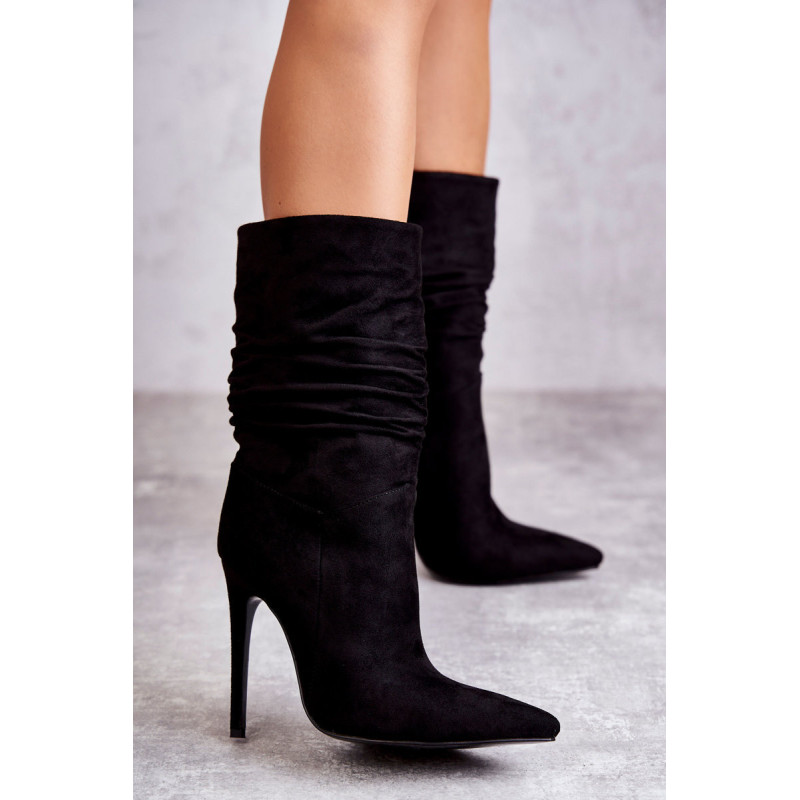 Gražūs moteriški batai yra pagaminti iš ekologiškos zomšos, malonios liesti. Jie turi subtilius raukinius viršutinėje dalyje ir standintą kulną. Smeigtuko formos aukštakulnių modelis ir smailus pirštas optiškai lieknina kojas. Batai - batai turi izoliaciją batų antklodės pavidalu. Nudžiuginkite visus savo stiliumi! Renkantis dydį, naudokite dydžių lentelę.