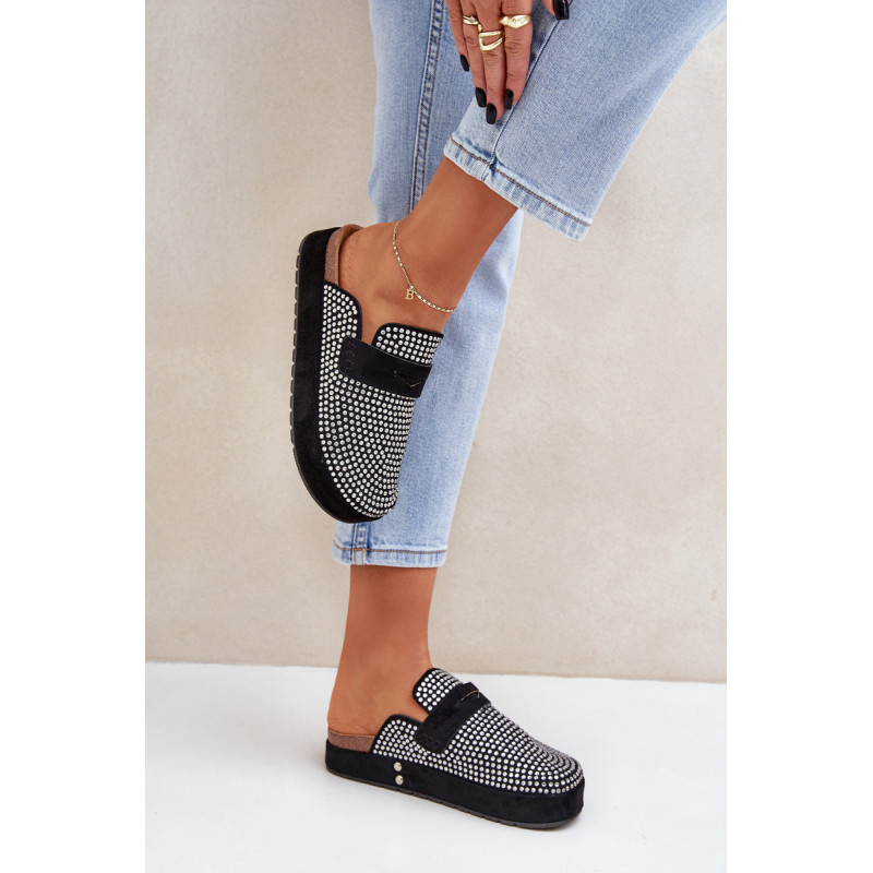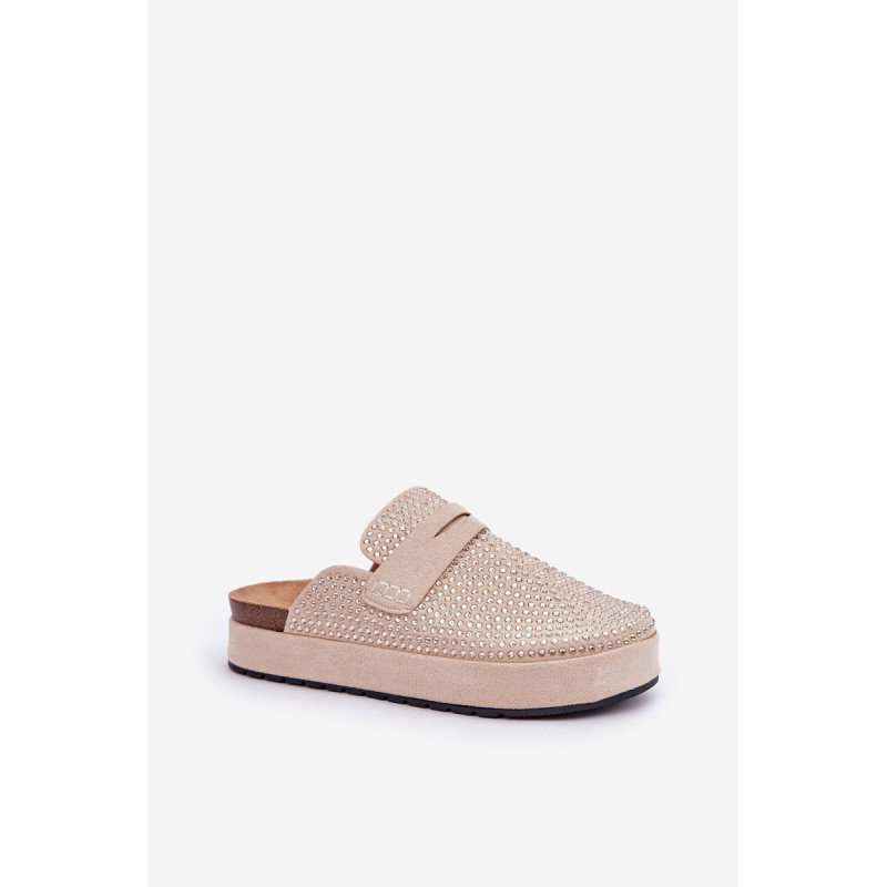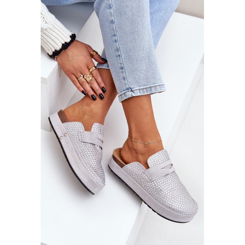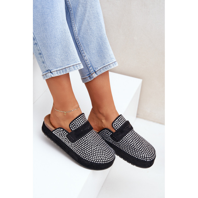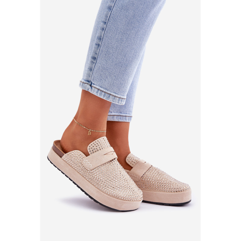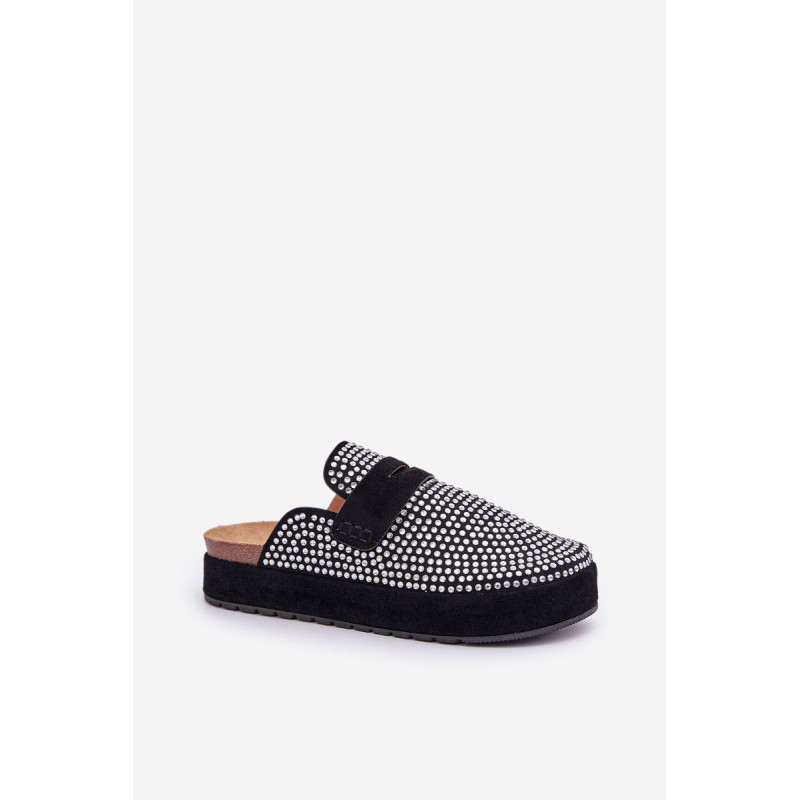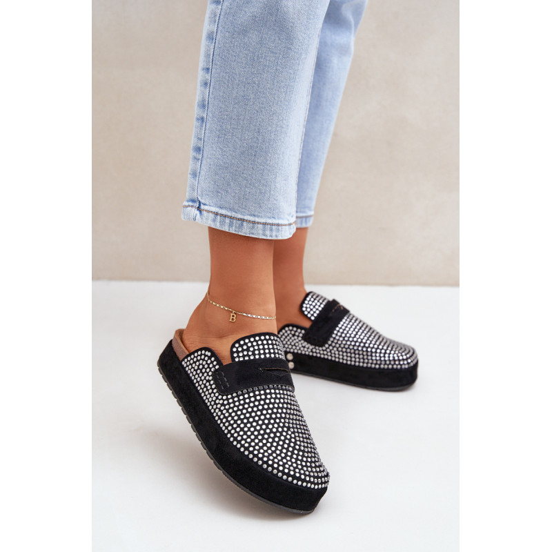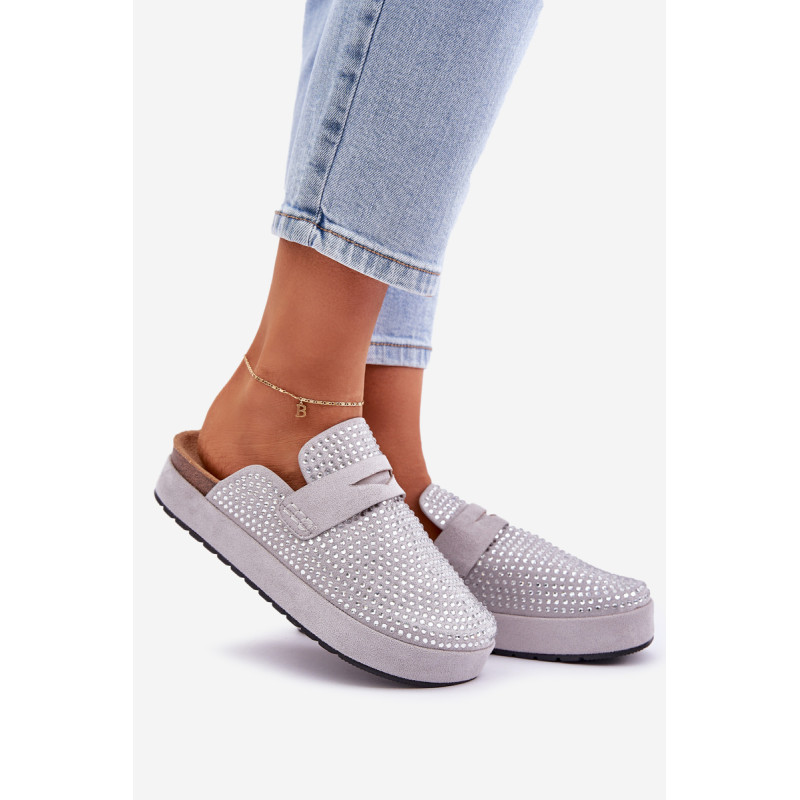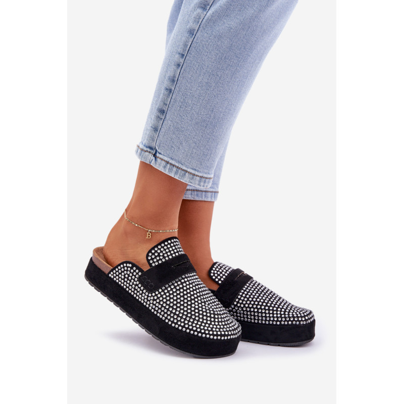Moteriški šlepetės iš ekologiško zomšo. Įrengti ant platformos. Šis modelis išsiskiria daugybe cirkonijų, kurie suteikia blizgesį kiekvienam stiliui. Uždaryti, apvalūs pirštai. Šiek tiek profiliuota vidpadis užtikrina komfortą. Stilingas modelis, kuris tikrai papildys daugelį vasaros stilių! Renkantis dydį, vadovaukitės dydžių lentele.
