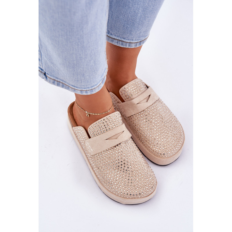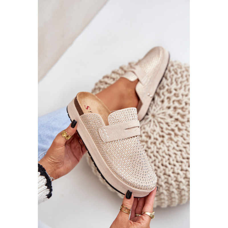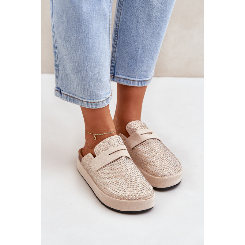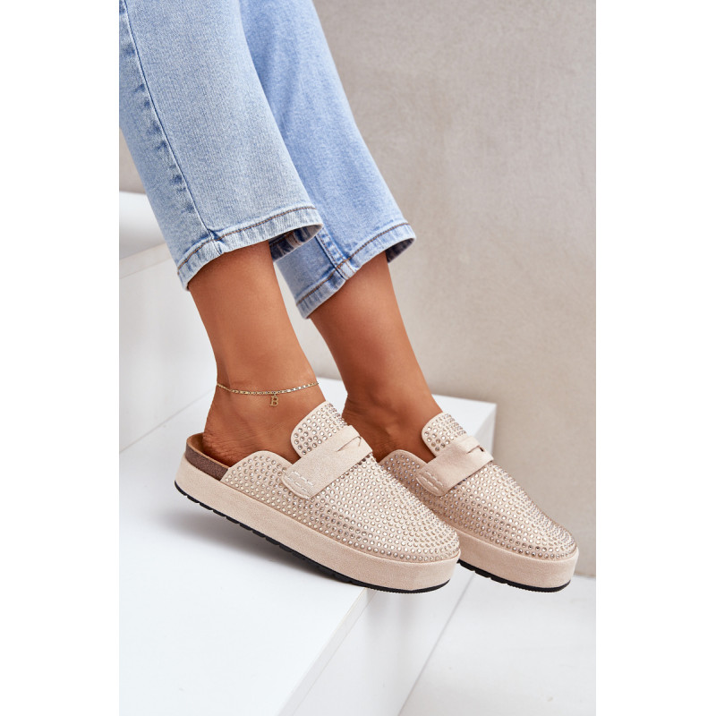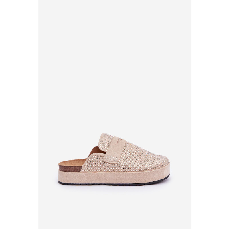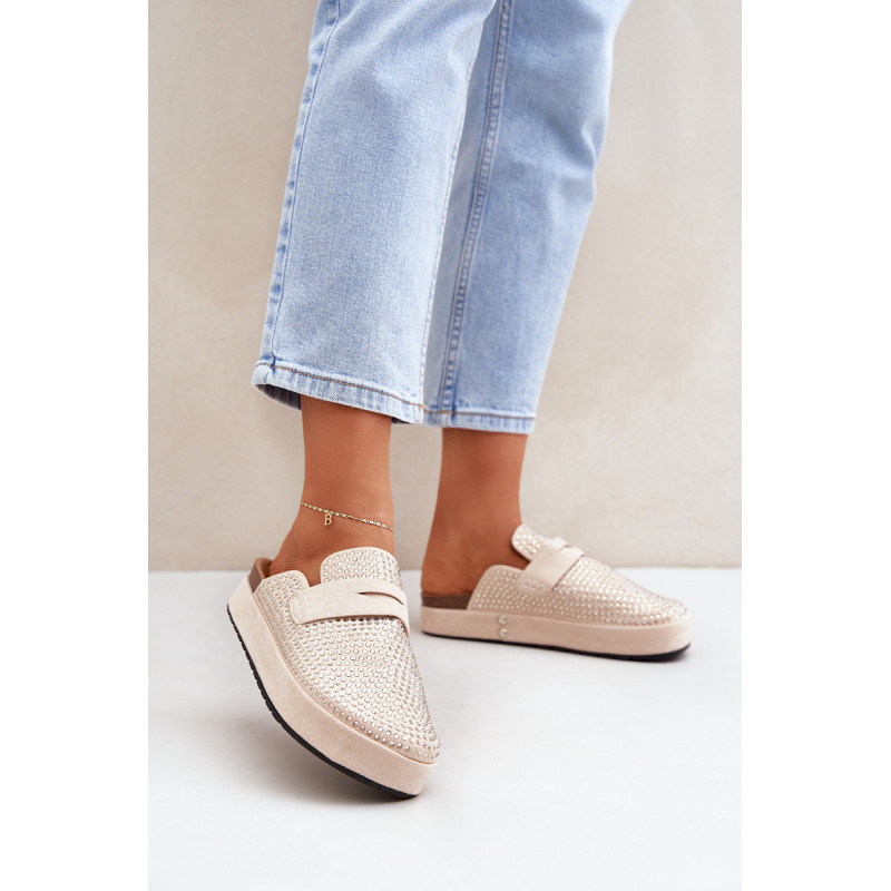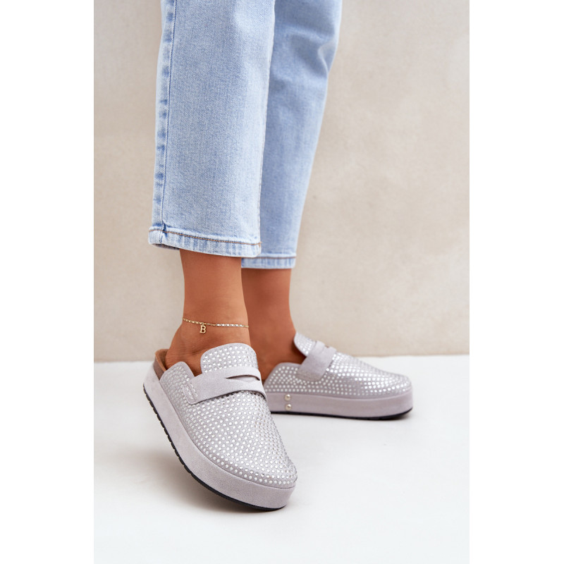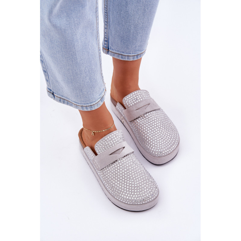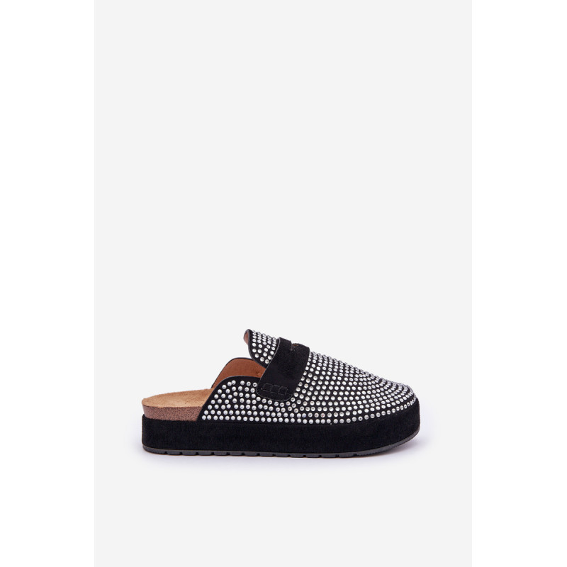 Moteriški šlepetės iš ekologiško zomšo. Įrengti ant platformos. Šis modelis išsiskiria daugybe cirkonijų, kurie suteikia blizgesį kiekvienam stiliui. Uždaryti, apvalūs pirštai. Šiek tiek profiliuota vidpadis užtikrina komfortą. Stilingas modelis, kuris tikrai papildys daugelį vasaros stilių! Renkantis dydį, vadovaukitės dydžių lentele.