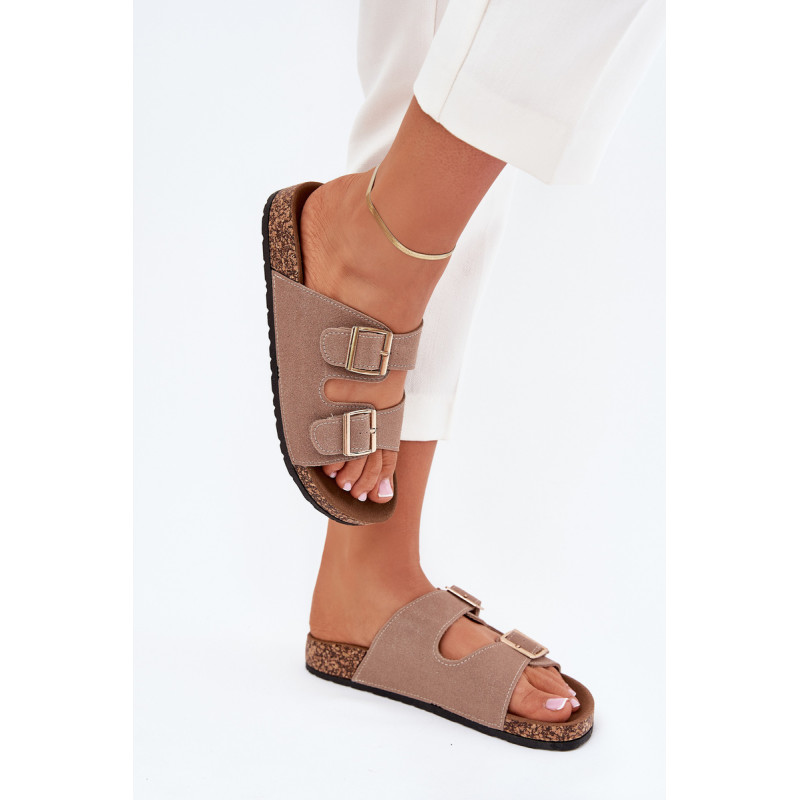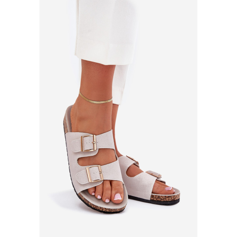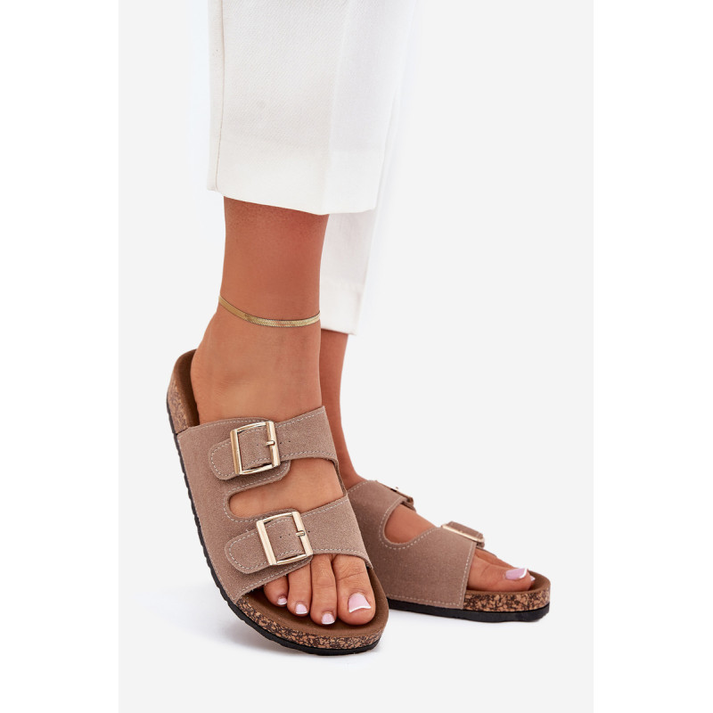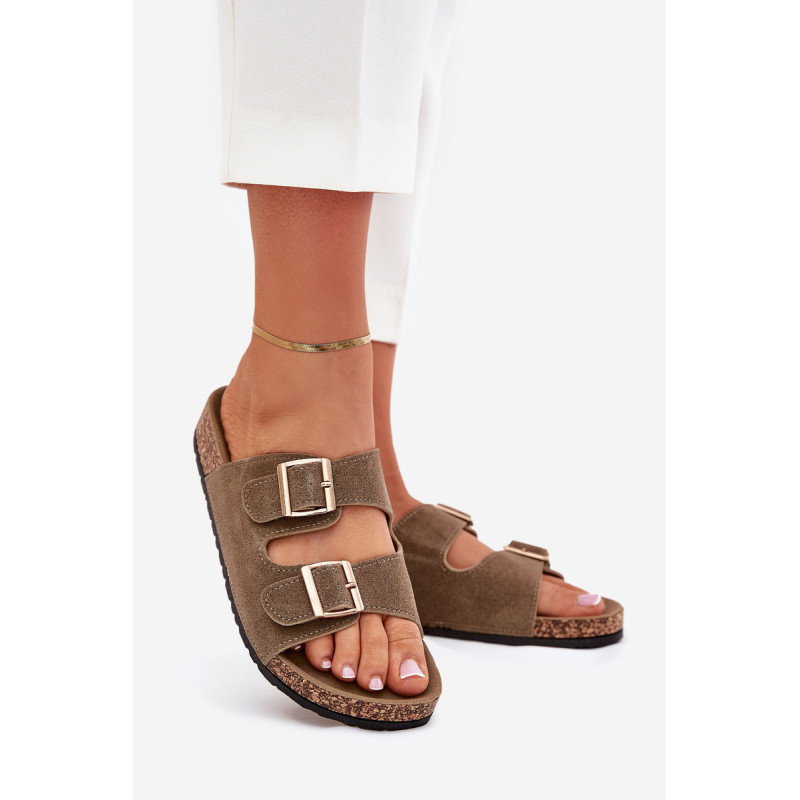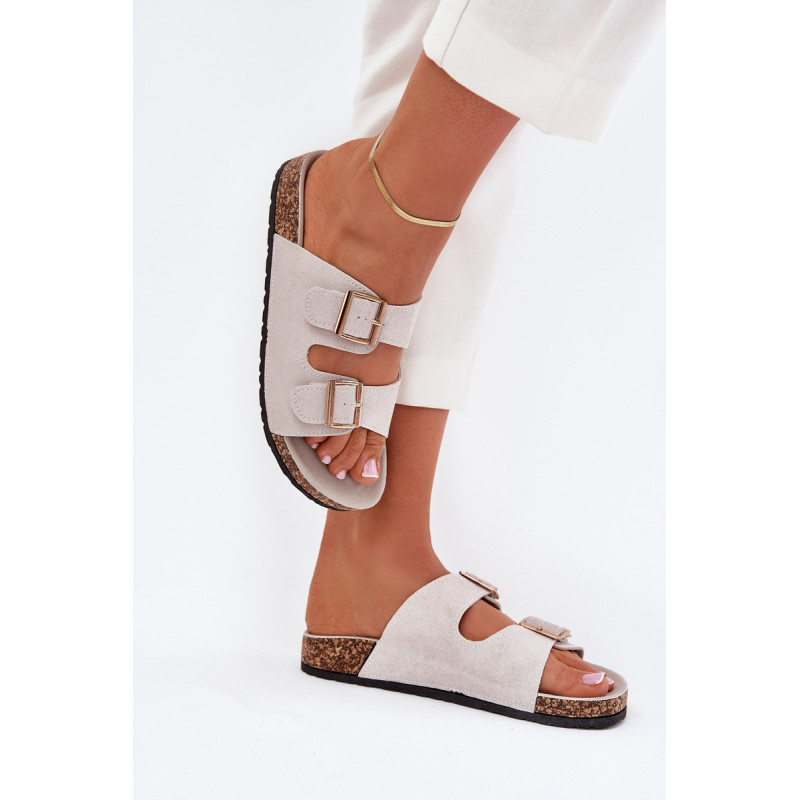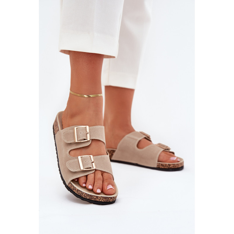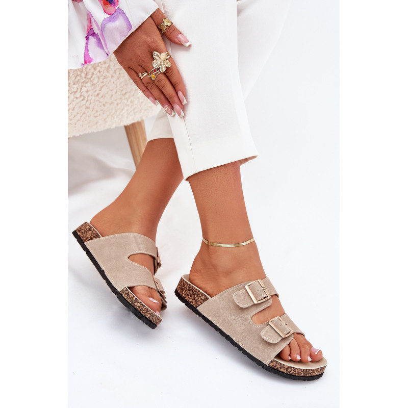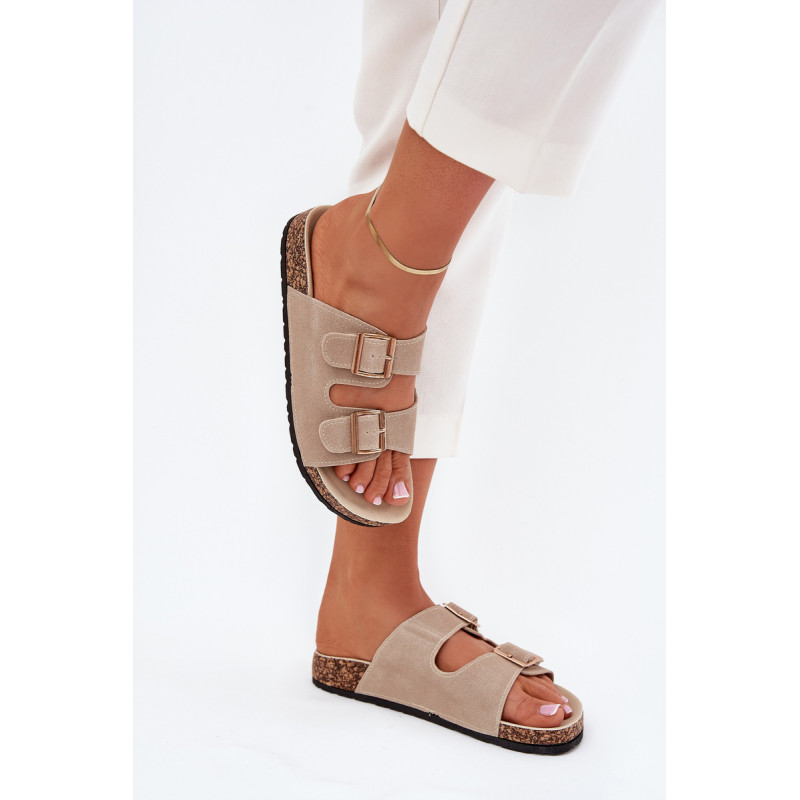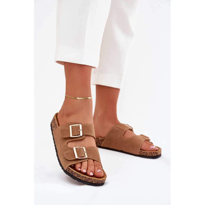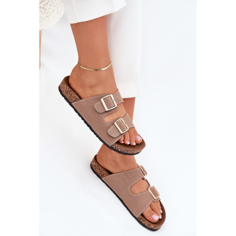 Moteriškos šlepetės iš ekosuede, įrengtos ant kamštienos platformos, yra stiliaus ir komforto derinys. Dvi auksinės sagties su reguliuojamomis juostelėmis leidžia puikiai pritaikyti prie kojos, o profiliuota vidpadis užtikrina komfortą visą dieną. Idealiai tinka vasaros stiliams, puikiai derinamos su suknelėmis, sijonais ar šortais. Renkantis dydį, vadovaukitės dydžių lentele.