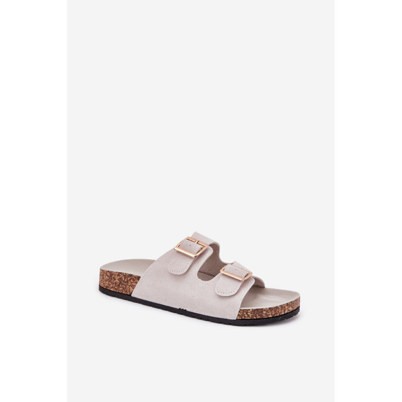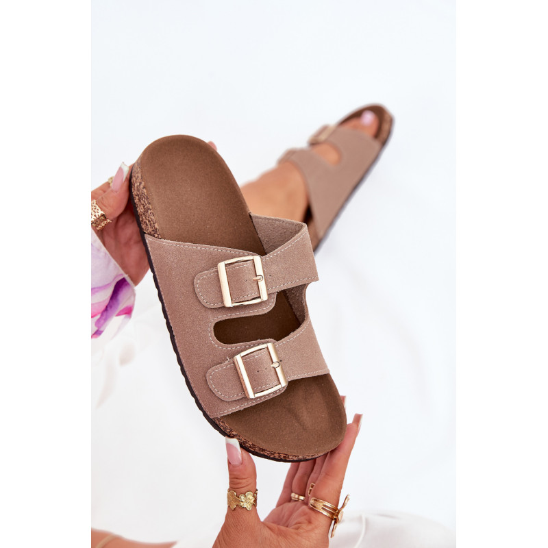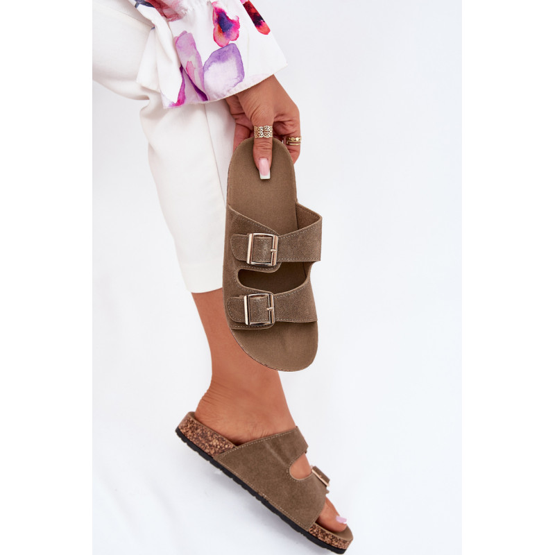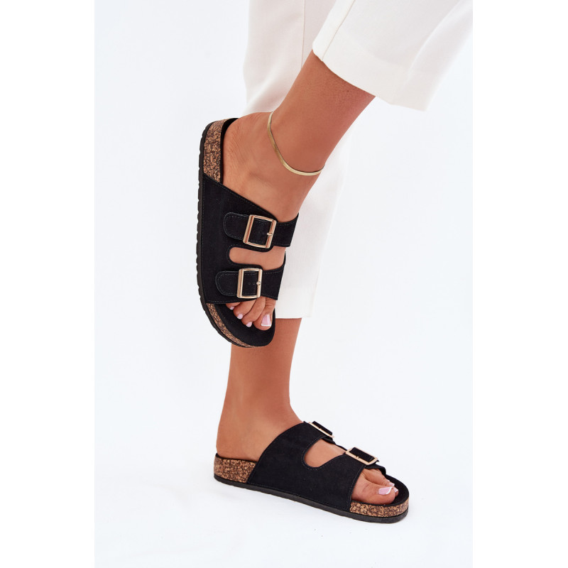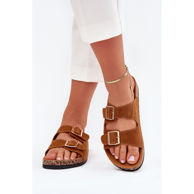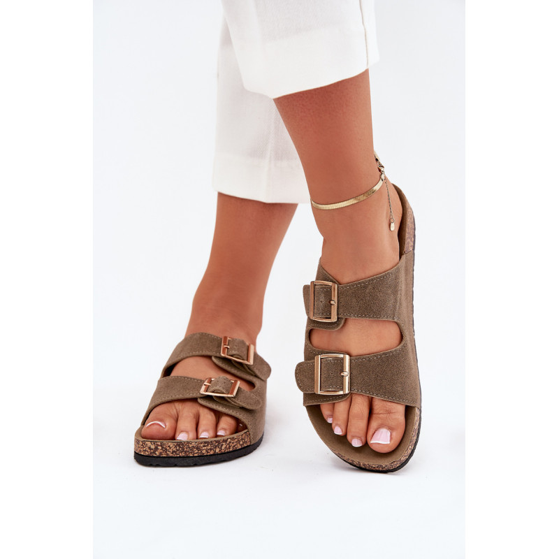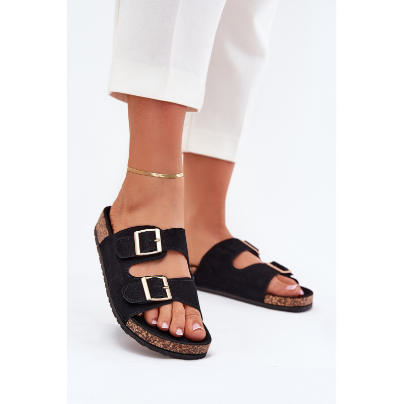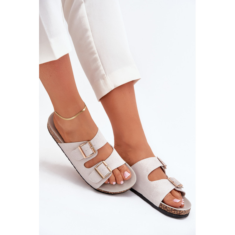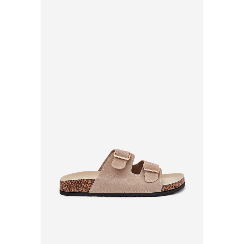 Moteriškos šlepetės iš ekosuede, įrengtos ant kamštienos platformos, yra stiliaus ir komforto derinys. Dvi auksinės sagties su reguliuojamomis juostelėmis leidžia puikiai pritaikyti prie kojos, o profiliuota vidpadis užtikrina komfortą visą dieną. Idealiai tinka vasaros stiliams, puikiai derinamos su suknelėmis, sijonais ar šortais. Renkantis dydį, vadovaukitės dydžių lentele.