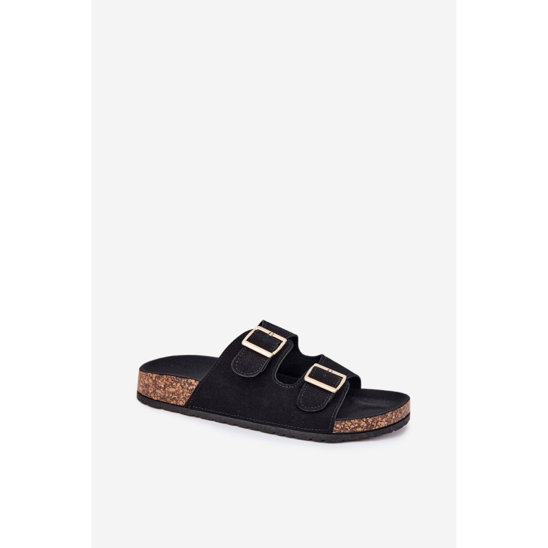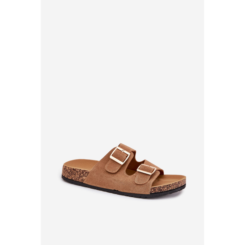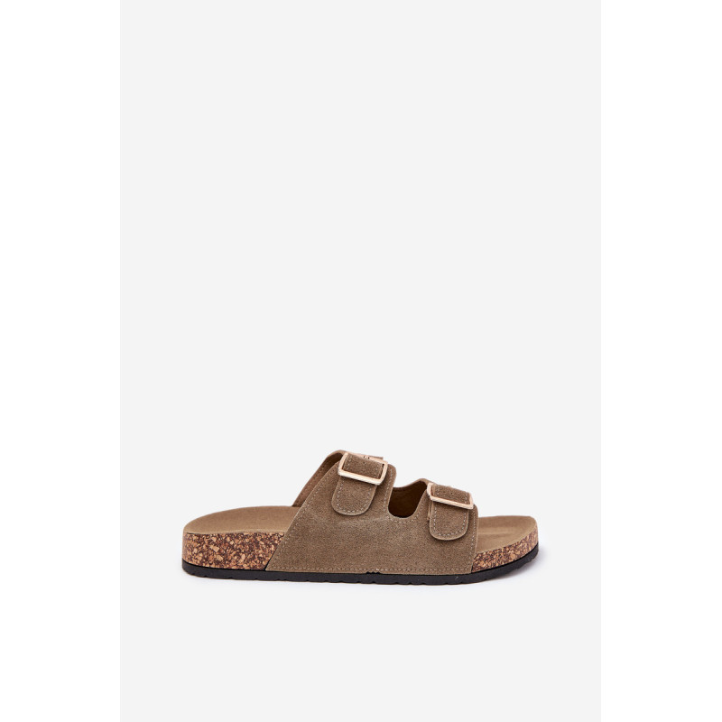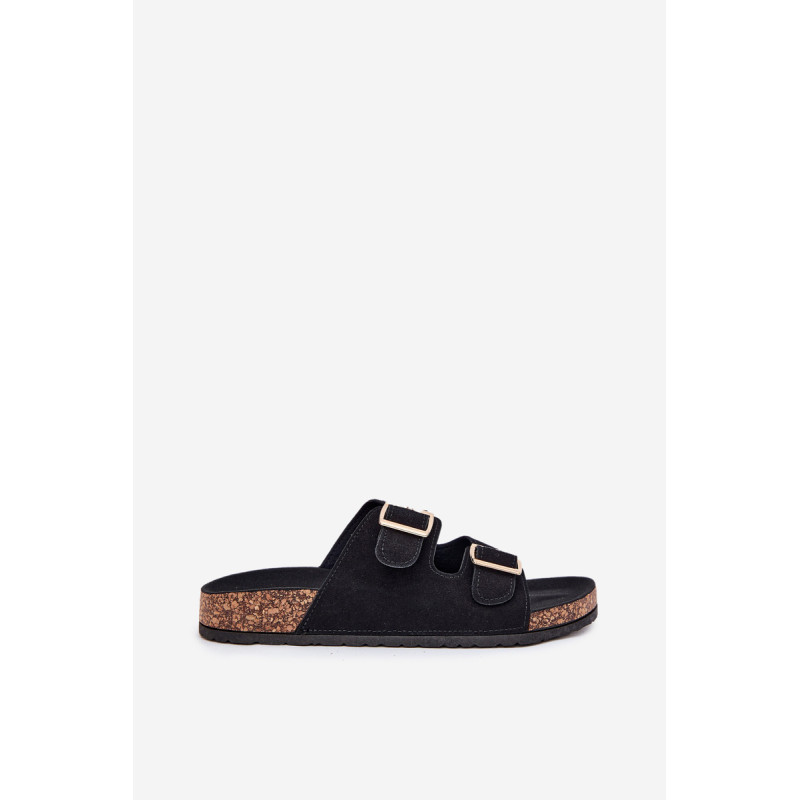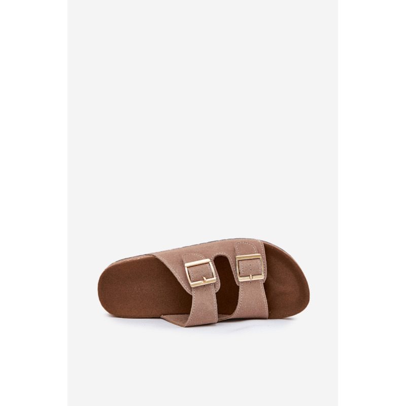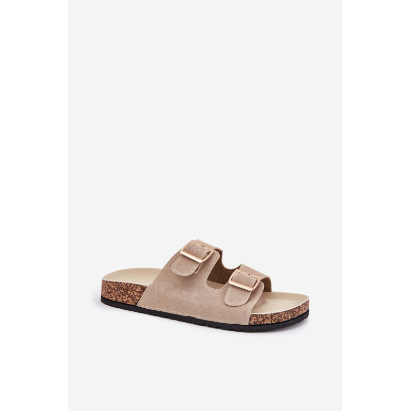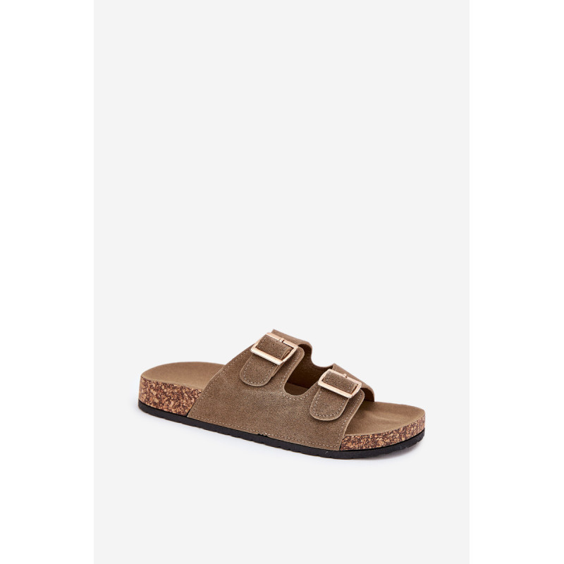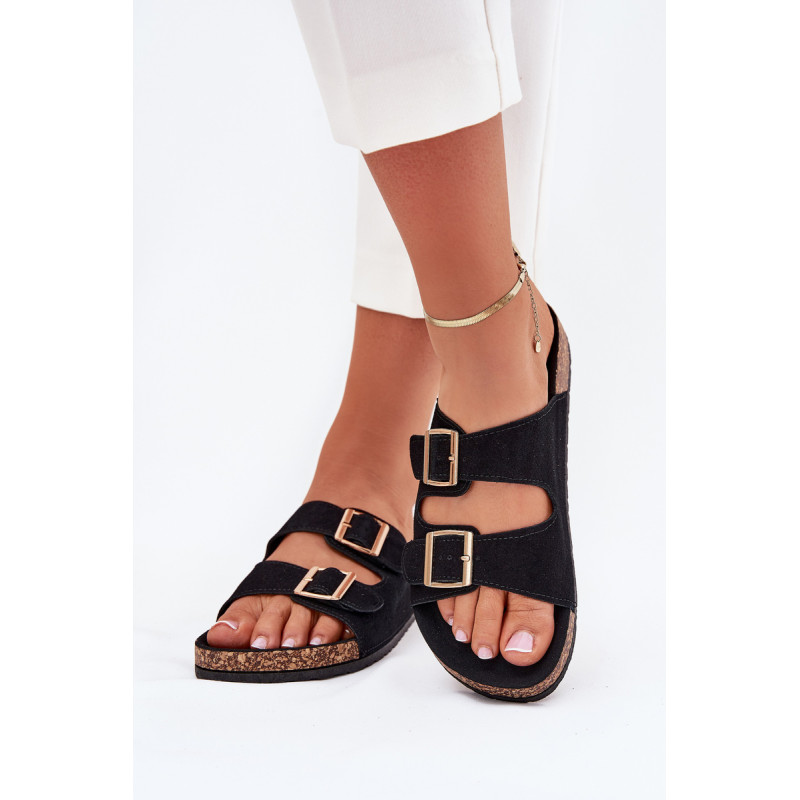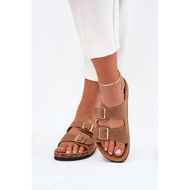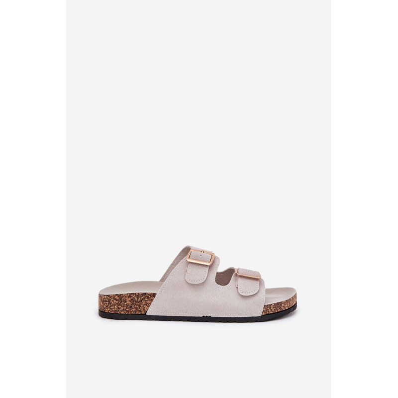 Moteriškos šlepetės iš ekosuede, įrengtos ant kamštienos platformos, yra stiliaus ir komforto derinys. Dvi auksinės sagties su reguliuojamomis juostelėmis leidžia puikiai pritaikyti prie kojos, o profiliuota vidpadis užtikrina komfortą visą dieną. Idealiai tinka vasaros stiliams, puikiai derinamos su suknelėmis, sijonais ar šortais. Renkantis dydį, vadovaukitės dydžių lentele.