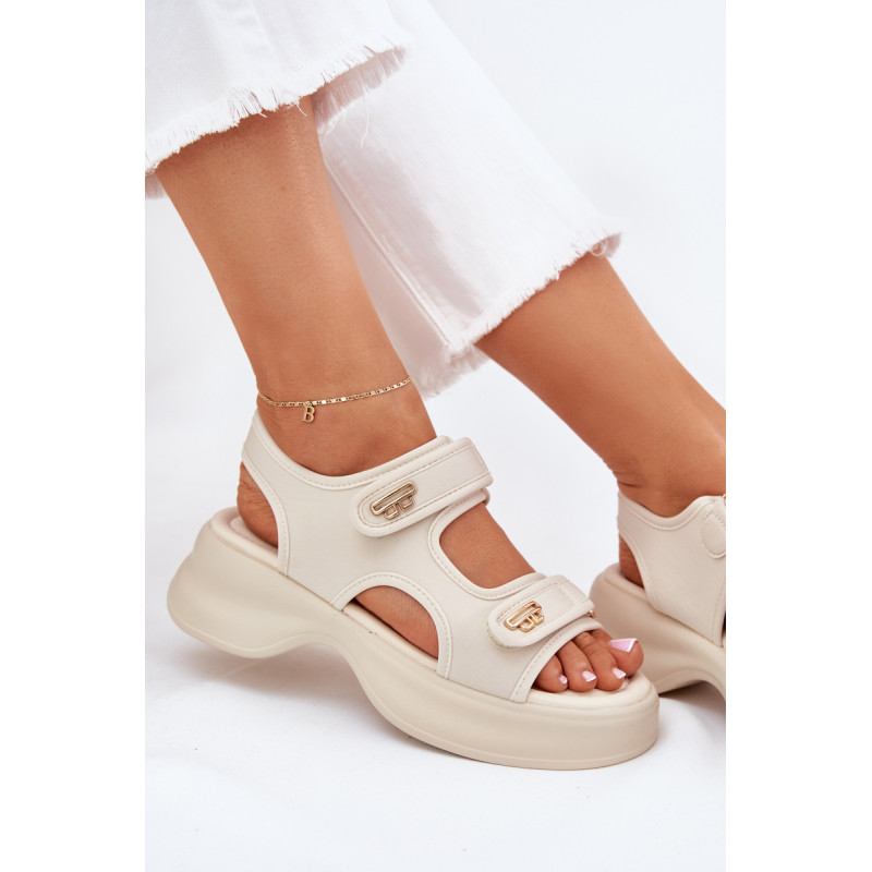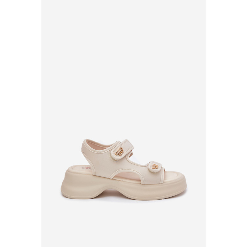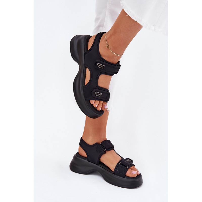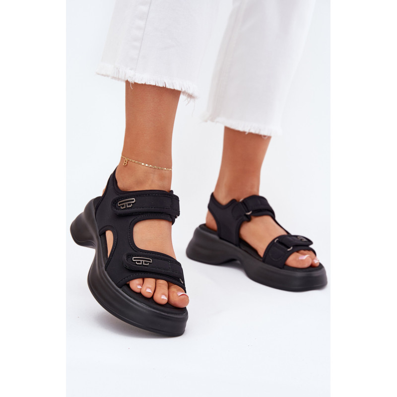 Moteriški sandalai, pagaminti iš tekstilės medžiagos, ant platformos, yra komforto ir stiliaus derinys. Uždaryti dvigubu lipduku, jie užtikrina lengvą pritaikymą pėdai, o du auksiniai akcentai suteikia jiems elegantišką charakterį. Minkšta padas užtikrina komfortą visą dieną. Puikiai tinka kasdieniams įvaizdžiams, jie sujungia funkcionalumą su madingu vaizdu. Renkantis dydį, vadovaukitės dydžių lentele.