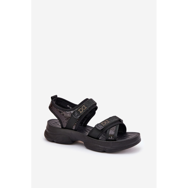 Stilingi moteriški sandalai, pagaminti iš tekstilinės medžiagos. Papuošti blizgučiais, kurie suteikia jiems unikalų blizgesį. Uždaryti su Velcro, kas užtikrina lengvą ir greitą prisitaikymą prie pėdos. Puikiai tinka vasaros dienoms, šie sandalai sujungia komfortą su madingu, blizgiu akcentu, puikiai derančiu su suknelėmis, sijonais ar šortais. Renkantis dydį, vadovaukitės dydžių lentele.