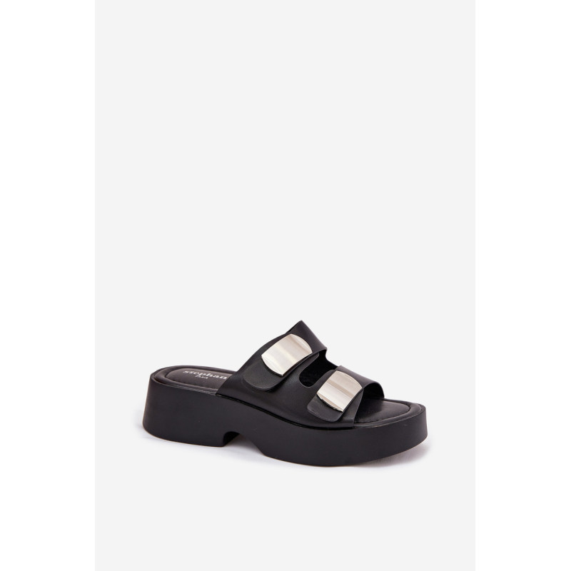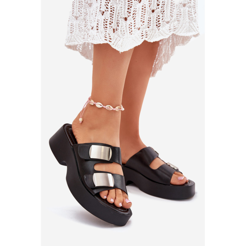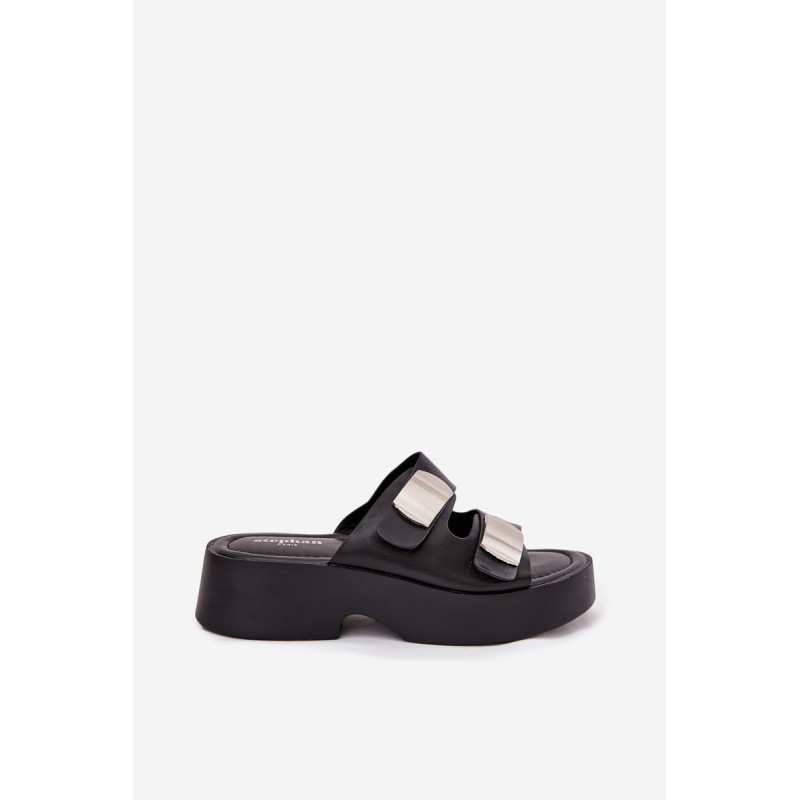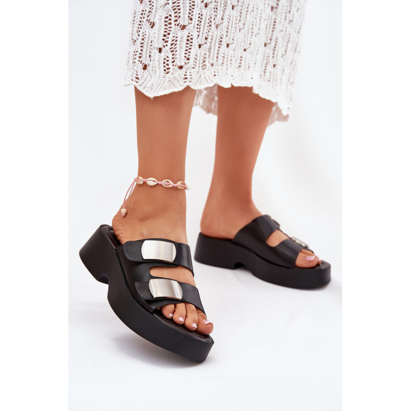 Moteriški sandalai, pagaminti iš eko odos, ant platformos ir plokščiu kulnu, yra klasikinis ir patogus pasirinkimas kasdienai. Modelis turi dvi juostas su sidabriniais elementais. Minkšta padas padidina komfortą. Puikiai tinka įvairiems stiliams, jie jungia paprastumą su elegancija, idealiai tinka šiltoms dienoms. Renkantis dydį, vadovaukitės dydžių lentele.