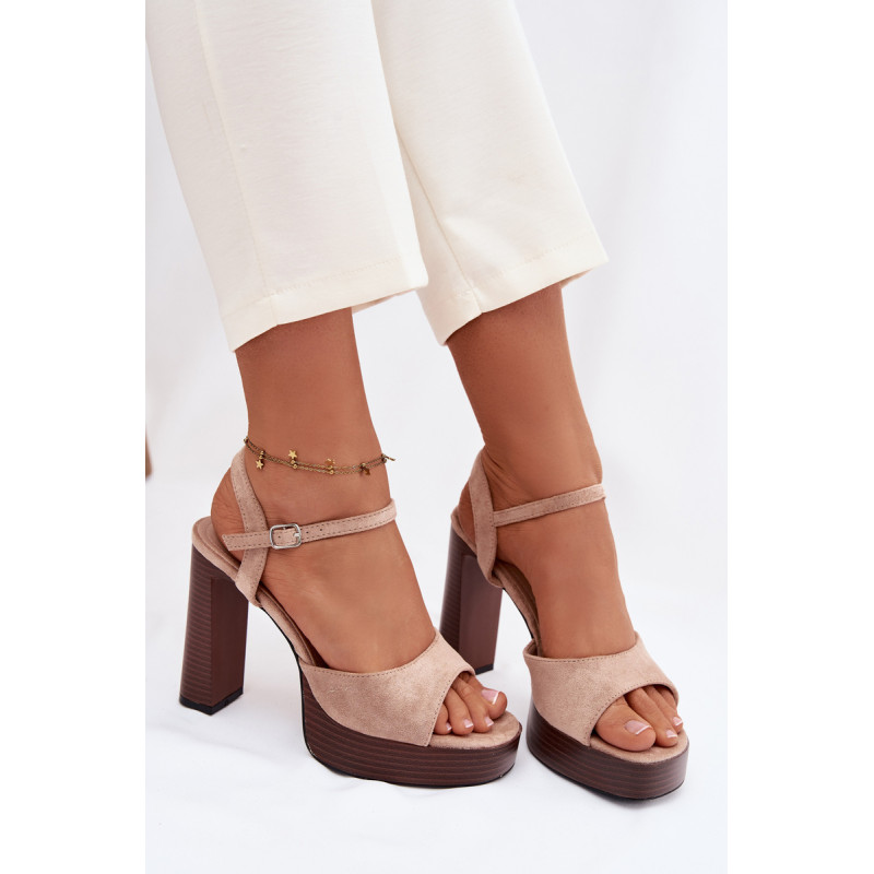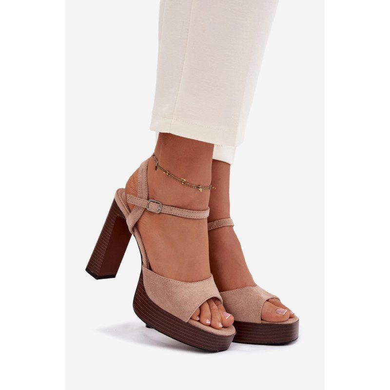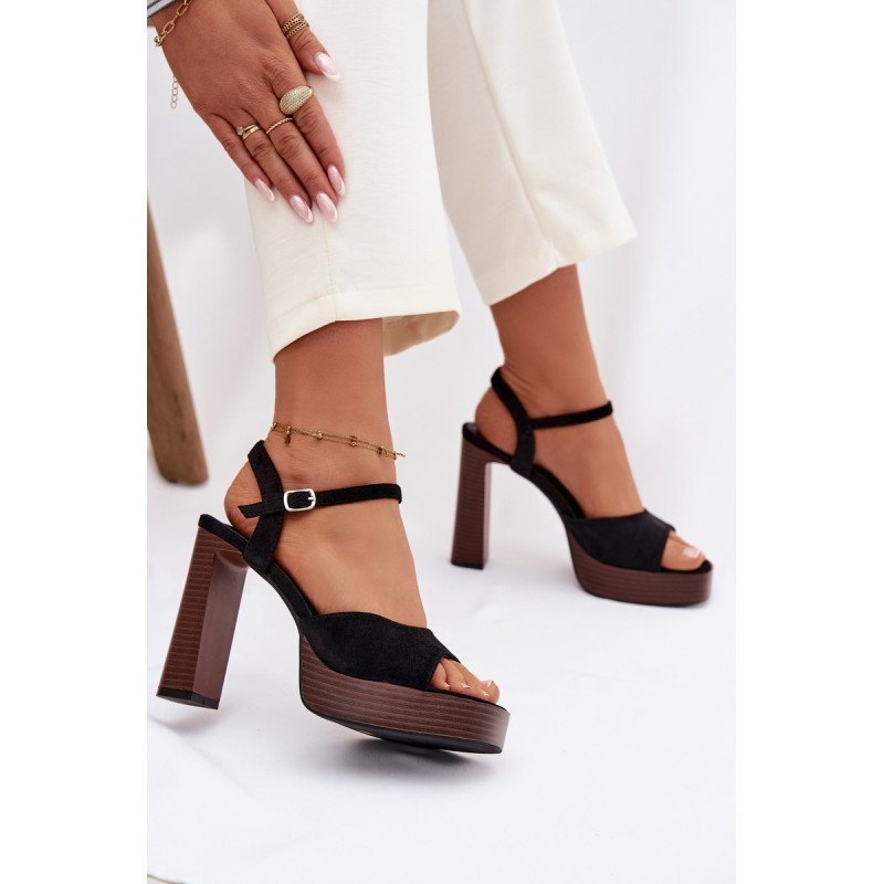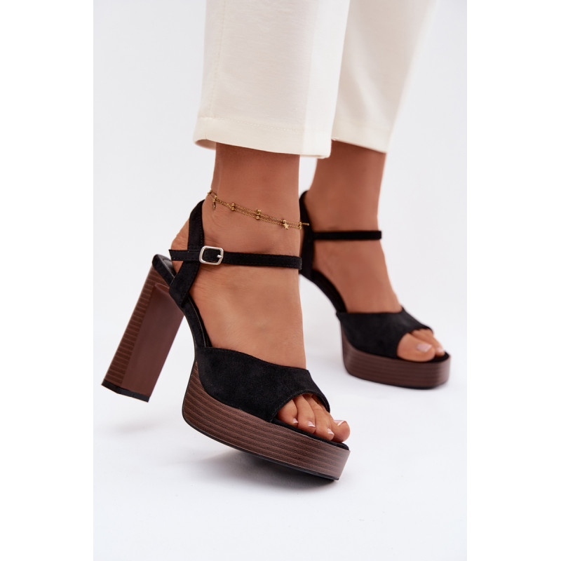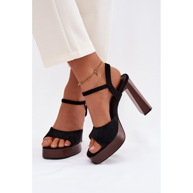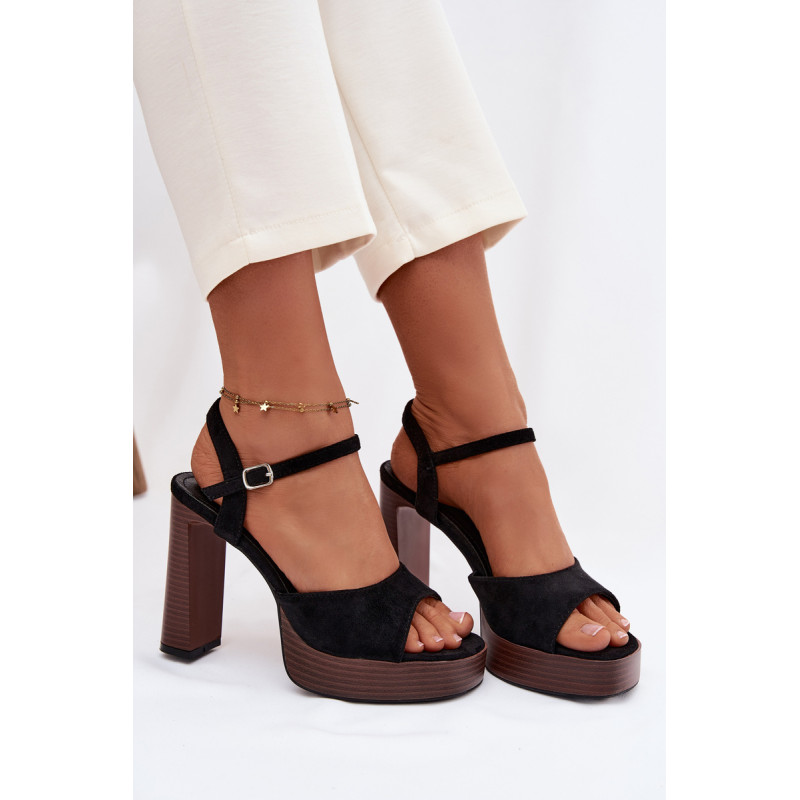 Moteriškos sandalai pagaminti iš ekologiško zomšos. Modelis yra ant aukšto kulno, formos stulpo ir platformos, kas užtikrina stabilumą ir patogumą, o kartu gražiai lieknina siluetą. Reguliuojamas dirželis su sagtimi leidžia idealiai pritaikyti sandalą prie pėdos. Šis modelis puikiai tinka vakarėliams, šventėms ir vakarinėms išvykoms. Renkantis dydį, vadovaukitės dydžių lentele.