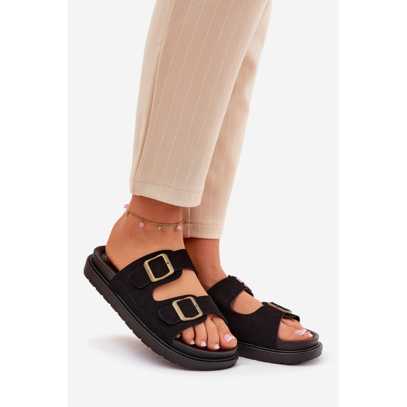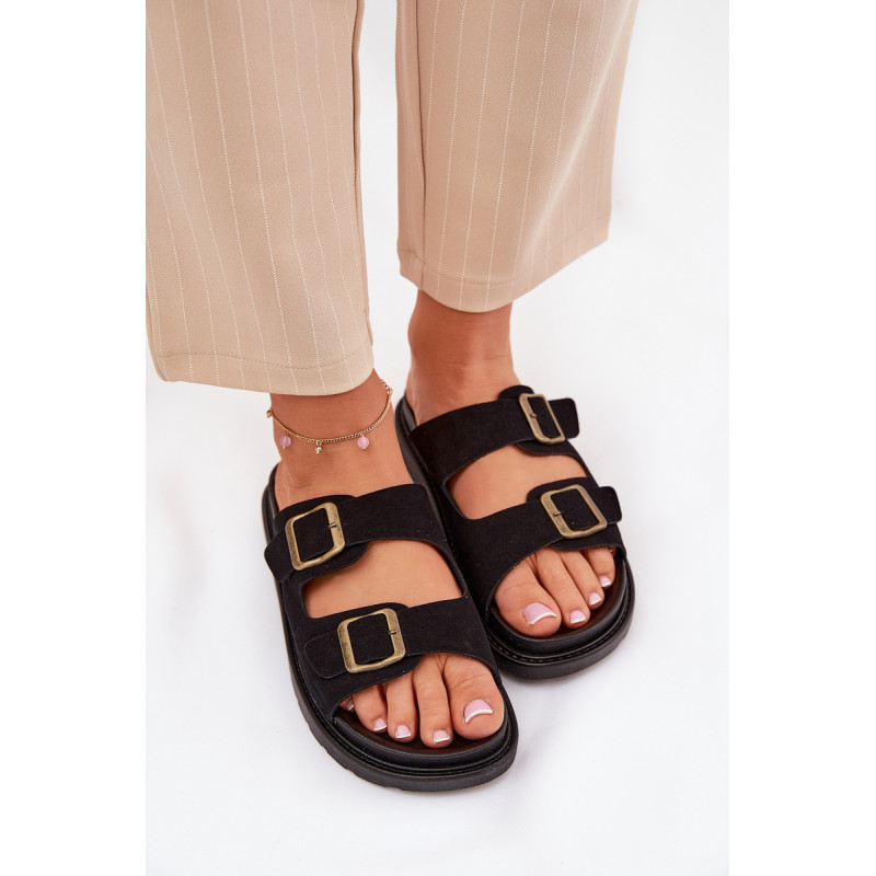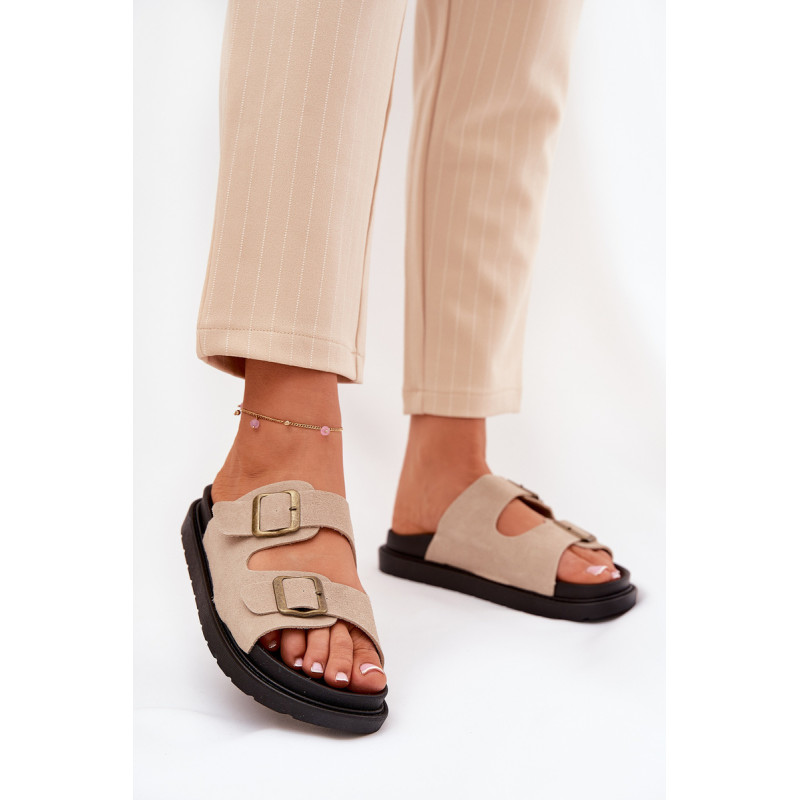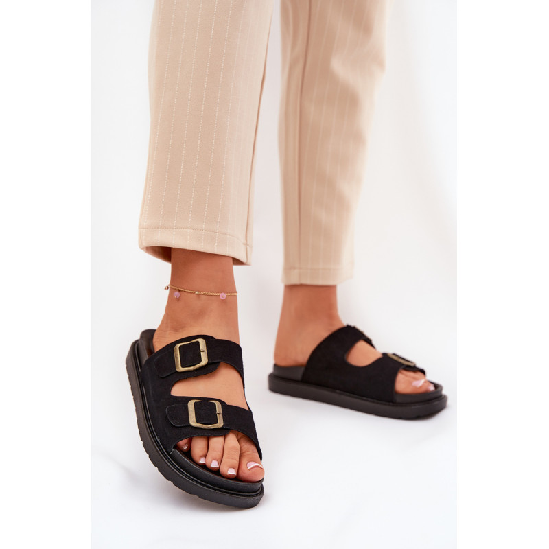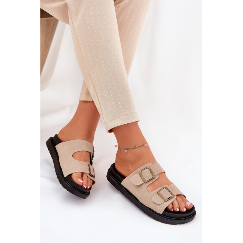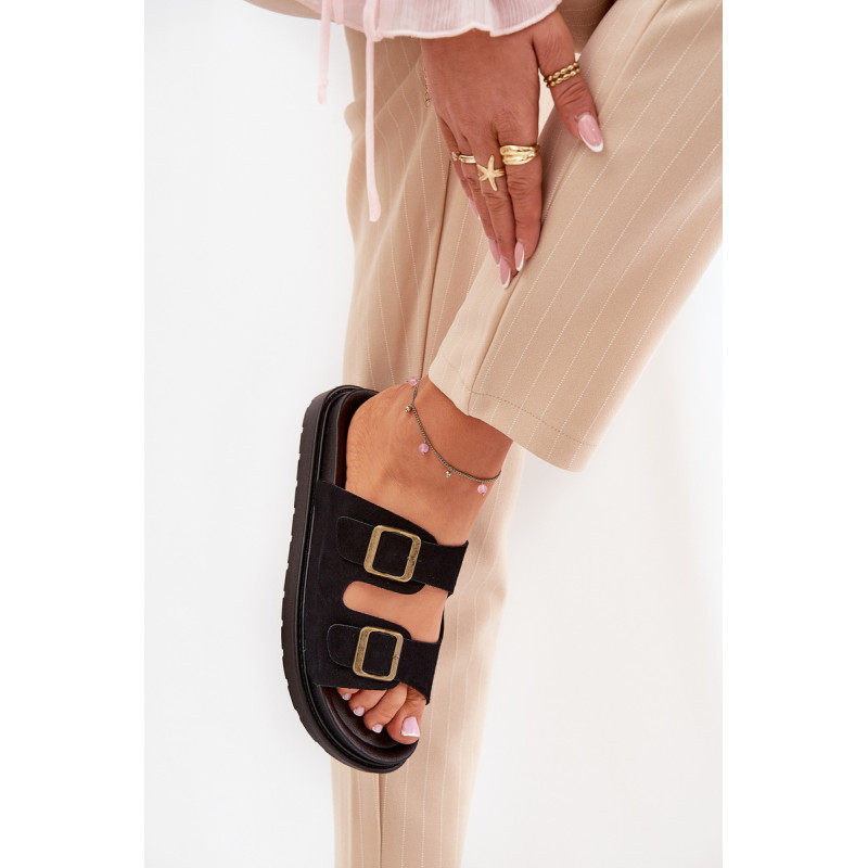 Stilingi šlepetės, pagamintos iš ekologiškos zomšos. Įmontuoti ant platformos, kuri sujungia komfortą su madinga išvaizda. Dirželiai su sagtimis užtikrina tobulą pritaikymą, o profiliuota vidpadis garantuoja patogumą visą dieną. Šios šlepetės bus puikus pasirinkimas vasaros dienoms, tinkamos tiek suknelėms, tiek kelnių. Renkantis dydį, vadovaukitės dydžių lentele.