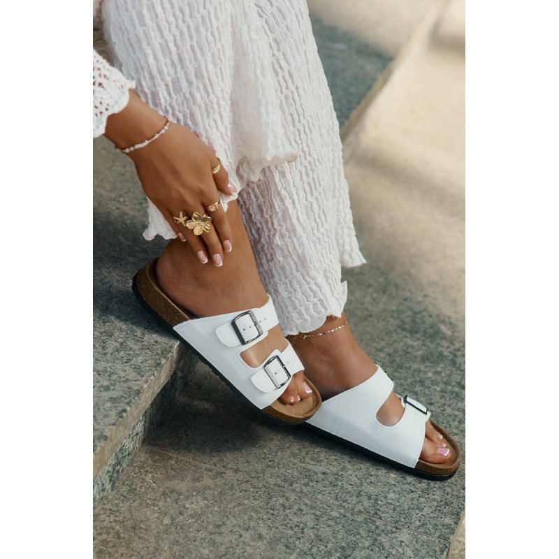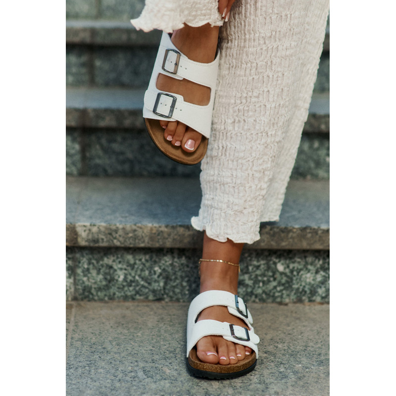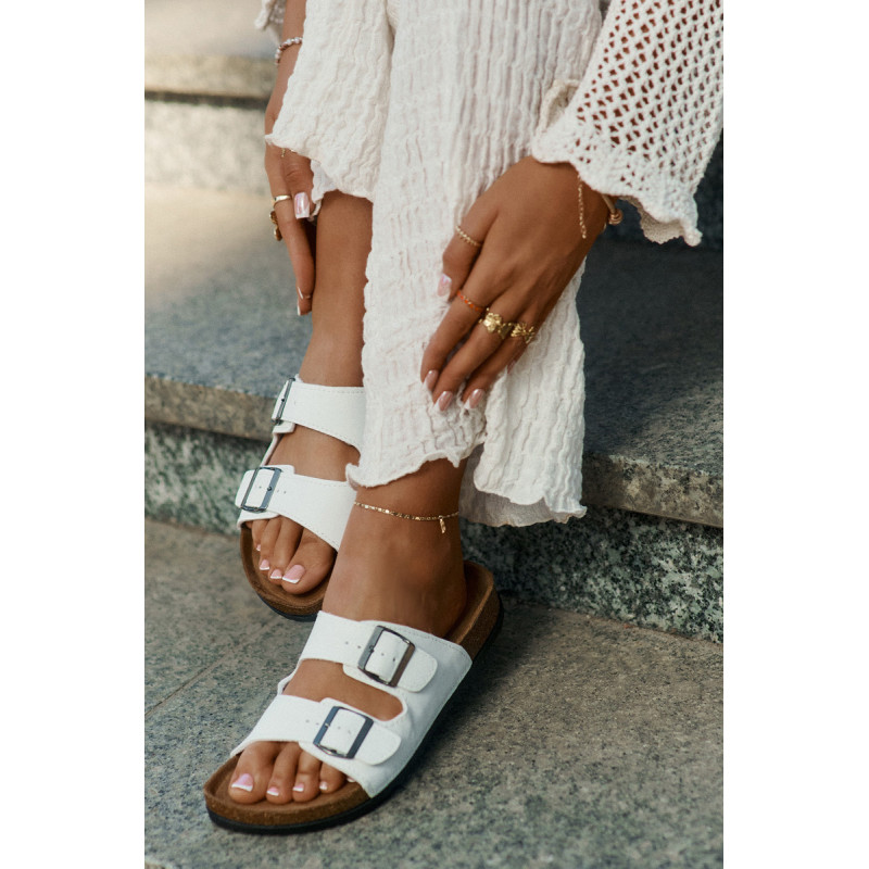 Moteriški šlepetės, pagaminti iš ekologiškos odos. Dvi dirželiai su sagtimis užtikrina lengvą pritaikymą prie pėdos, o kamštinė pado medžiaga prideda lengvumo ir madingo charakterio. Profilizuota pado vidinė dalis užtikrina komfortą visą dieną, todėl šios šlepetės yra puikus pasirinkimas pasivaikščiojimams ar vasaros kelionėms. Komfortas ir stilius viename! Renkantis dydį, vadovaukitės dydžių lentele.