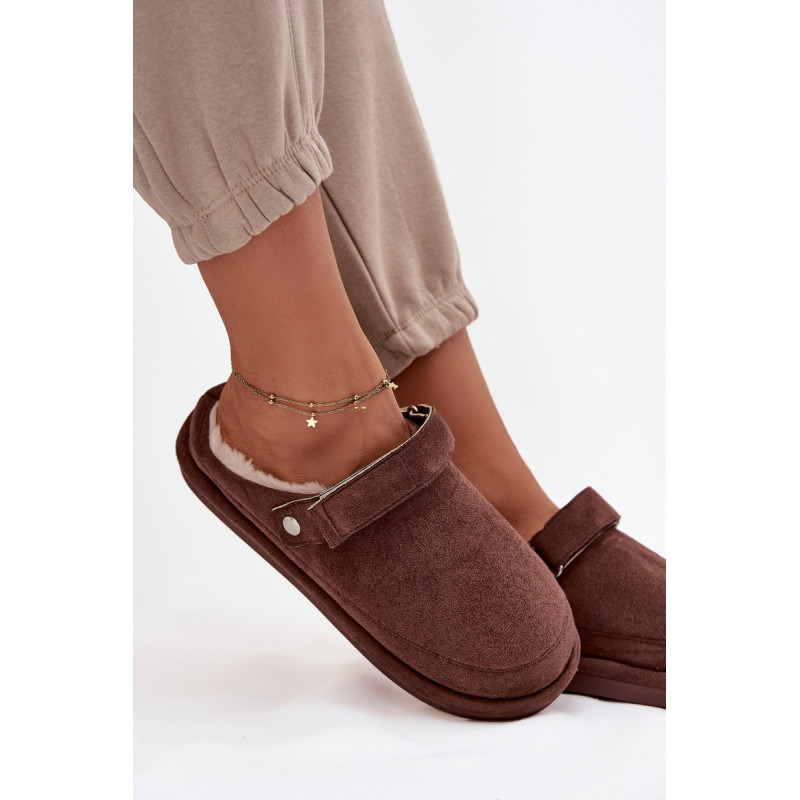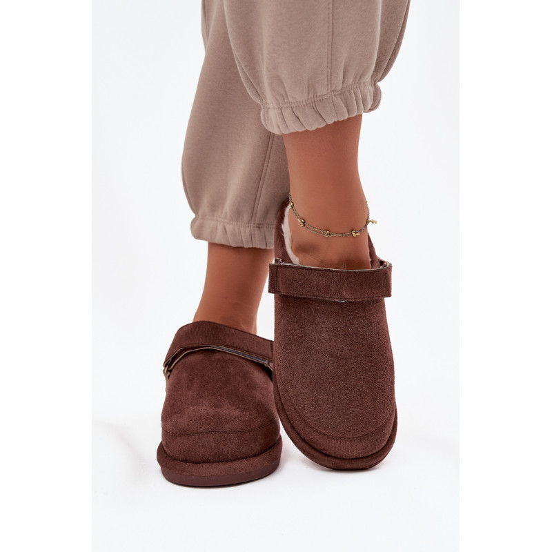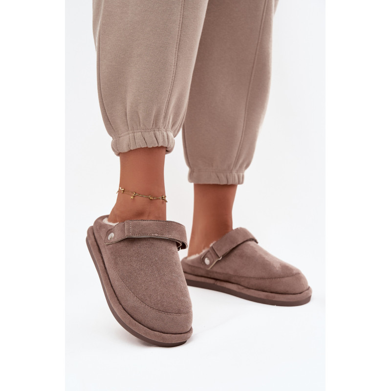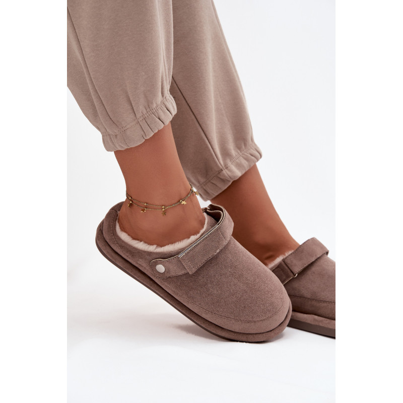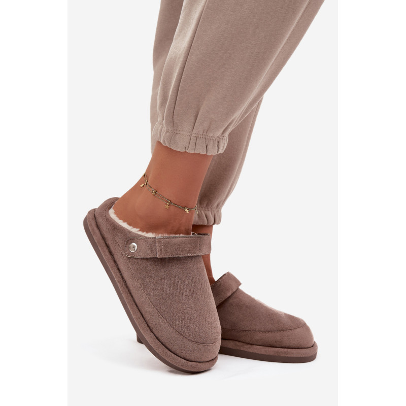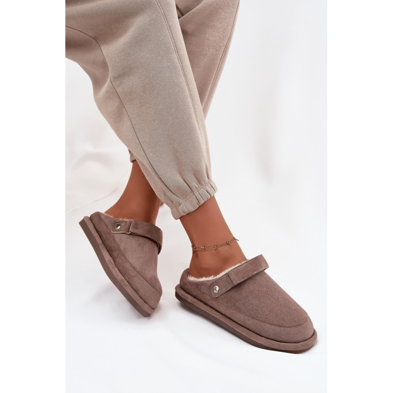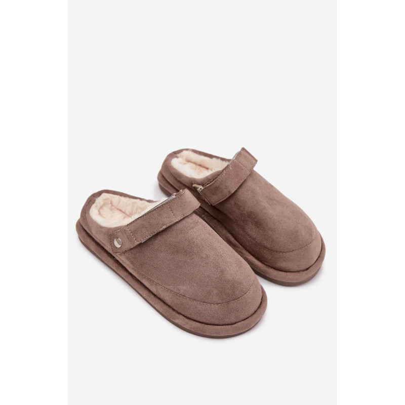 Moteriškos šlepetes, pagamintas iš minkštos ekologiškos zomšos medžiagos, yra patogus ir praktiškas pasirinkimas šalto sezono dienoms. Jos turi guminę pado dalį, užtikrinančią stabilumą ir patogumą vaikščiojant namuose. Apvalios, uždaros nosys pabrėžia klasikinį avalynės išvaizdą, o nuimama juosta su Velcro užsegimu palengvina pritaikymą prie pėdos ir prideda funkcionalumo. Vidus, išklotas minkštu kailiu, garantuoja šilumą ir malonią apkabinimą, todėl šios šlepetės yra ideali namų naudojimui. Renkantis dydį, vadovaukitės dydžių lentele.