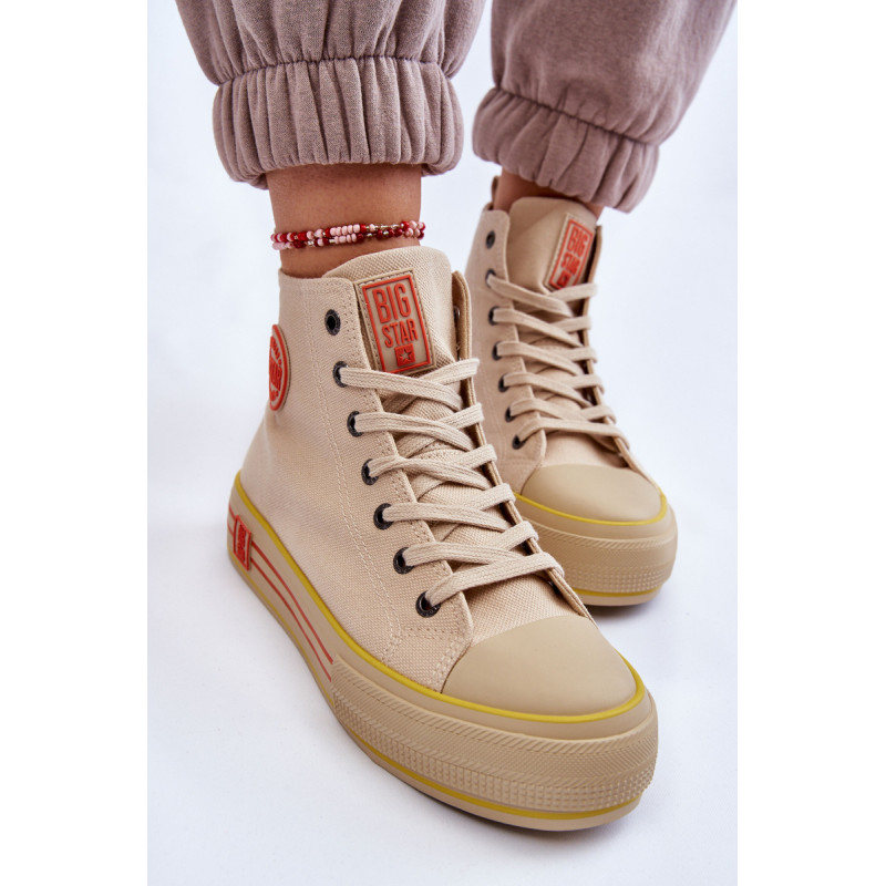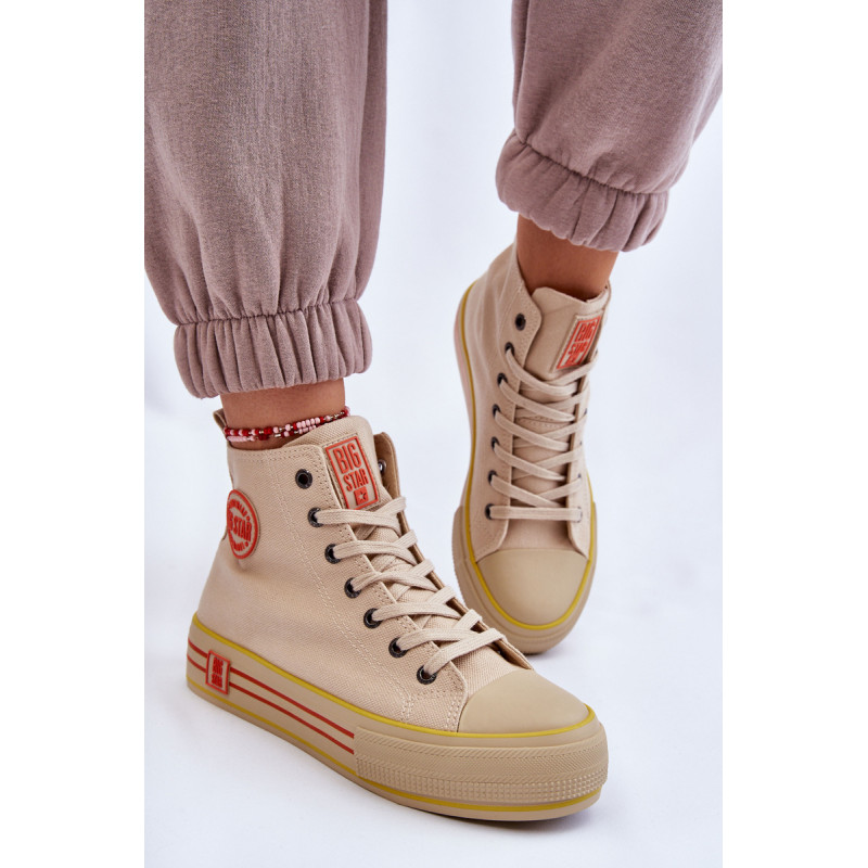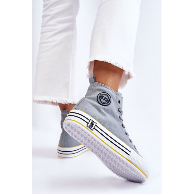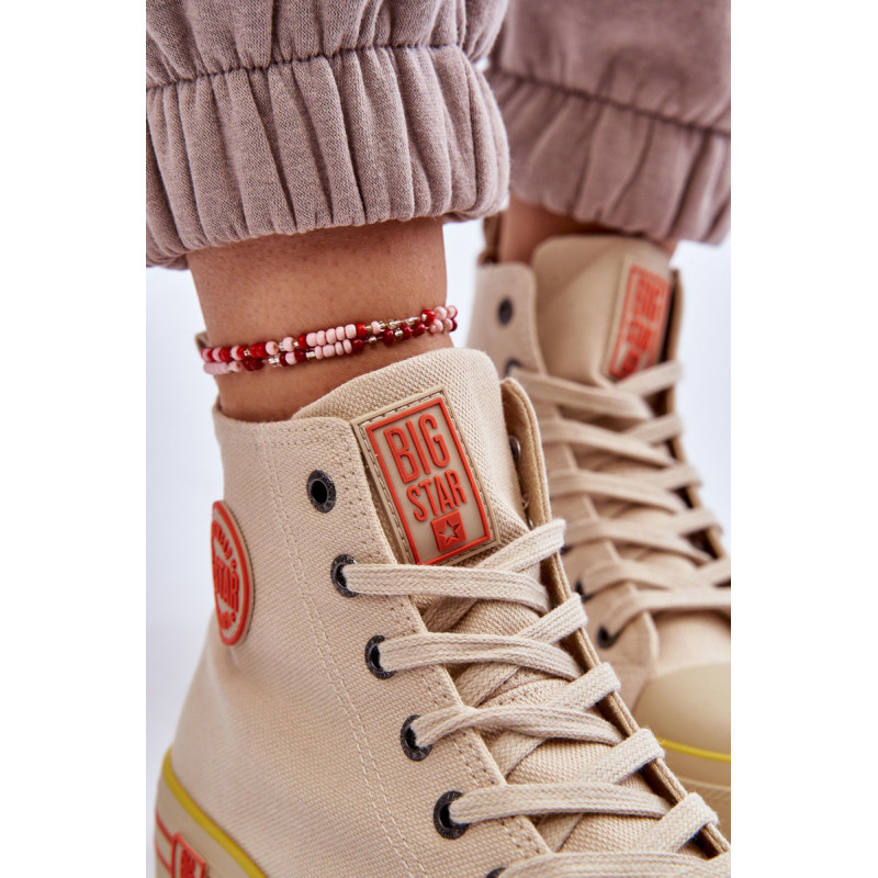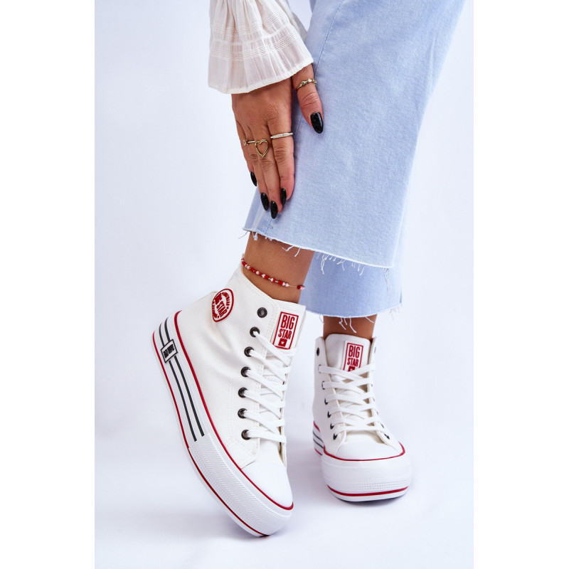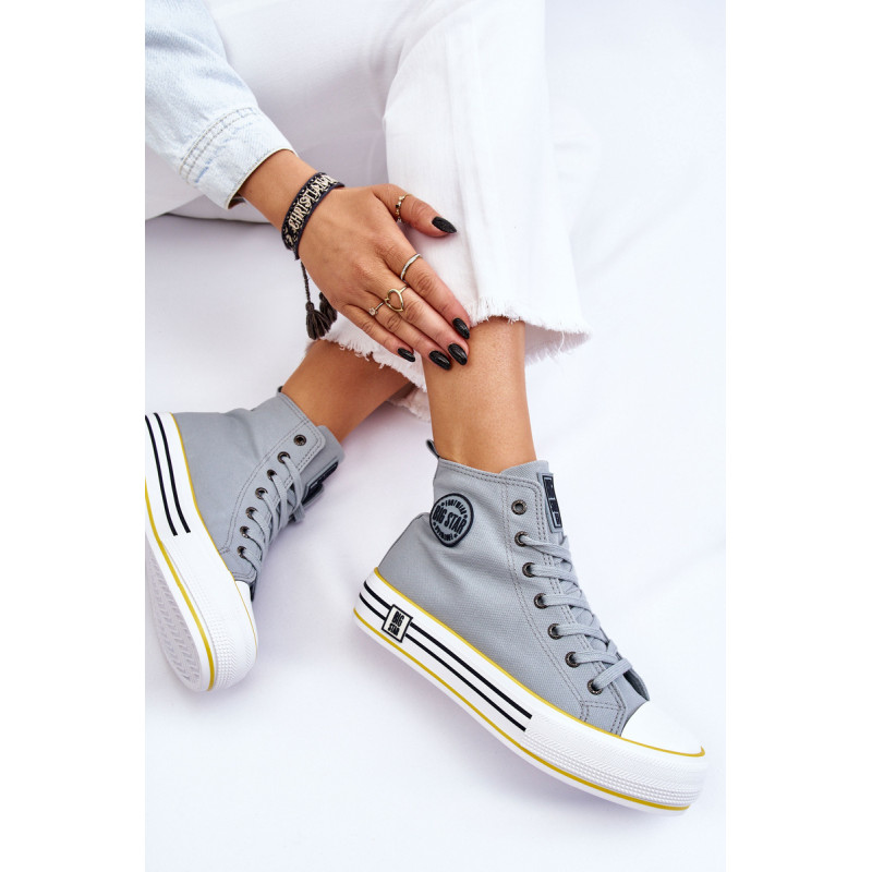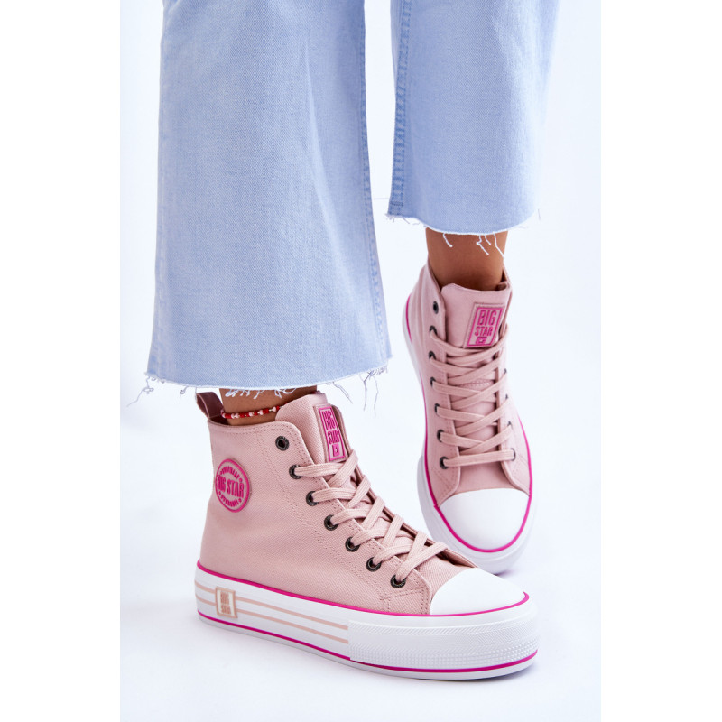 Aukšti moteriški sportbačiai pagaminti iš tekstilės. Klasikinis suvarstomas modelis. Batai buvo pastatyti ant masyvios, guminės platformos su neslidžiu padu. Viršutinėje pusėje yra guminis Big Star logotipas. Sutvirtintas kulno skaitiklis užtikrins tinkamą pėdos stabilizavimą. Šis modelis iki kulkšnių puikiai tiks pavasario ir rudens sezonui.Rinkdamiesi dydį, vadovaukitės dydžių lentele.