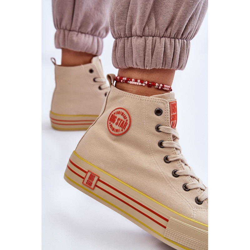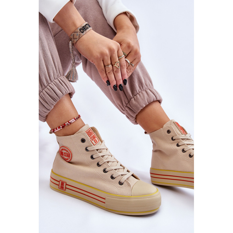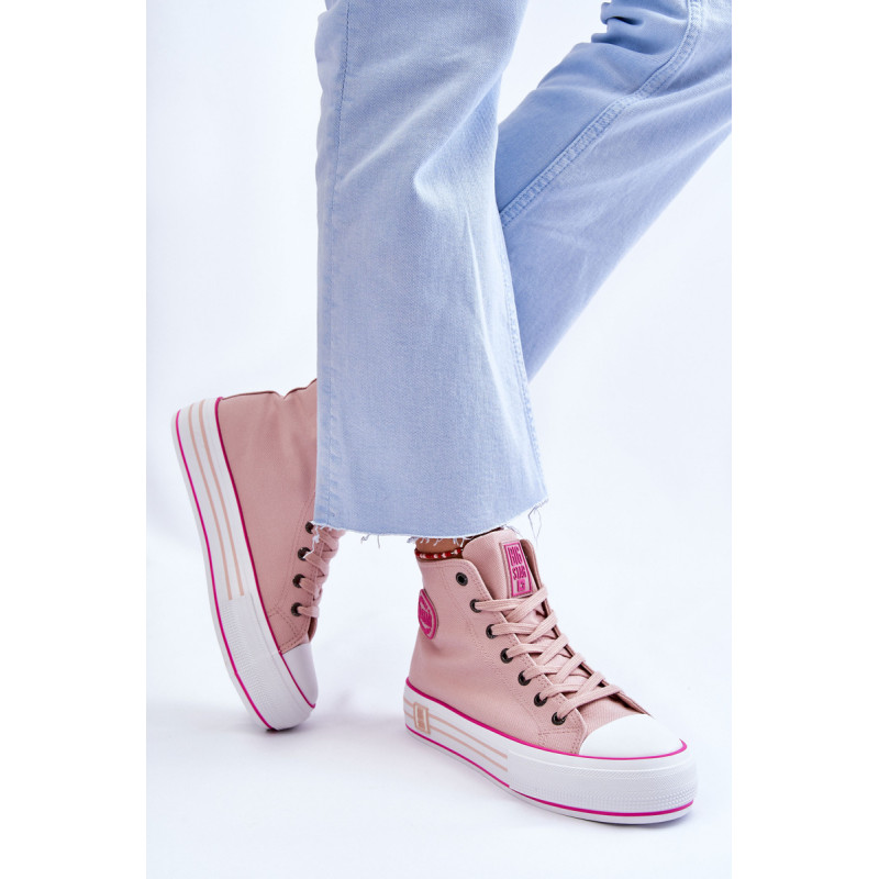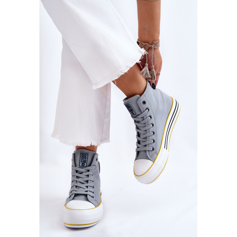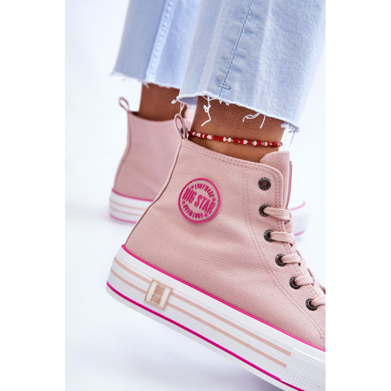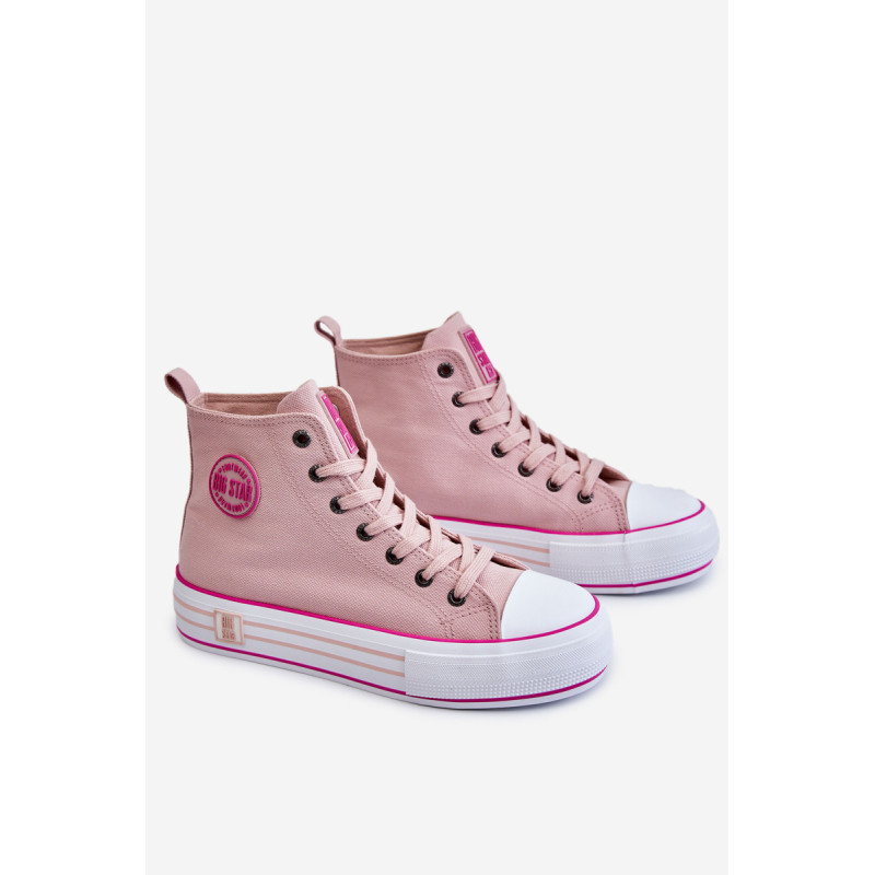 Aukšti moteriški sportbačiai pagaminti iš tekstilės. Klasikinis suvarstomas modelis. Batai buvo pastatyti ant masyvios, guminės platformos su neslidžiu padu. Viršutinėje pusėje yra guminis Big Star logotipas. Sutvirtintas kulno skaitiklis užtikrins tinkamą pėdos stabilizavimą. Šis modelis iki kulkšnių puikiai tiks pavasario ir rudens sezonui.Rinkdamiesi dydį, vadovaukitės dydžių lentele.