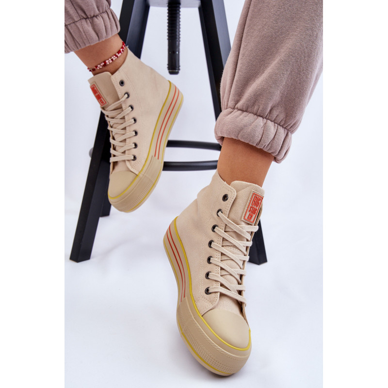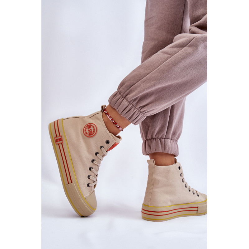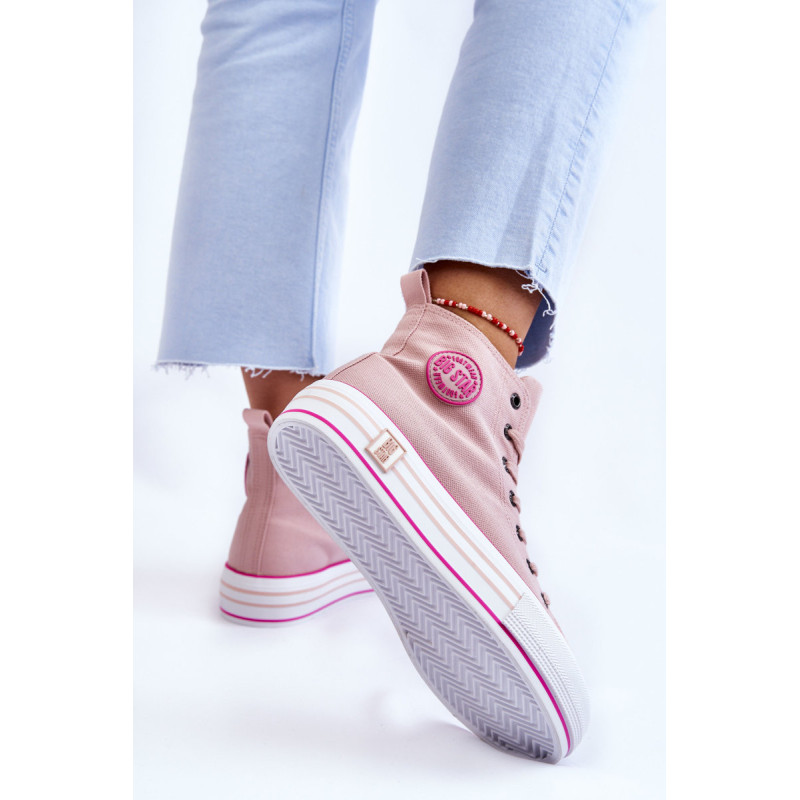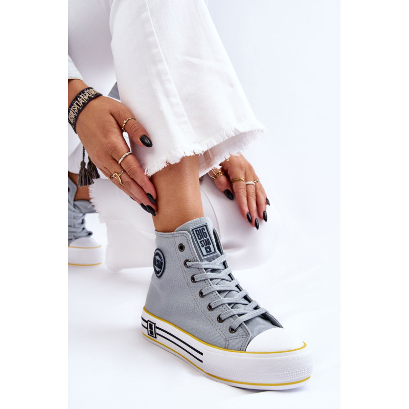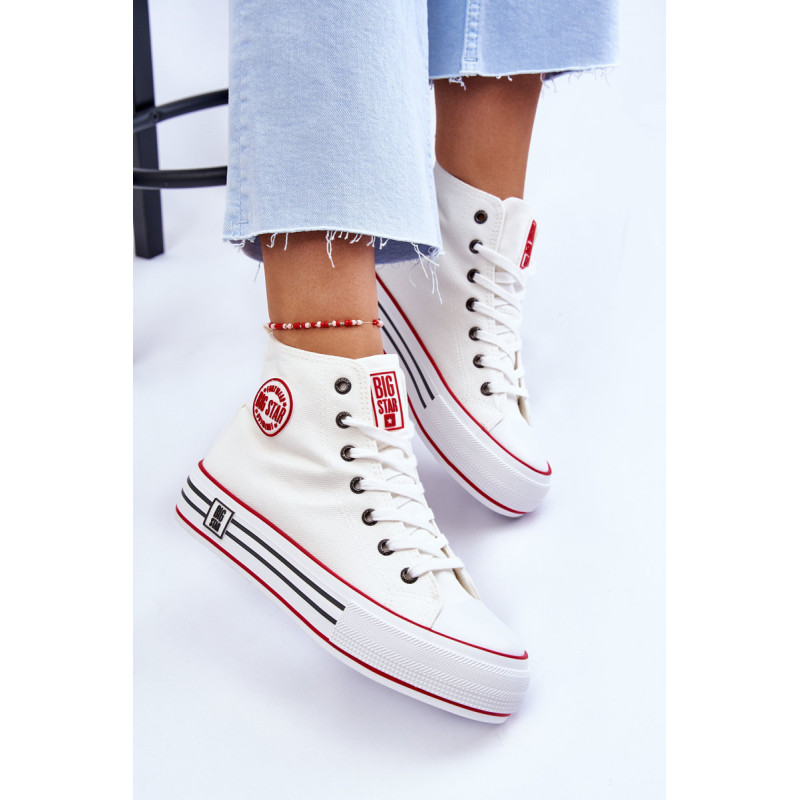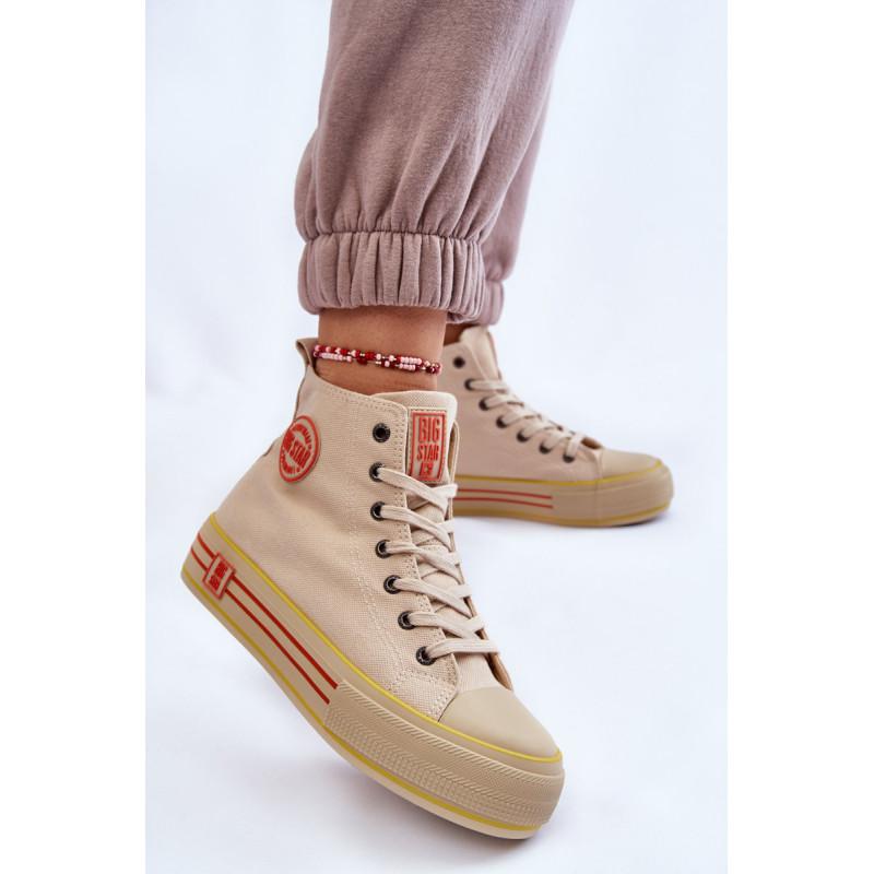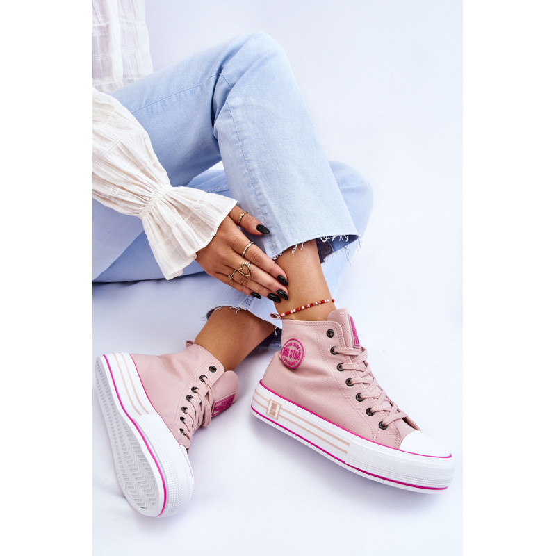 Aukšti moteriški sportbačiai pagaminti iš tekstilės. Klasikinis suvarstomas modelis. Batai buvo pastatyti ant masyvios, guminės platformos su neslidžiu padu. Viršutinėje pusėje yra guminis Big Star logotipas. Sutvirtintas kulno skaitiklis užtikrins tinkamą pėdos stabilizavimą. Šis modelis iki kulkšnių puikiai tiks pavasario ir rudens sezonui.Rinkdamiesi dydį, vadovaukitės dydžių lentele.