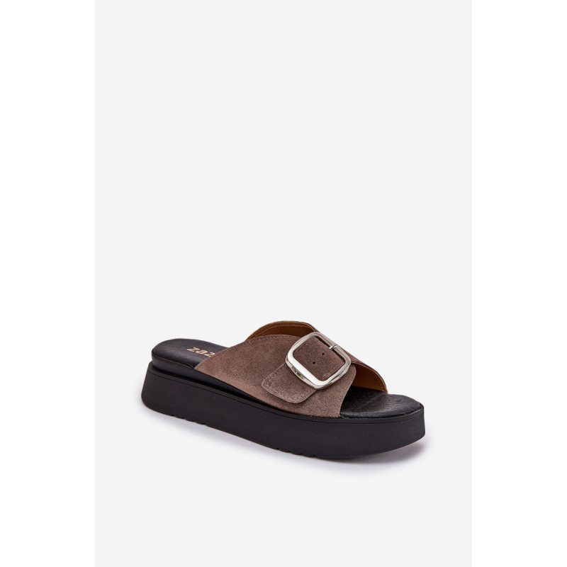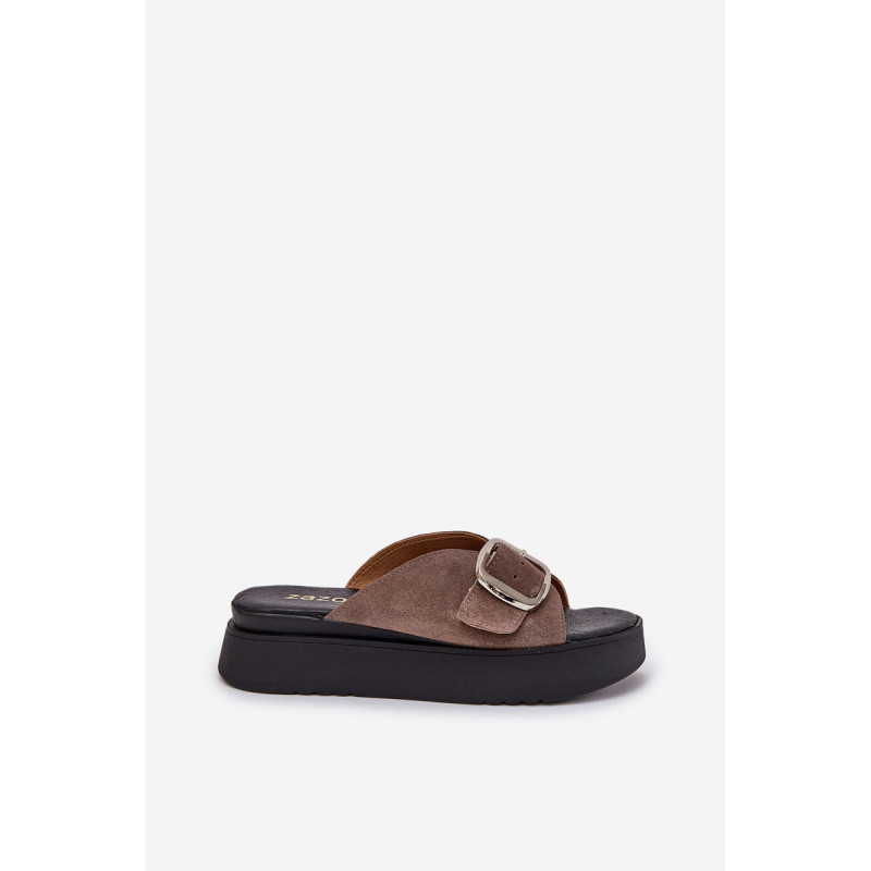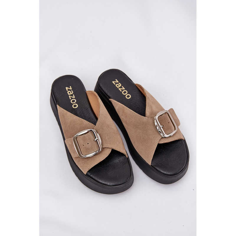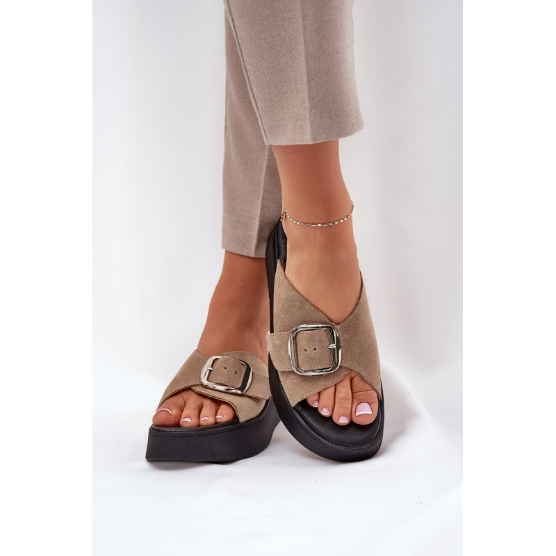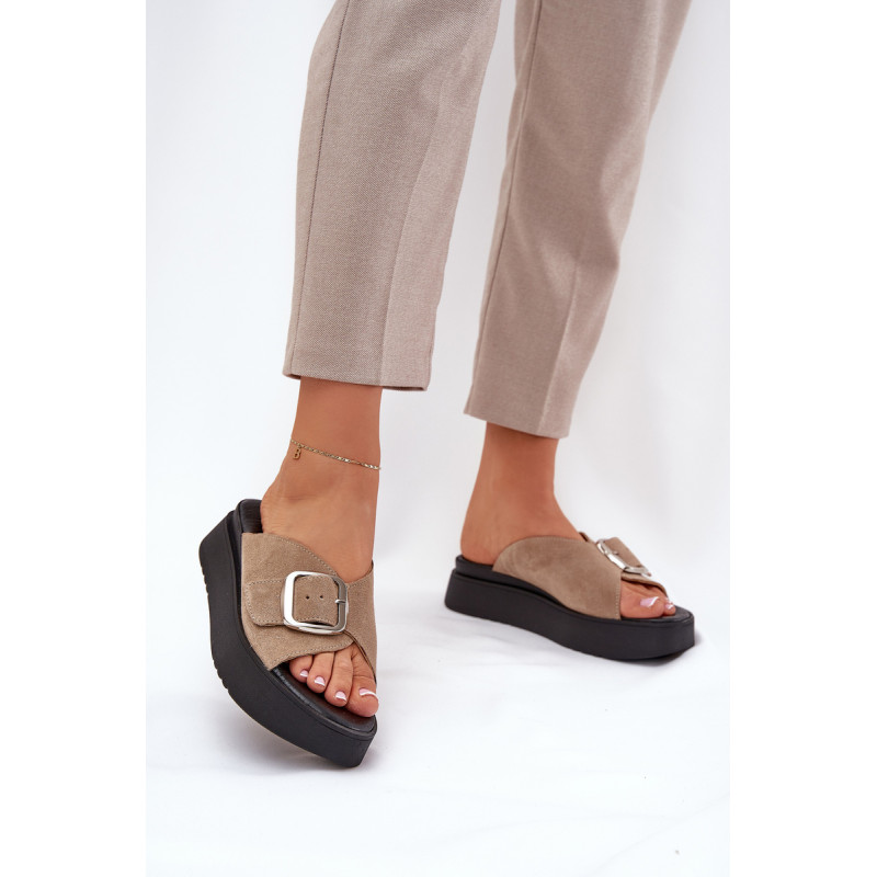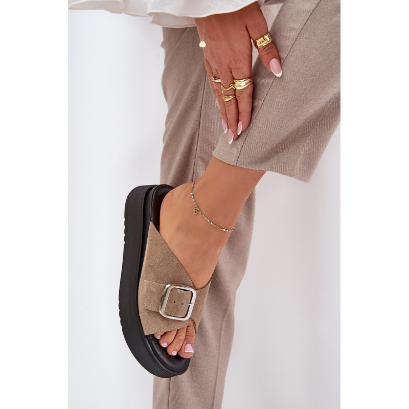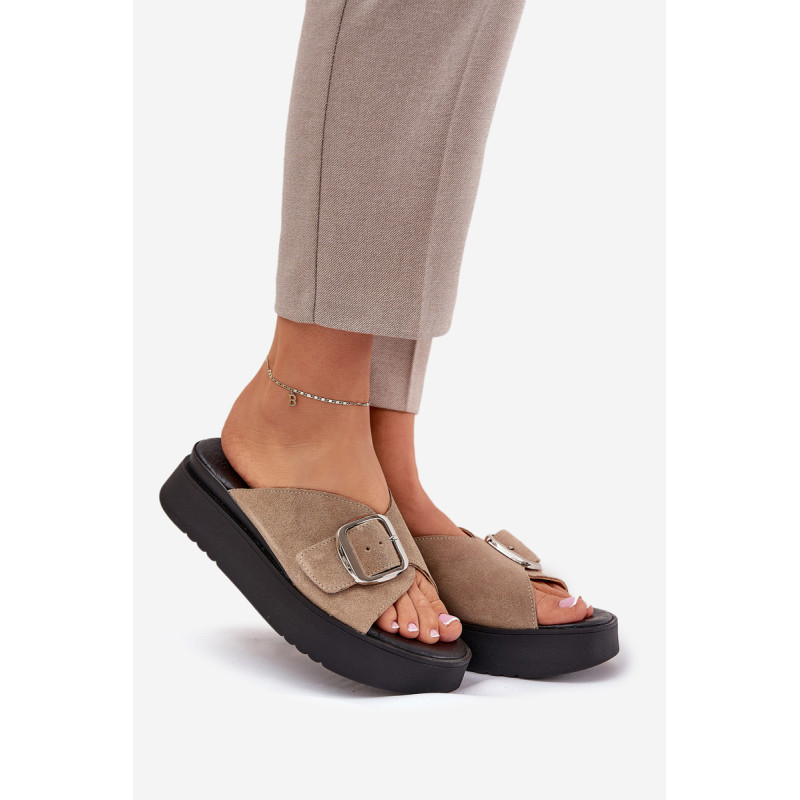 Natūralaus zomšo šlepetės yra elegantiškas pasirinkimas vasaros dienoms. Padėtos ant platformos, jos užtikrina komfortą ir stabilumą vaikščiojant. Didelis sagtis su reguliuojama juostele priekyje leidžia idealiai pritaikyti prie pėdos, o minkšta pado danga garantuoja komfortą visą dieną. Šios šlepetės yra puikus pasirinkimas daugeliui stilių! Renkantis dydį, vadovaukitės dydžių lentele.