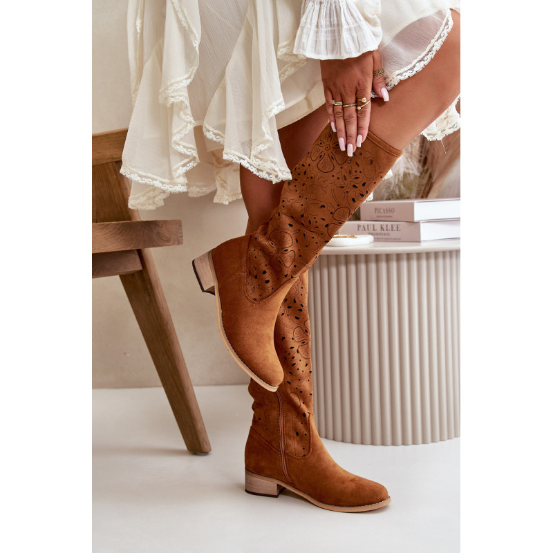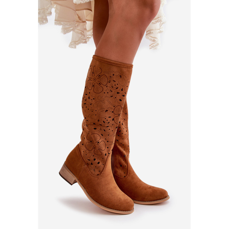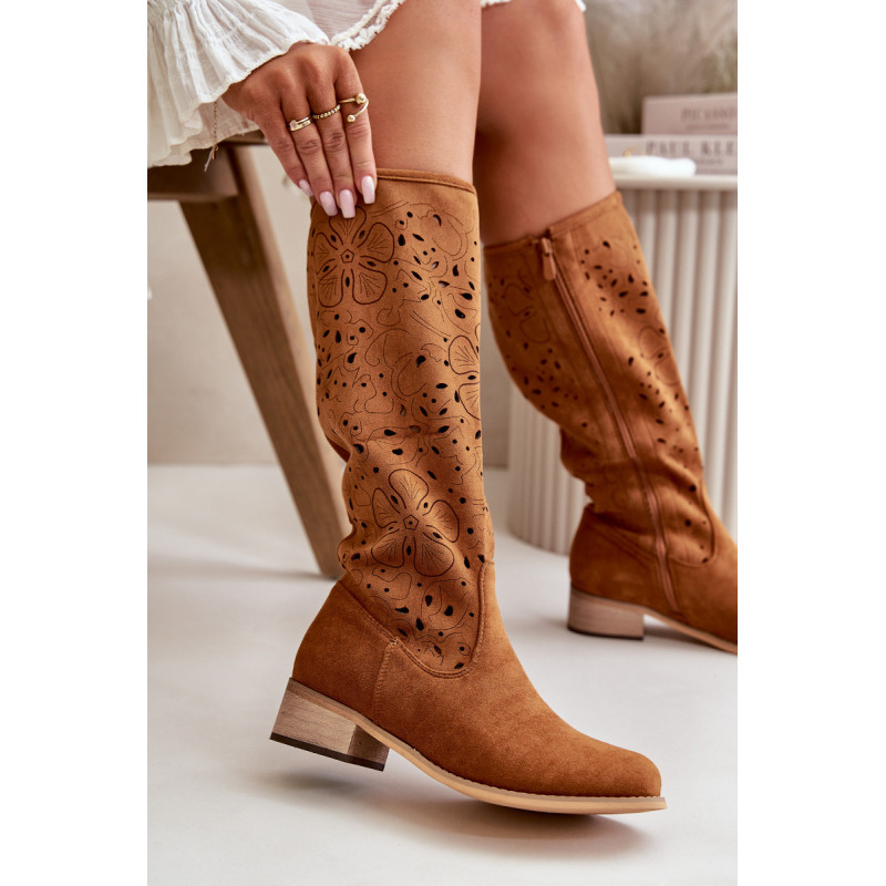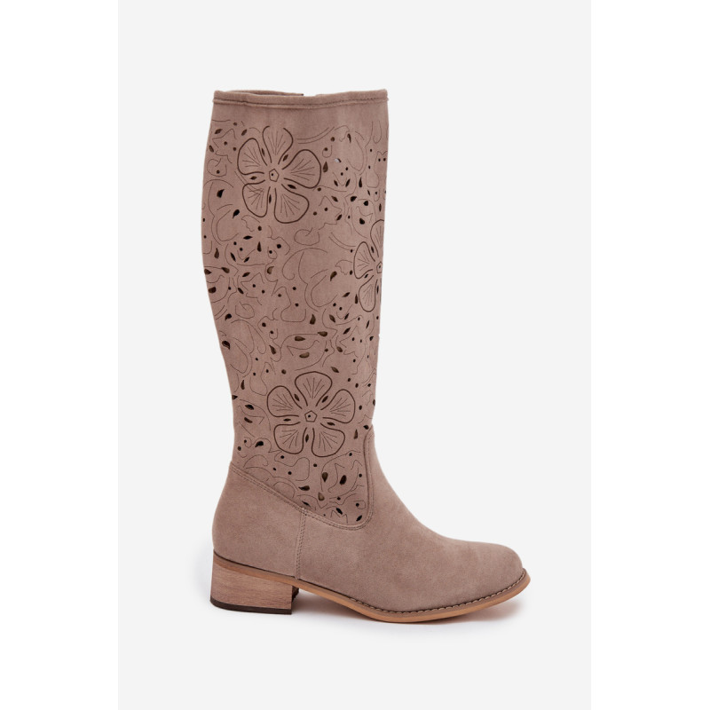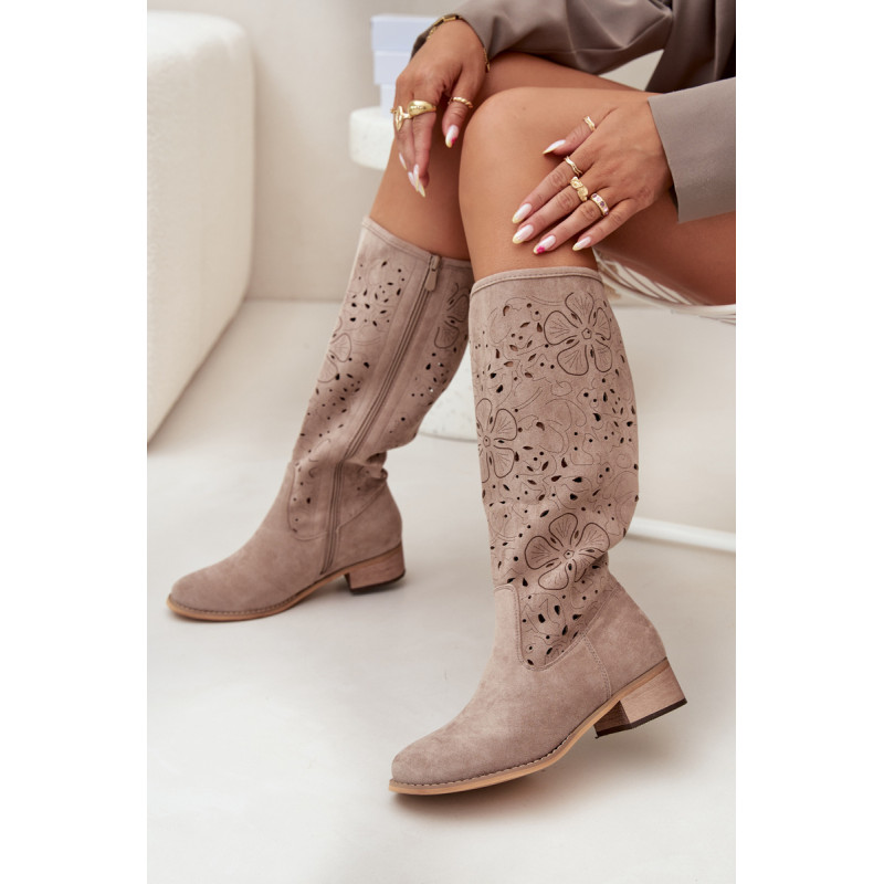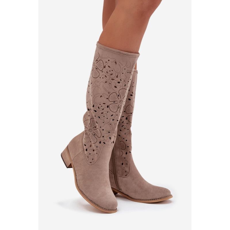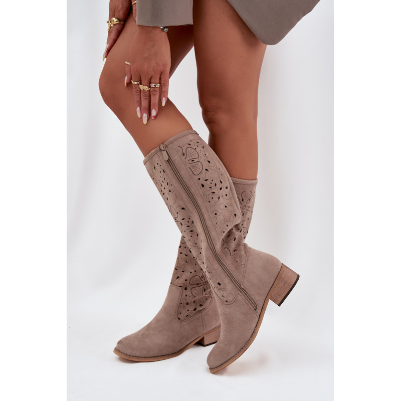 Moteriški batai, pagaminti iš aukštos kokybės ekologiškos zomšos. Viršutinė dalis siekia virš kelių, o jos įmantrus raštas suteikia batams unikalumo. Užsegamas užtrauktuku, kuris palengvina užsidėjimą ir nusiėmimą. Ant žemo kulno, kuris garantuoja komfortą visą dieną. Pirštai suapvalinti. Sustiprintas kulnas suteikia papildomos atramos ir stabilumo. Šie batai puikiai tinka tiek prie laisvalaikio, tiek prie elegantiškesnio stiliaus. Rinkdamiesi dydį, žiūrėkite dydžių lentelę.