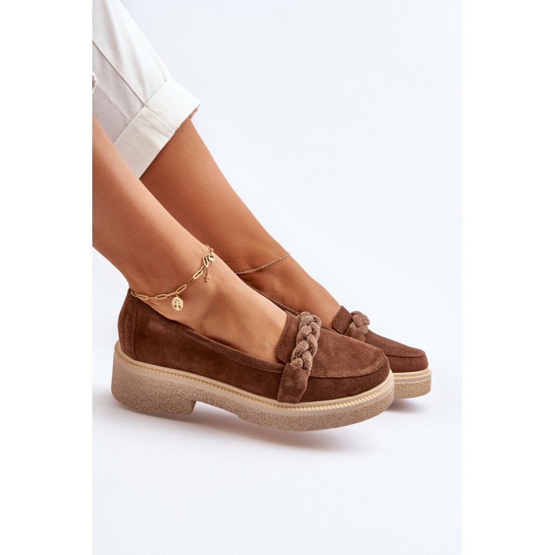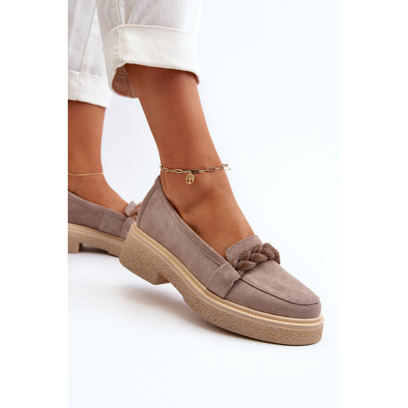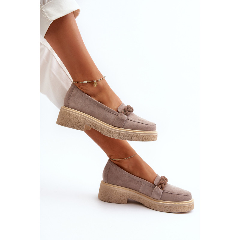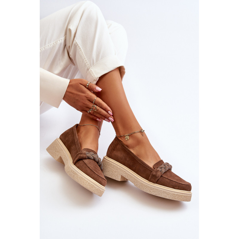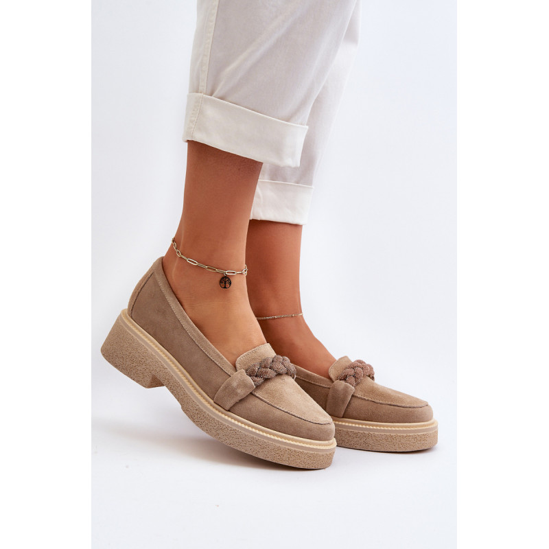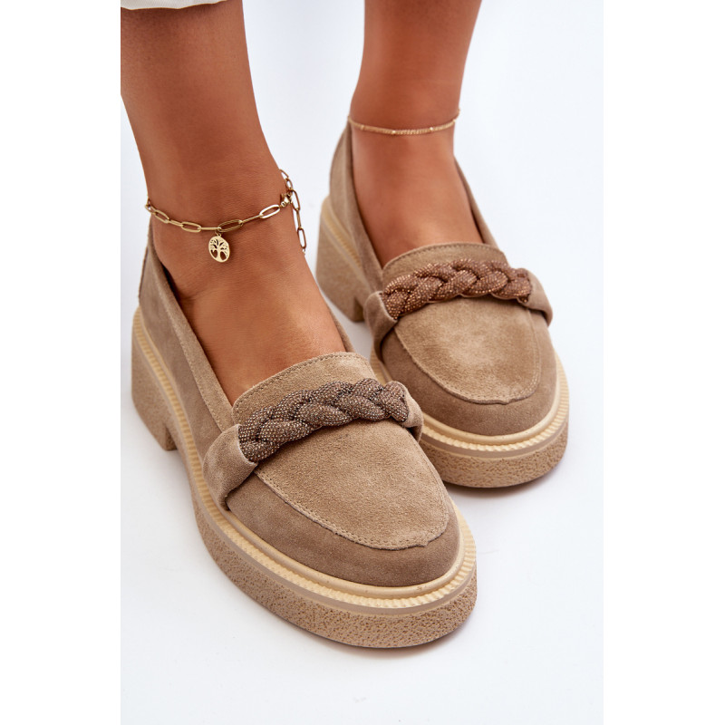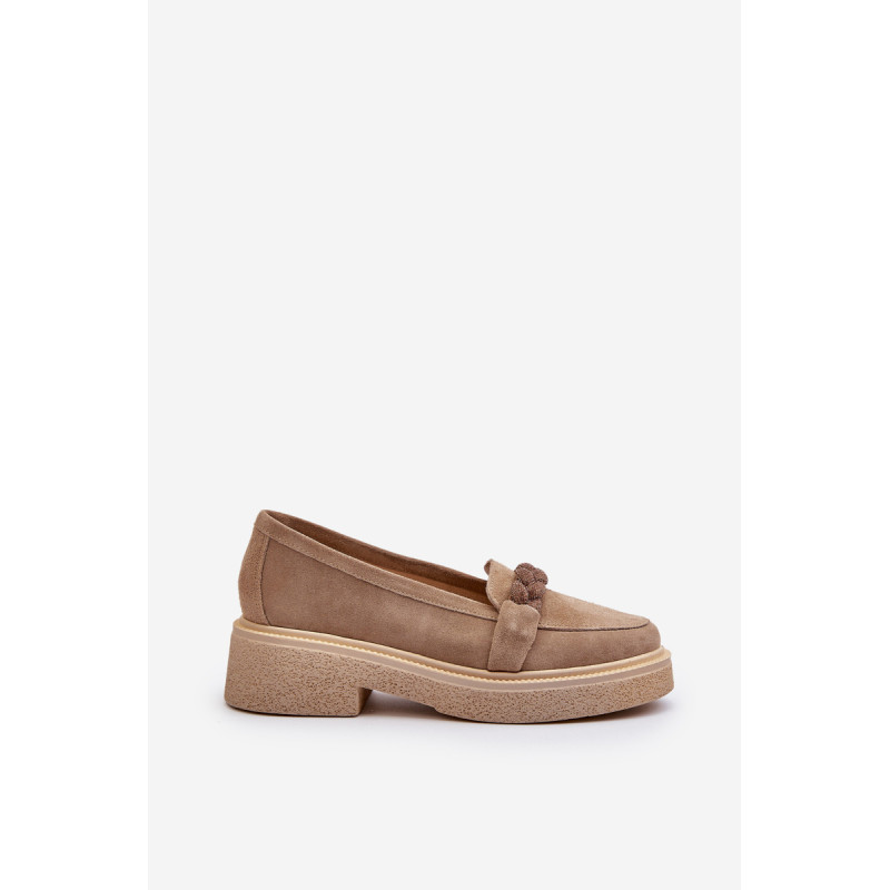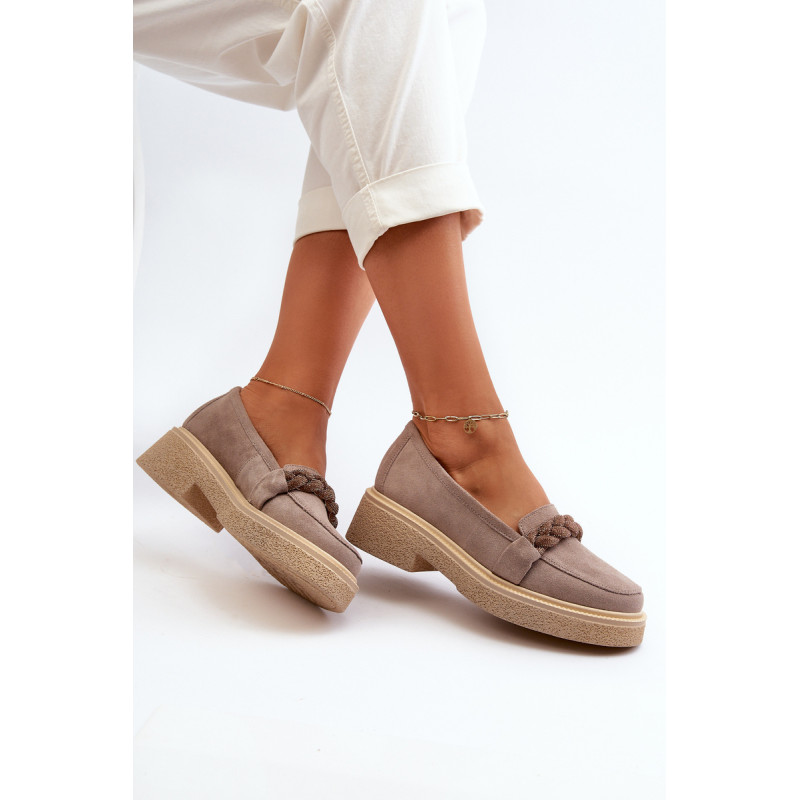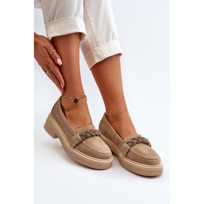 Žavūs moteriški mokasinai, pagaminti iš natūralios zomšos. Jie turi plokščią kulną su subtilia platforma, kuri užtikrina stabilumą ir patogumą dėvint. Suapvalinti kojų pirštai suteikia jiems subtilaus žavesio. Profiliuotas vidpadis garantuoja patogumą naudojimo metu. Papildomos elegancijos suteikia nedideli cirkoniai, uždėti ant dirželio priekyje. Jūs tikrai turėtumėte juos turėti savo pavasario garderobe! Rinkdamiesi dydį žiūrėkite dydžių lentelę.