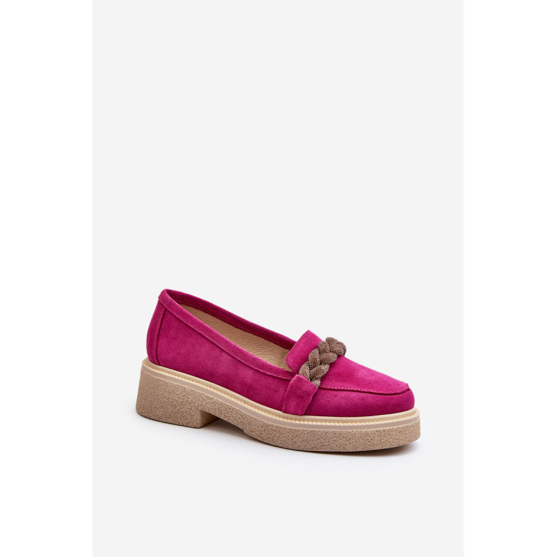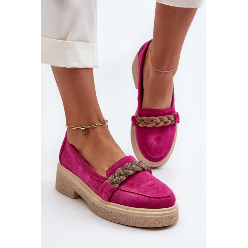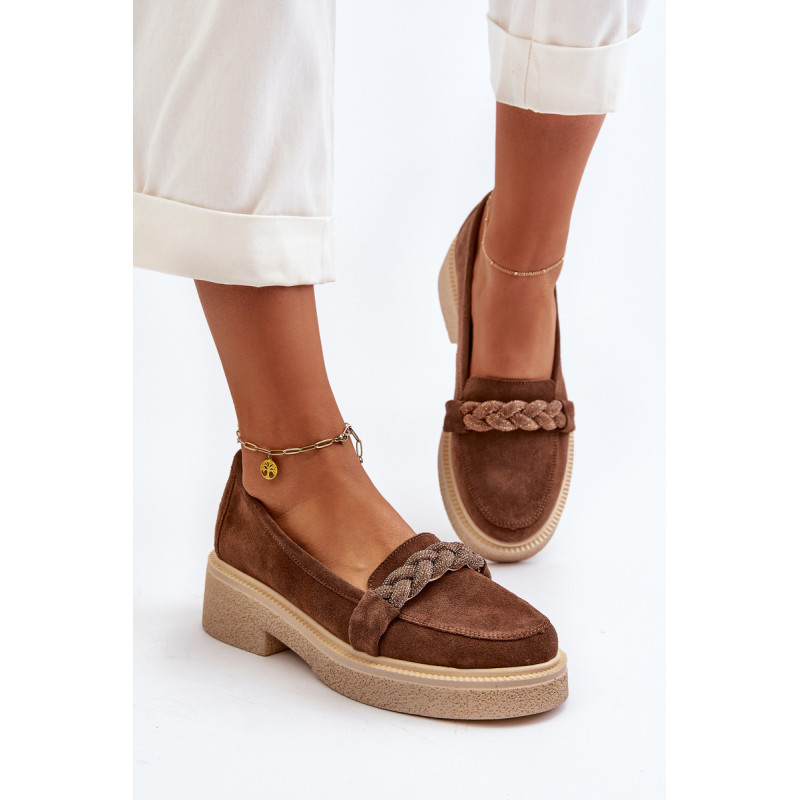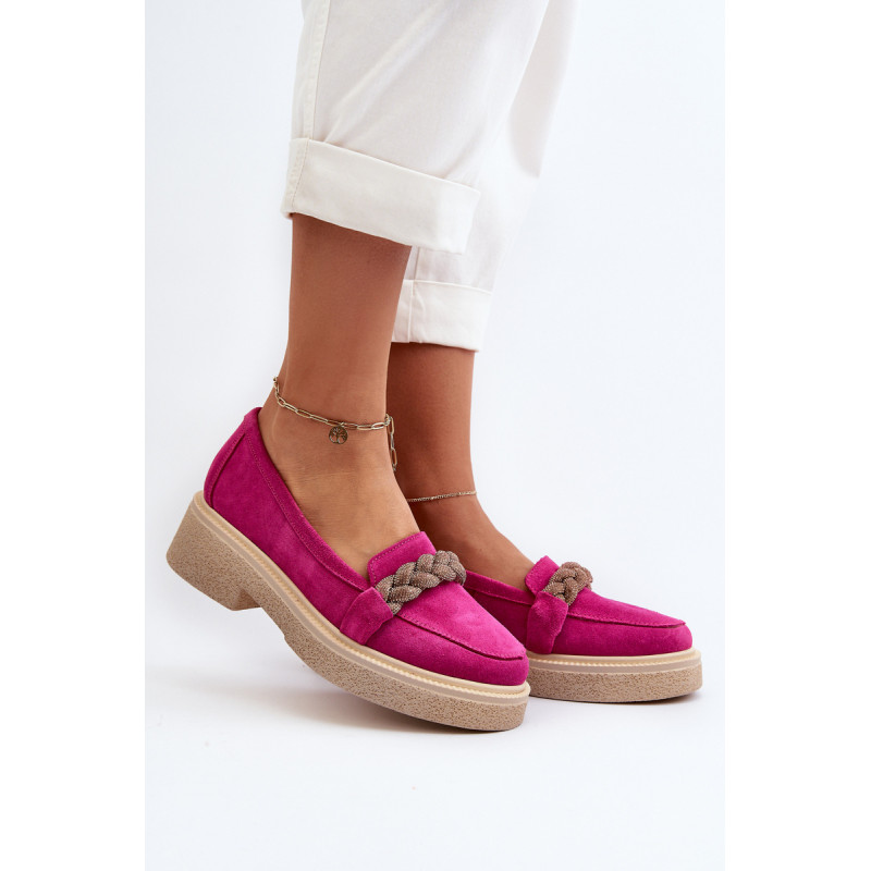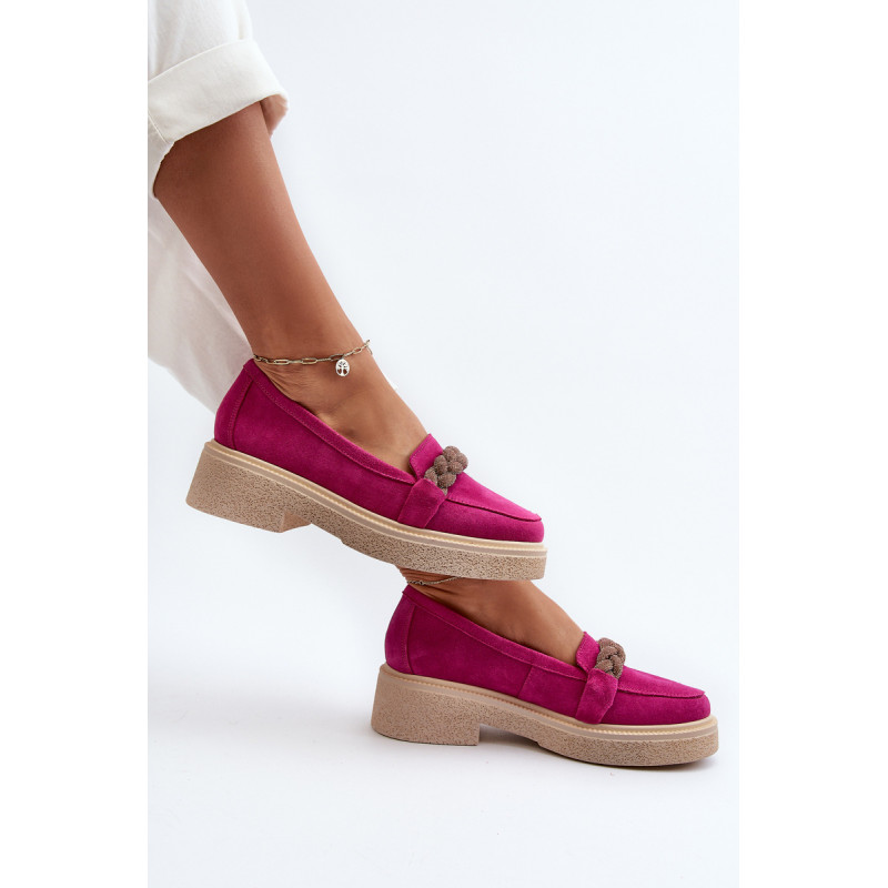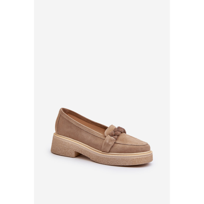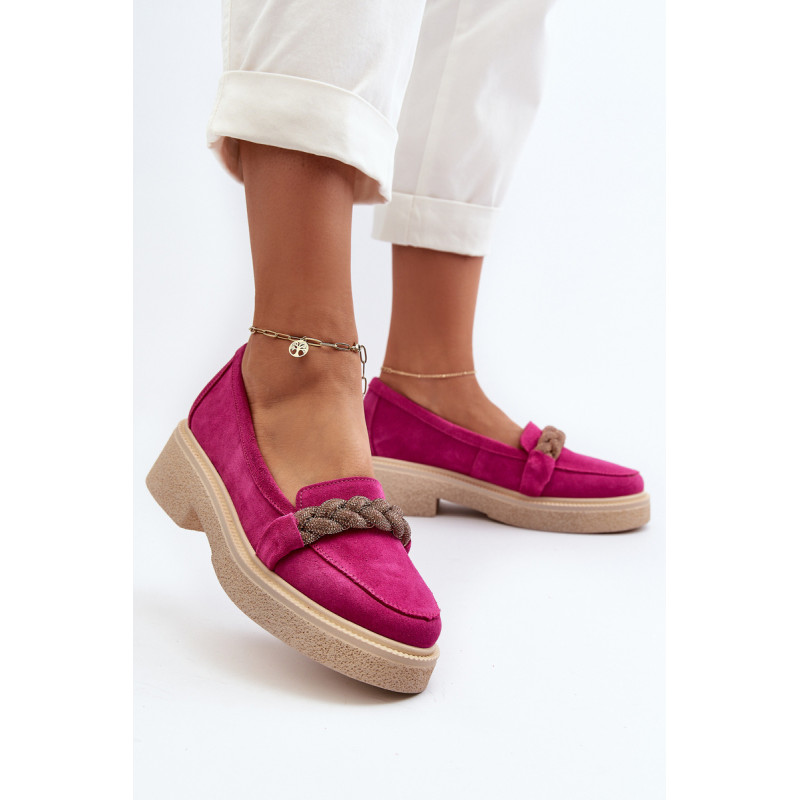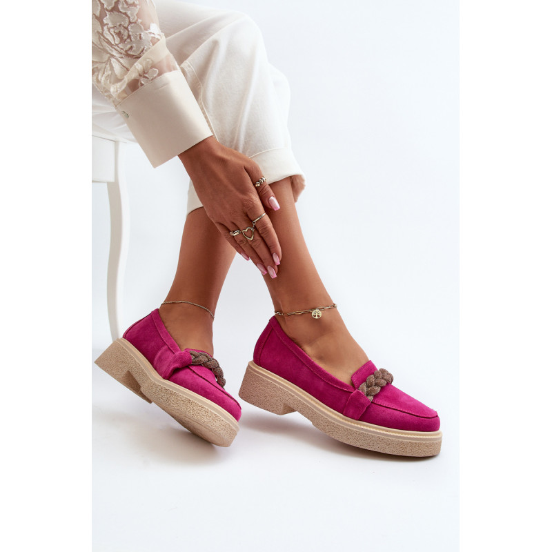Žavūs moteriški mokasinai, pagaminti iš natūralios zomšos. Jie turi plokščią kulną su subtilia platforma, kuri užtikrina stabilumą ir patogumą dėvint. Suapvalinti kojų pirštai suteikia jiems subtilaus žavesio. Profiliuotas vidpadis garantuoja patogumą naudojimo metu. Papildomos elegancijos suteikia nedideli cirkoniai, uždėti ant dirželio priekyje. Jūs tikrai turėtumėte juos turėti savo pavasario garderobe! Rinkdamiesi dydį žiūrėkite dydžių lentelę.