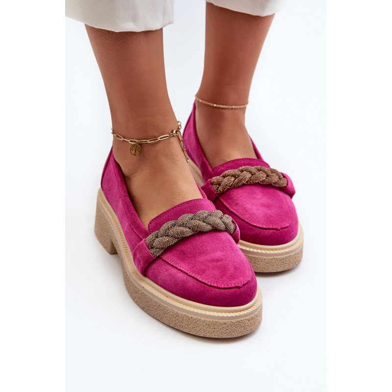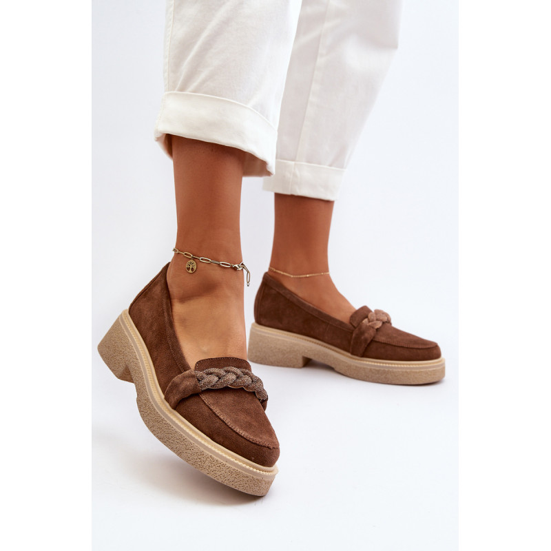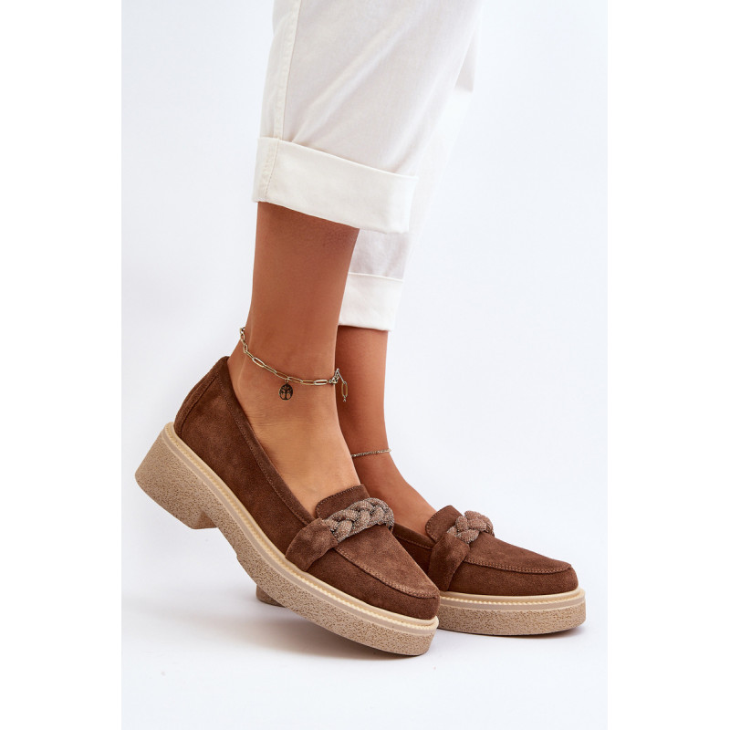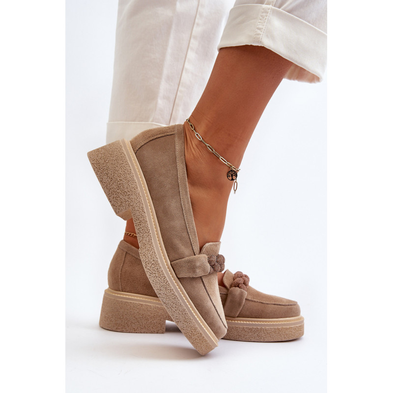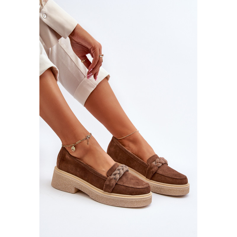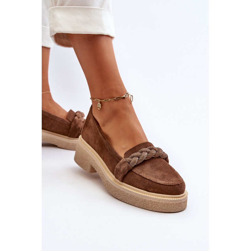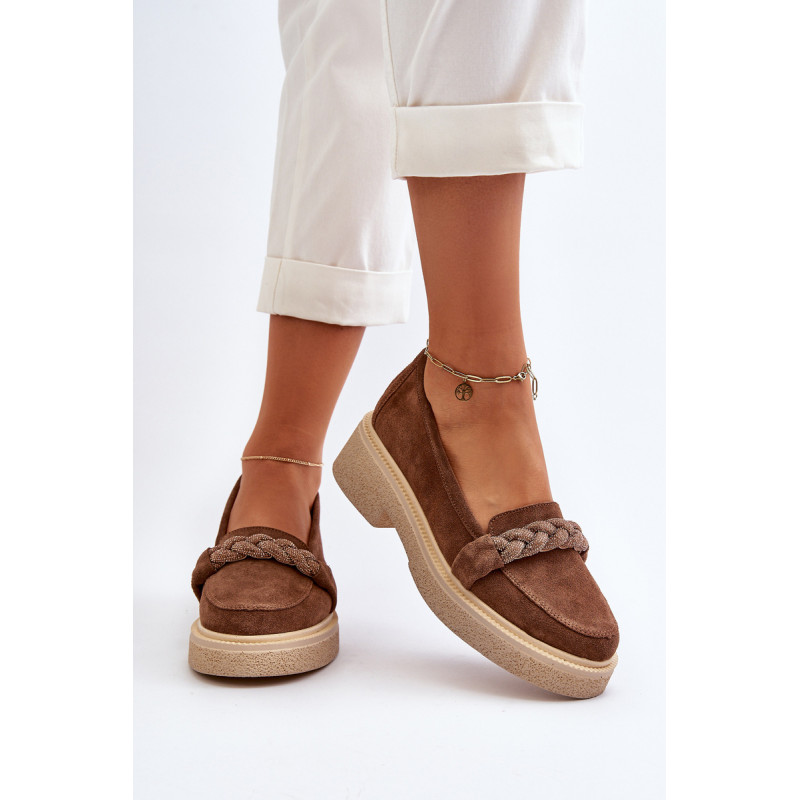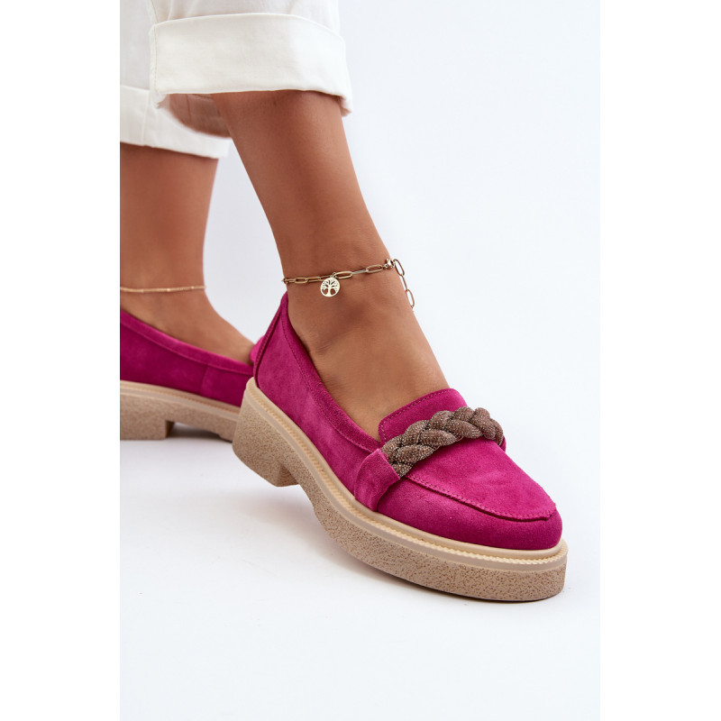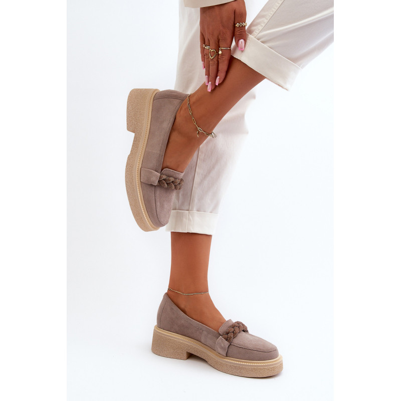 Žavūs moteriški mokasinai, pagaminti iš natūralios zomšos. Jie turi plokščią kulną su subtilia platforma, kuri užtikrina stabilumą ir patogumą dėvint. Suapvalinti kojų pirštai suteikia jiems subtilaus žavesio. Profiliuotas vidpadis garantuoja patogumą naudojimo metu. Papildomos elegancijos suteikia nedideli cirkoniai, uždėti ant dirželio priekyje. Jūs tikrai turėtumėte juos turėti savo pavasario garderobe! Rinkdamiesi dydį žiūrėkite dydžių lentelę.