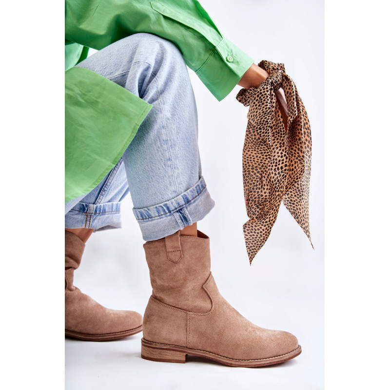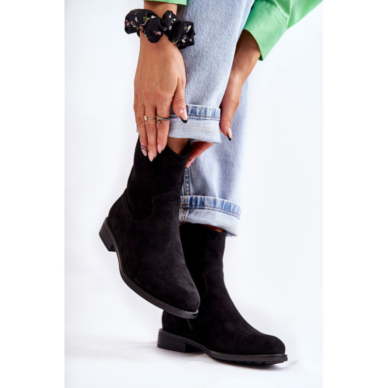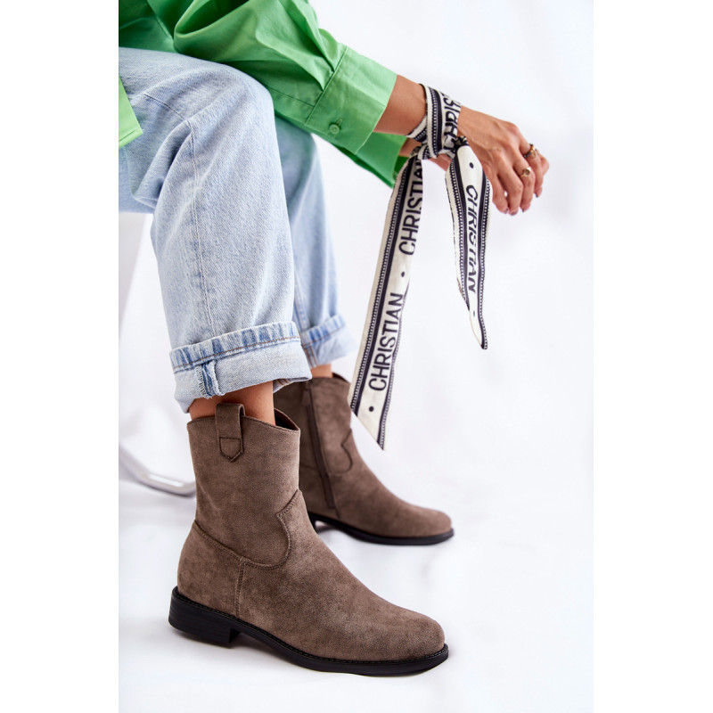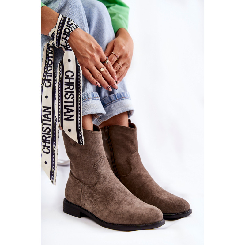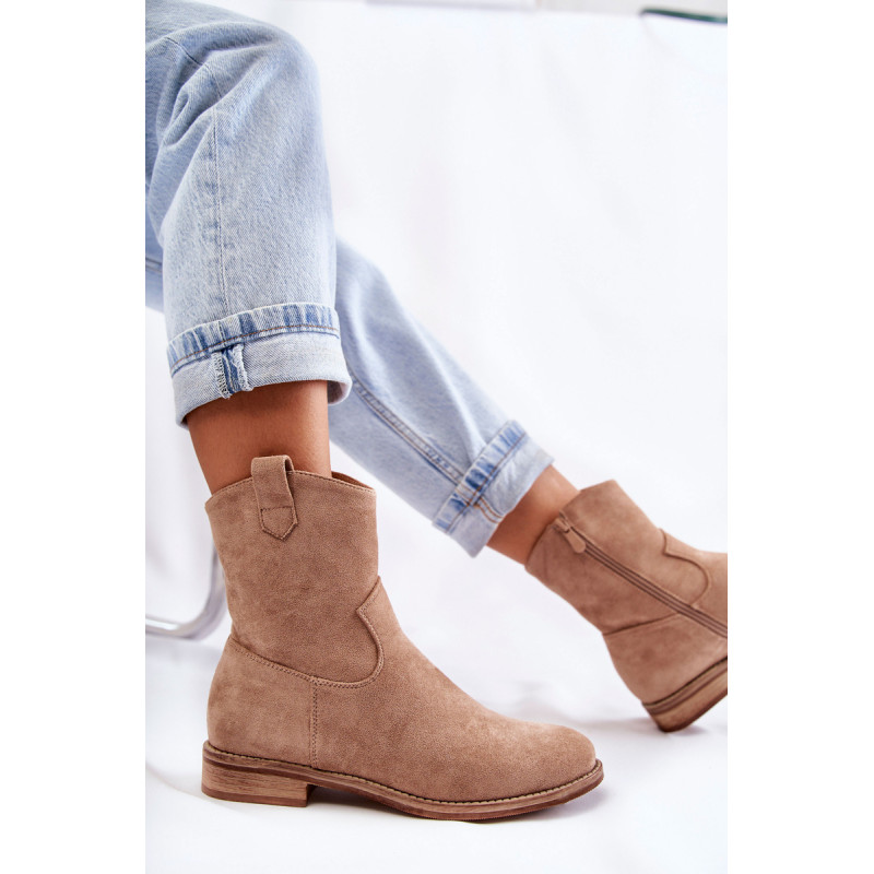 Klasikiniai moteriški batai yra pagaminti iš malonios liesti ekologiškos zomšos. Viršutinė dalis turi subtilių siūlių. Šiame modelyje yra kilpa, kuri palengvina batų avimą išorėje. Batai taip pat turi užtrauktuką. Nustatykite ant plokščio kulno. Jie turi standintą kulną ir eko odos įdėklą. Renkantis dydį, naudokite dydžių lentelę.