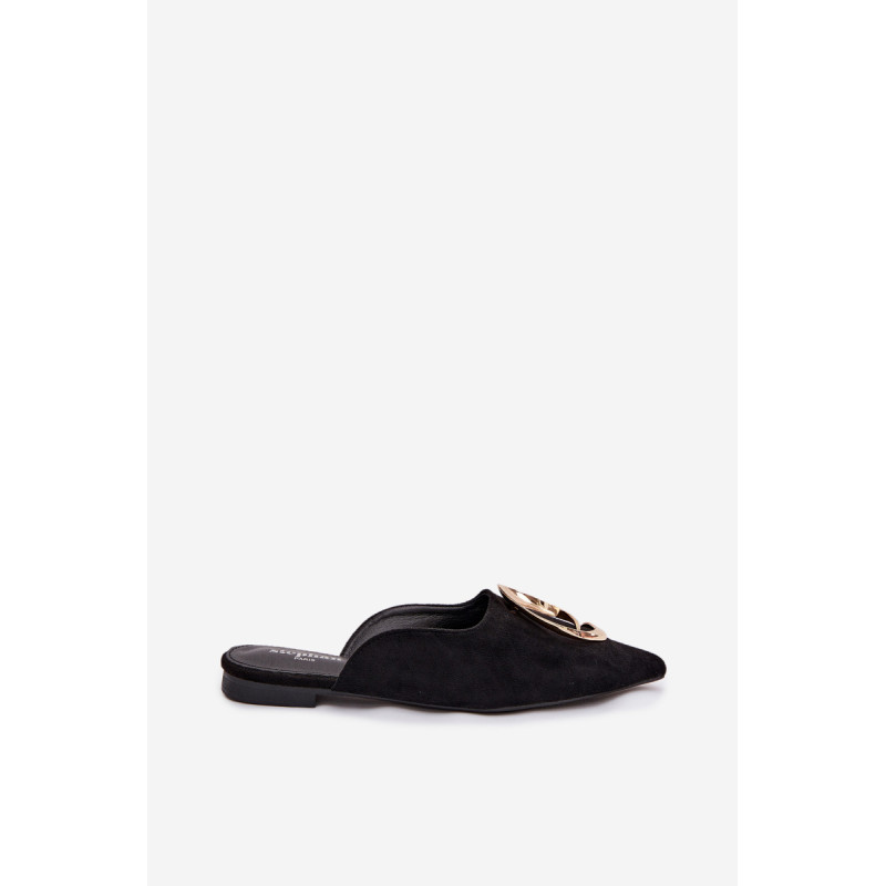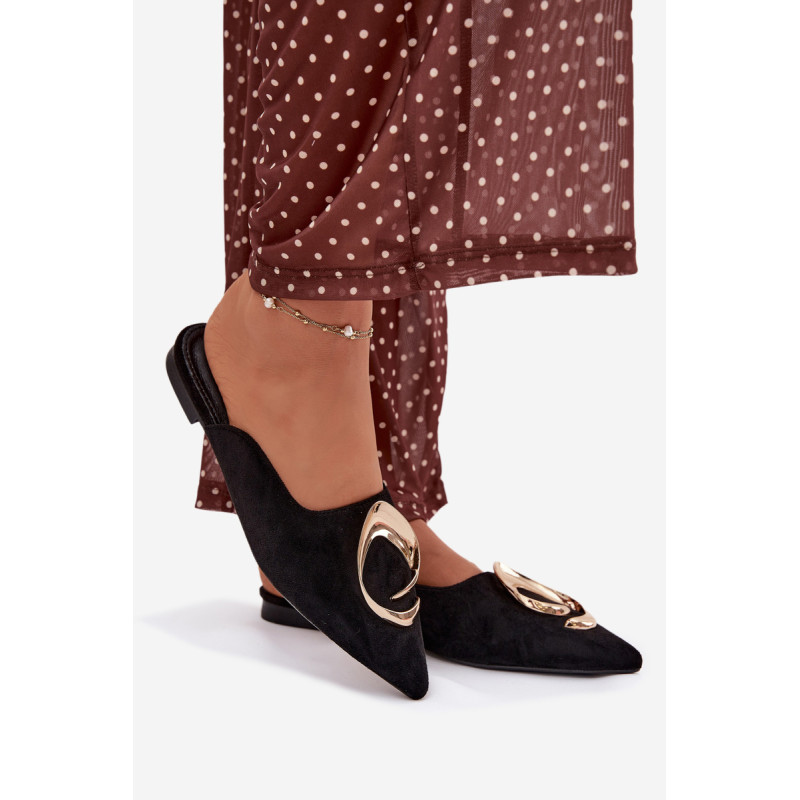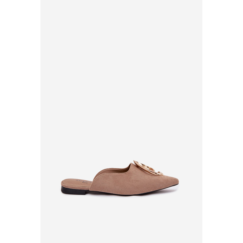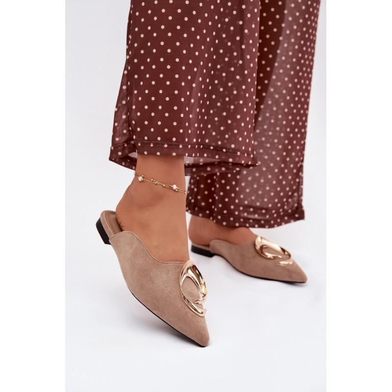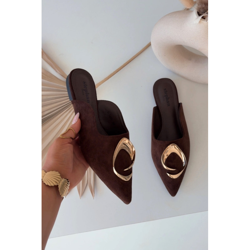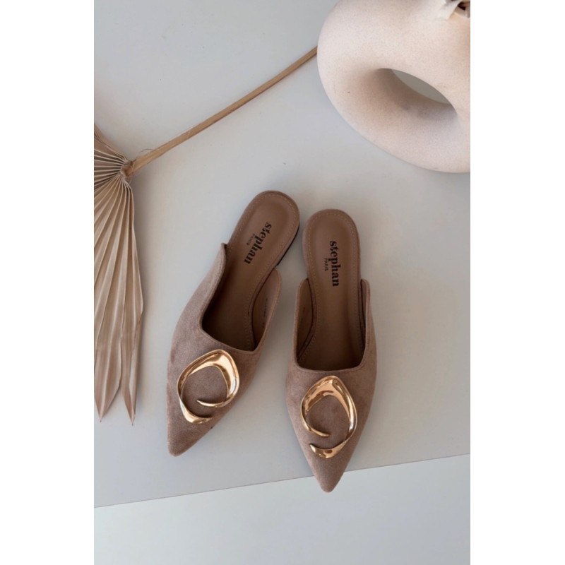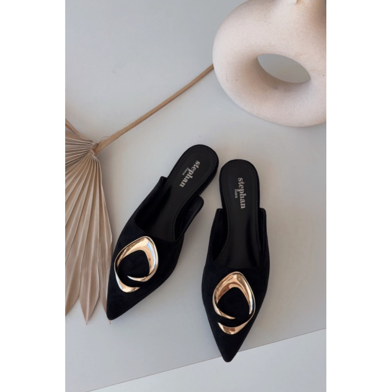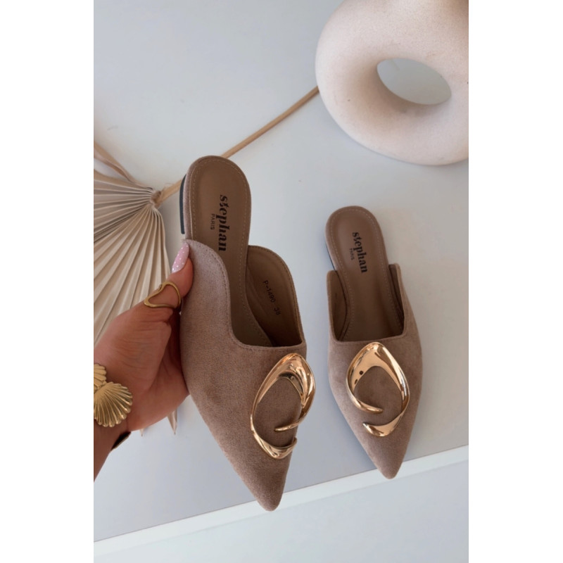 Moteriški mule batai, pagaminti iš ekologiško zomšiaus, yra stilingas pasiūlymas su elegantišku charakteriu. Uždaryti, smaili nosis suteikia modeliui klasikinę formą, o didelis auksinis detalės priekyje yra įspūdingas akcentas, patraukiantis dėmesį. Plokščias kulnas užtikrina patogumą dėvint. Šis modelis puikiai papildo tiek elegantiškus, tiek kasdienius derinius. Renkantis dydį, vadovaukitės dydžių lentele.