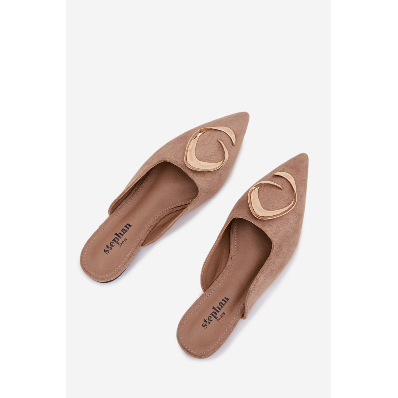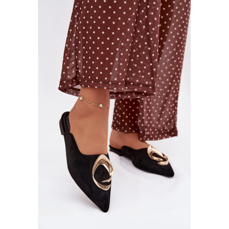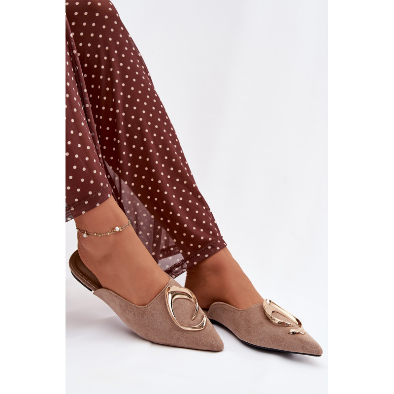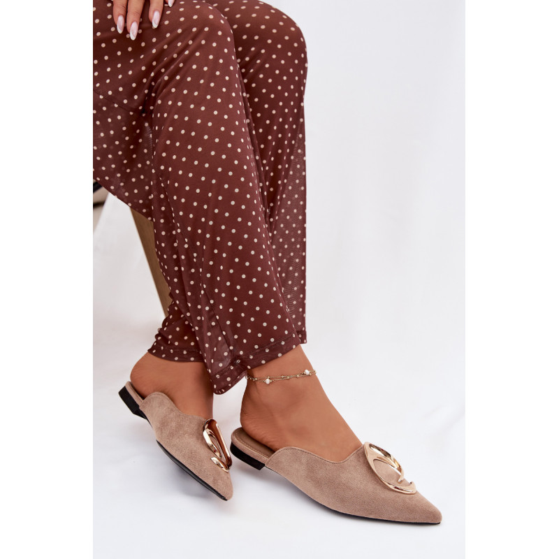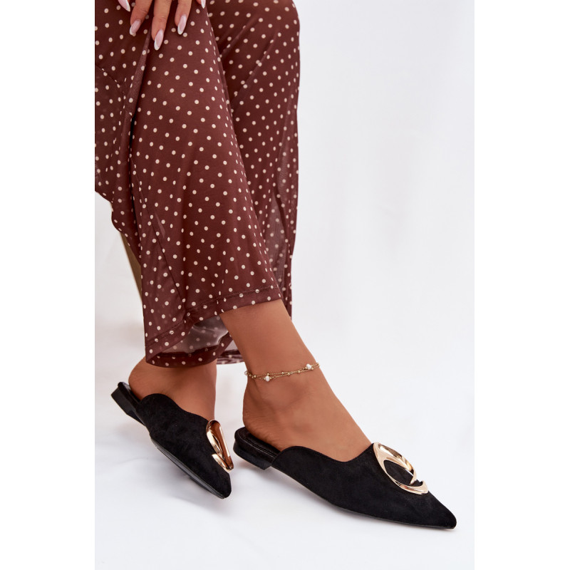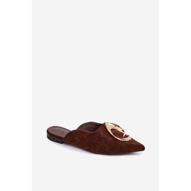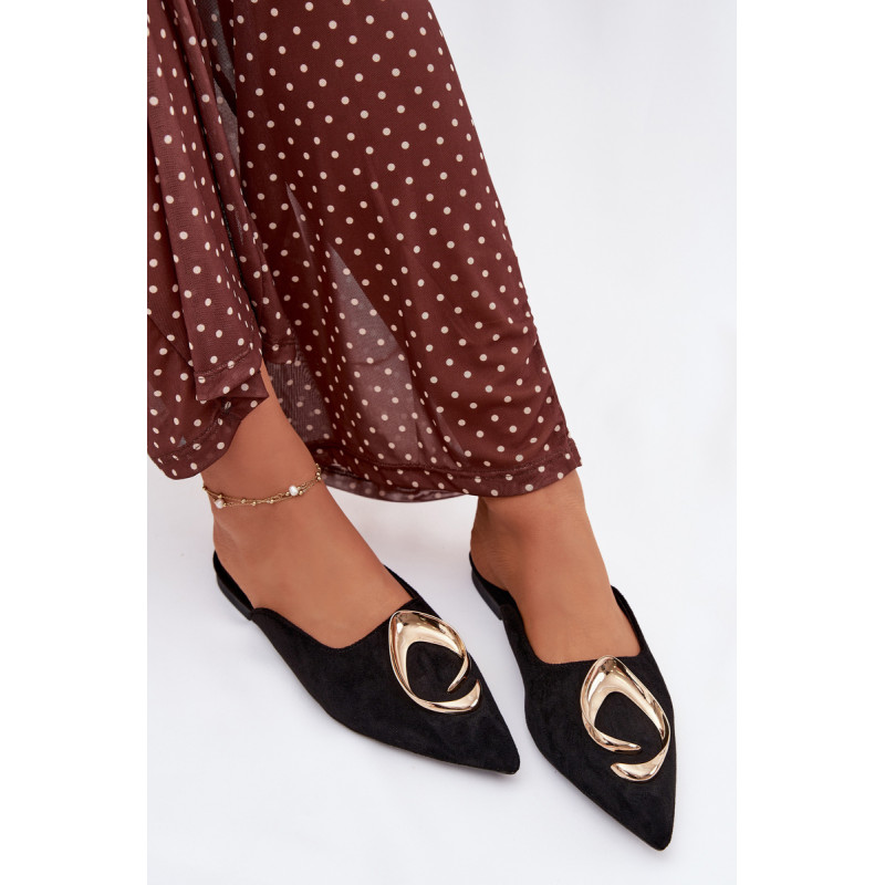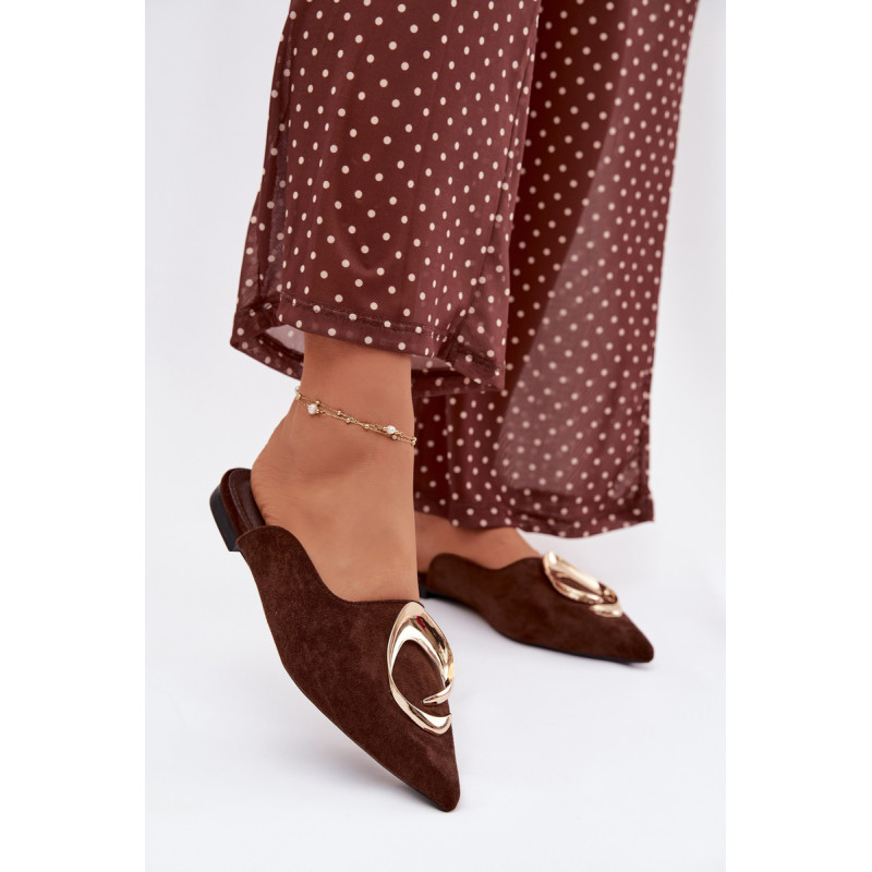 Moteriški mule batai, pagaminti iš ekologiško zomšiaus, yra stilingas pasiūlymas su elegantišku charakteriu. Uždaryti, smaili nosis suteikia modeliui klasikinę formą, o didelis auksinis detalės priekyje yra įspūdingas akcentas, patraukiantis dėmesį. Plokščias kulnas užtikrina patogumą dėvint. Šis modelis puikiai papildo tiek elegantiškus, tiek kasdienius derinius. Renkantis dydį, vadovaukitės dydžių lentele.