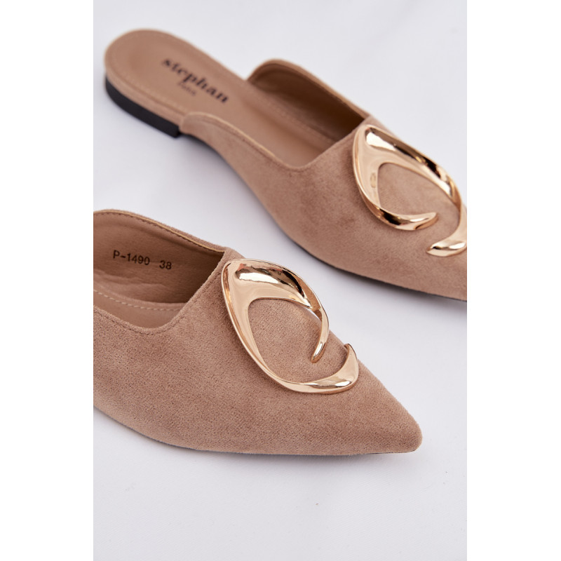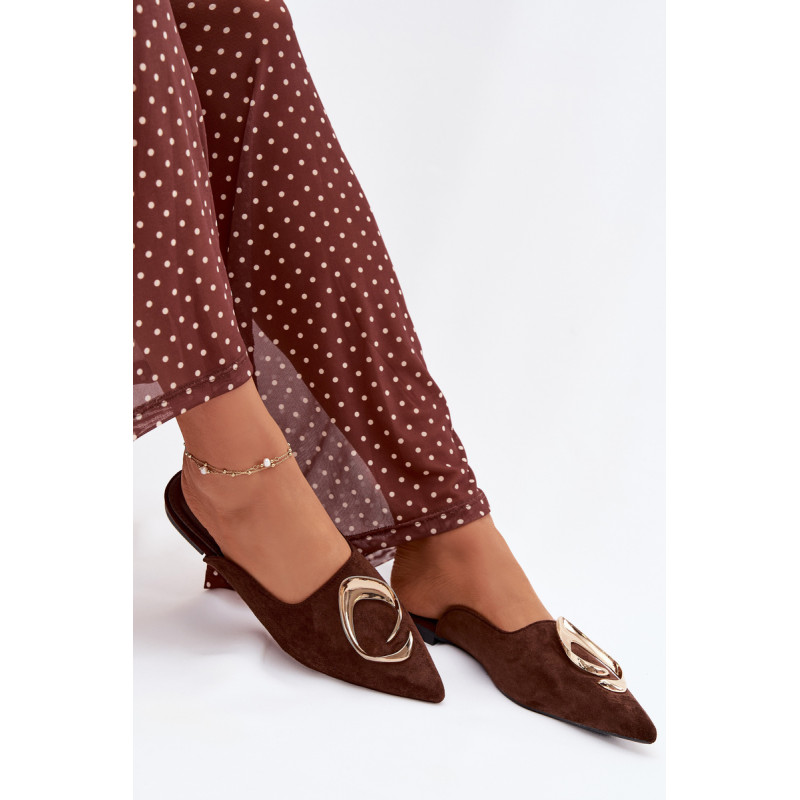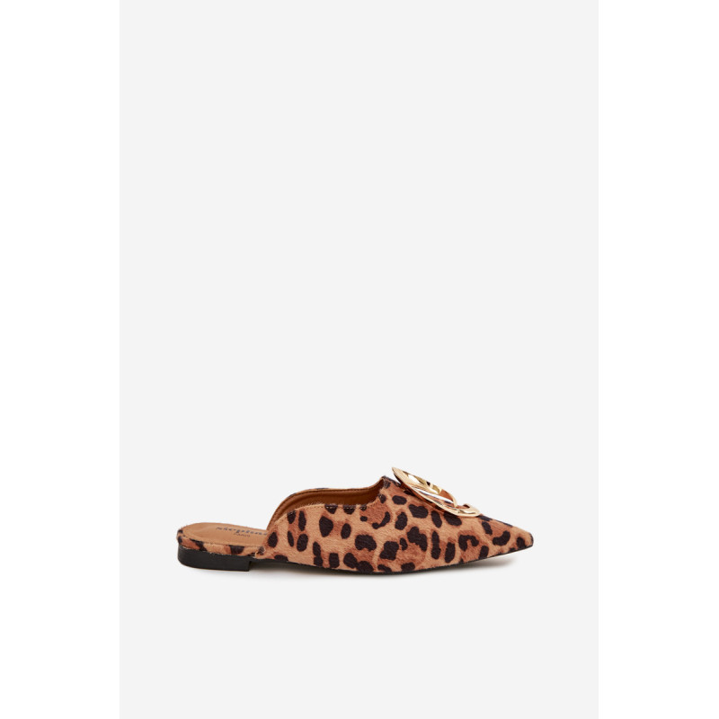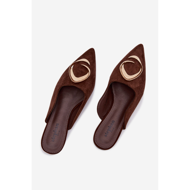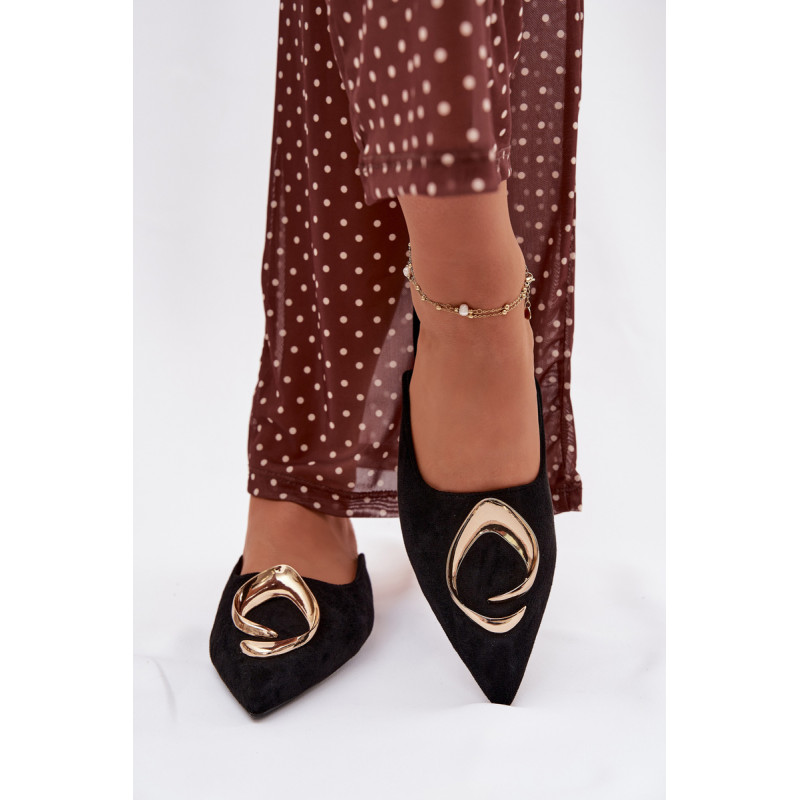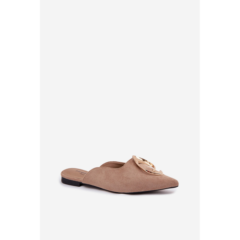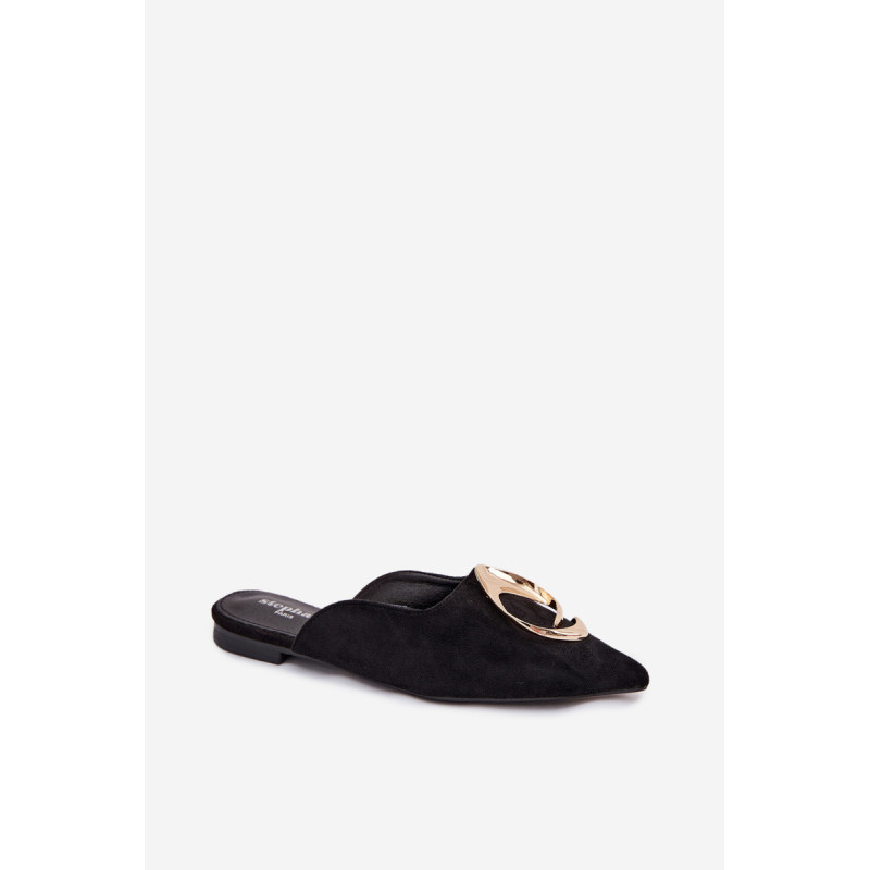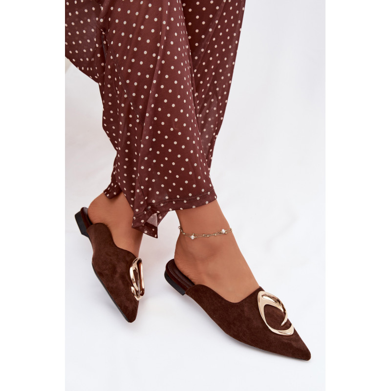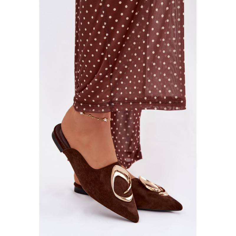 Moteriški mule batai, pagaminti iš ekologiško zomšiaus, yra stilingas pasiūlymas su elegantišku charakteriu. Uždaryti, smaili nosis suteikia modeliui klasikinę formą, o didelis auksinis detalės priekyje yra įspūdingas akcentas, patraukiantis dėmesį. Plokščias kulnas užtikrina patogumą dėvint. Šis modelis puikiai papildo tiek elegantiškus, tiek kasdienius derinius. Renkantis dydį, vadovaukitės dydžių lentele.