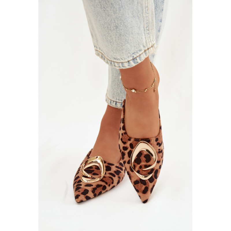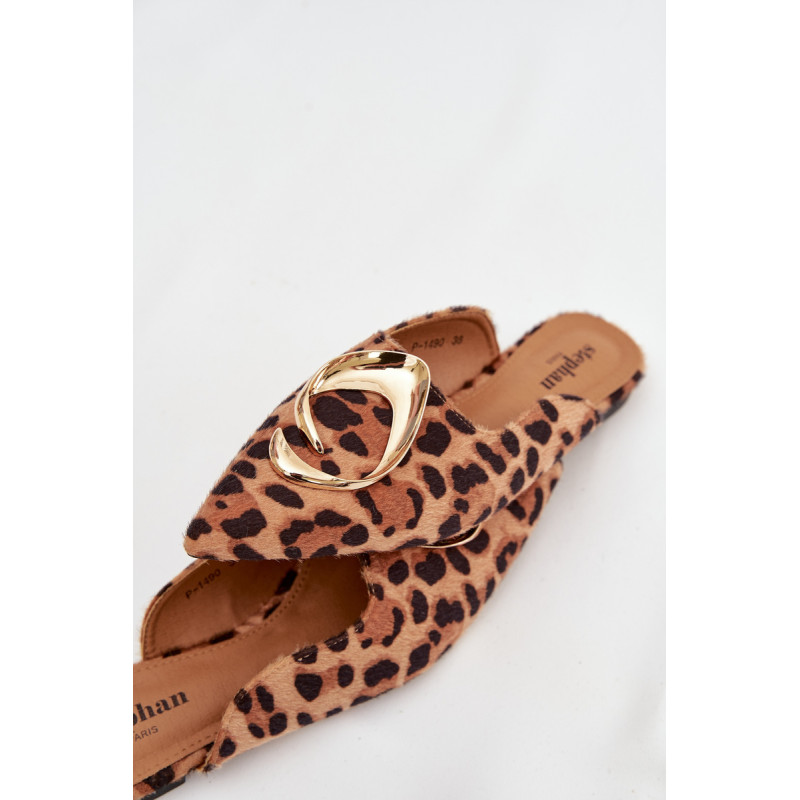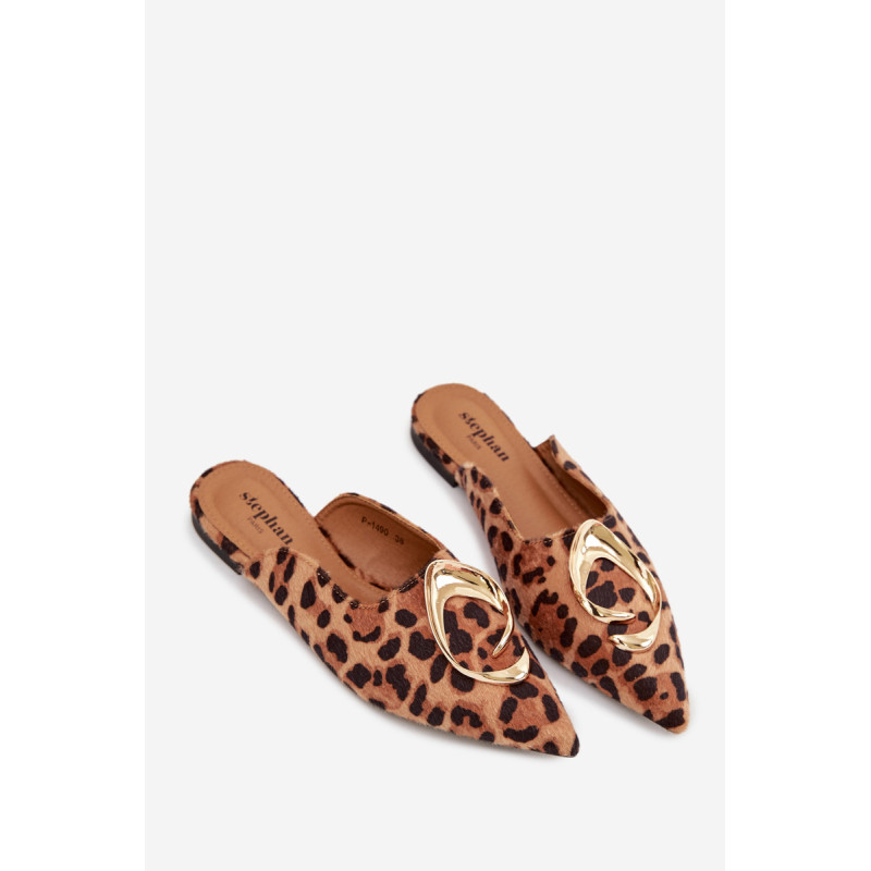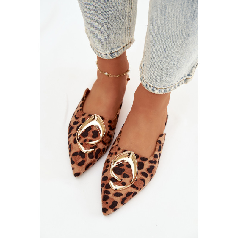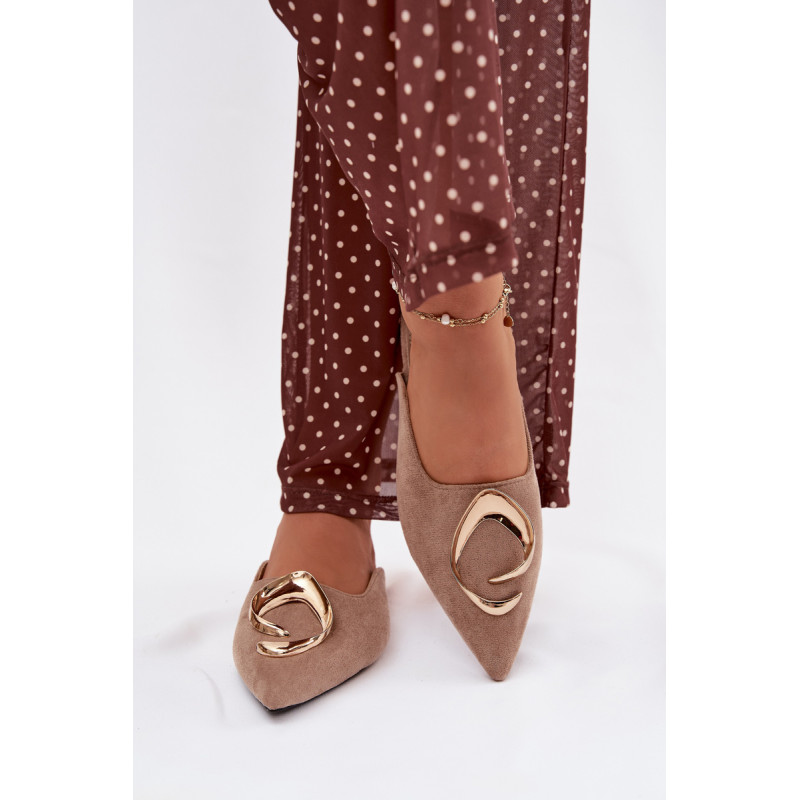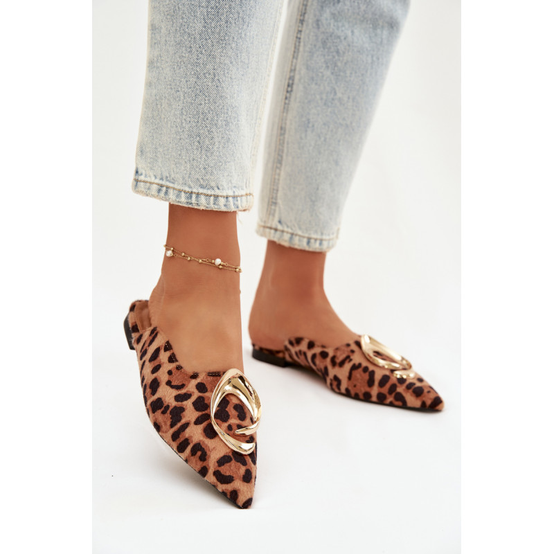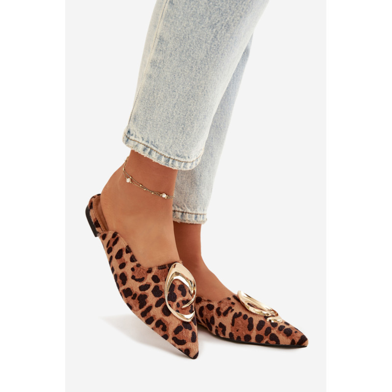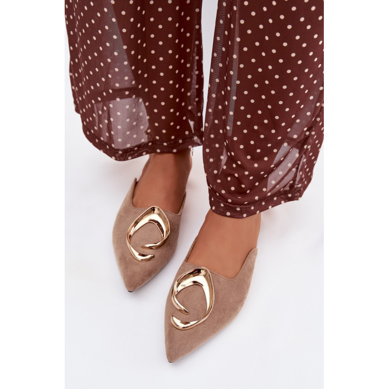 Moteriški mule batai, pagaminti iš ekologiško zomšiaus, yra stilingas pasiūlymas su elegantišku charakteriu. Uždaryti, smaili nosis suteikia modeliui klasikinę formą, o didelis auksinis detalės priekyje yra įspūdingas akcentas, patraukiantis dėmesį. Plokščias kulnas užtikrina patogumą dėvint. Šis modelis puikiai papildo tiek elegantiškus, tiek kasdienius derinius. Renkantis dydį, vadovaukitės dydžių lentele.