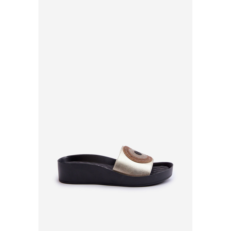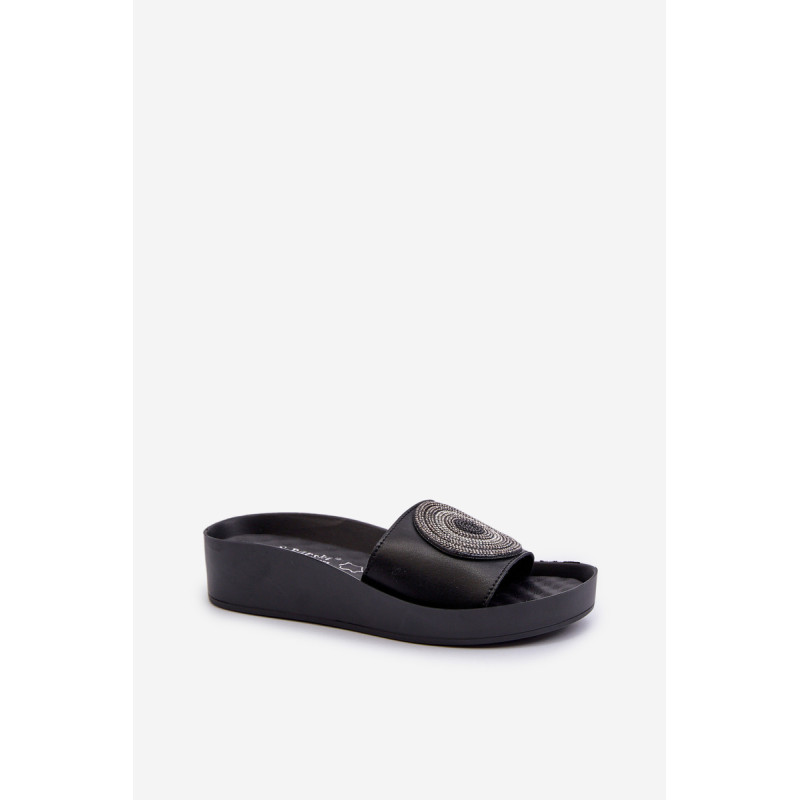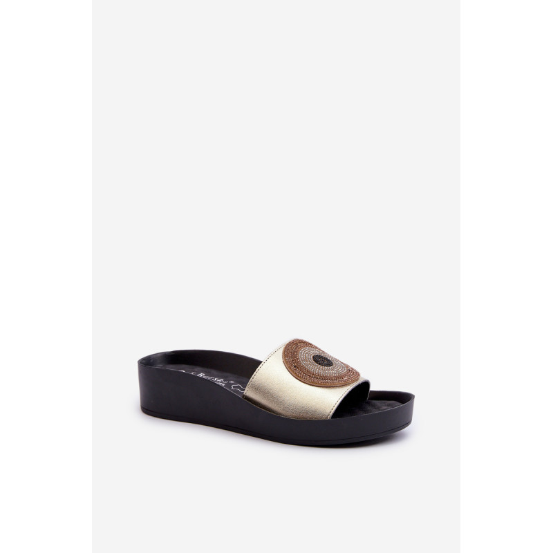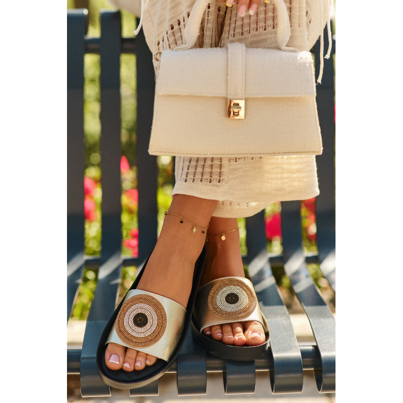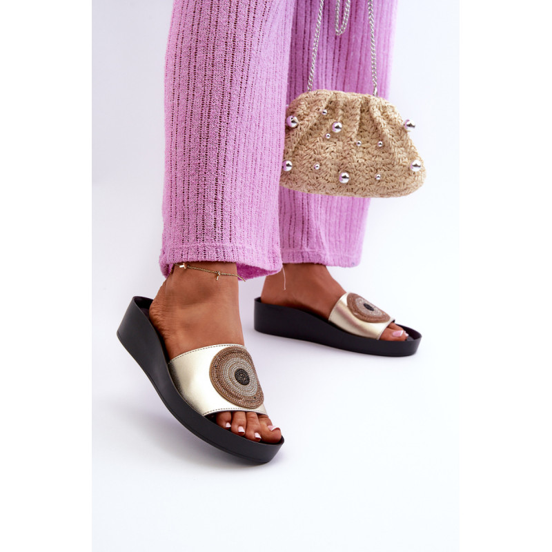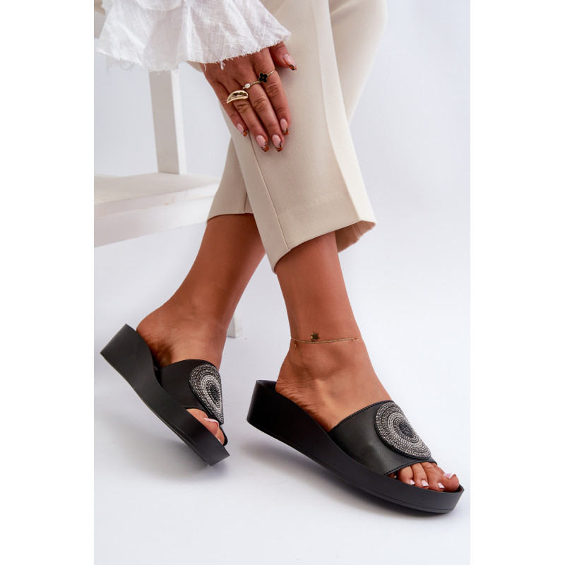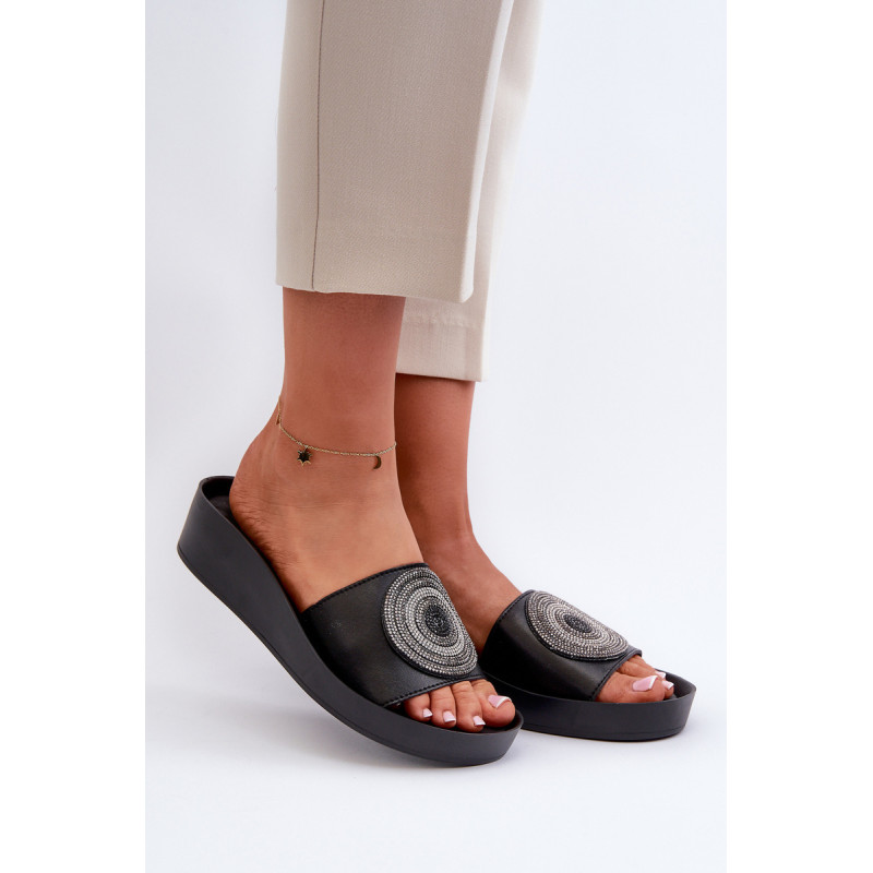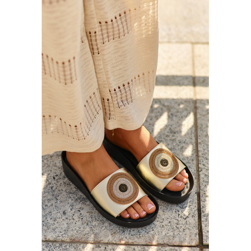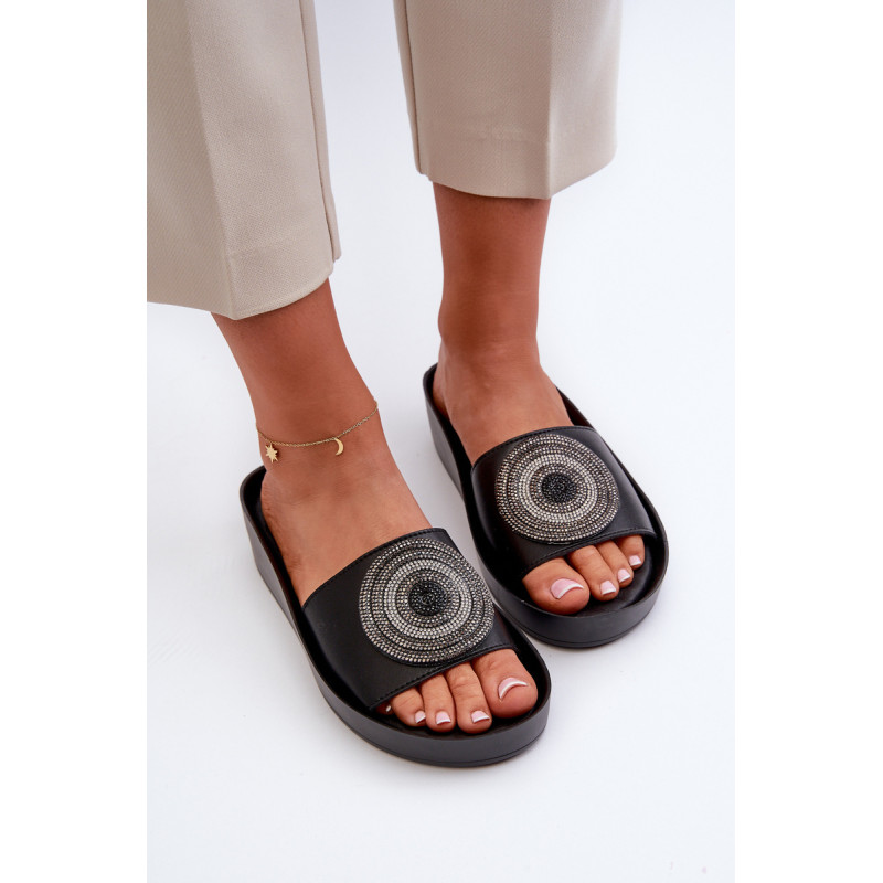 Moteriškos odinės šlepetės yra elegancijos ir patogumo derinys. Pastatykite ant stabilios platformos su subtiliu pleištu. Šis modelis išsiskiria blizgančiu ornamentu ant dirželio. Comfort odinis vidpadis užtikrina išskirtinį komfortą nešiojant visą dieną. Rinkdamiesi dydį, žiūrėkite dydžių lentelę.