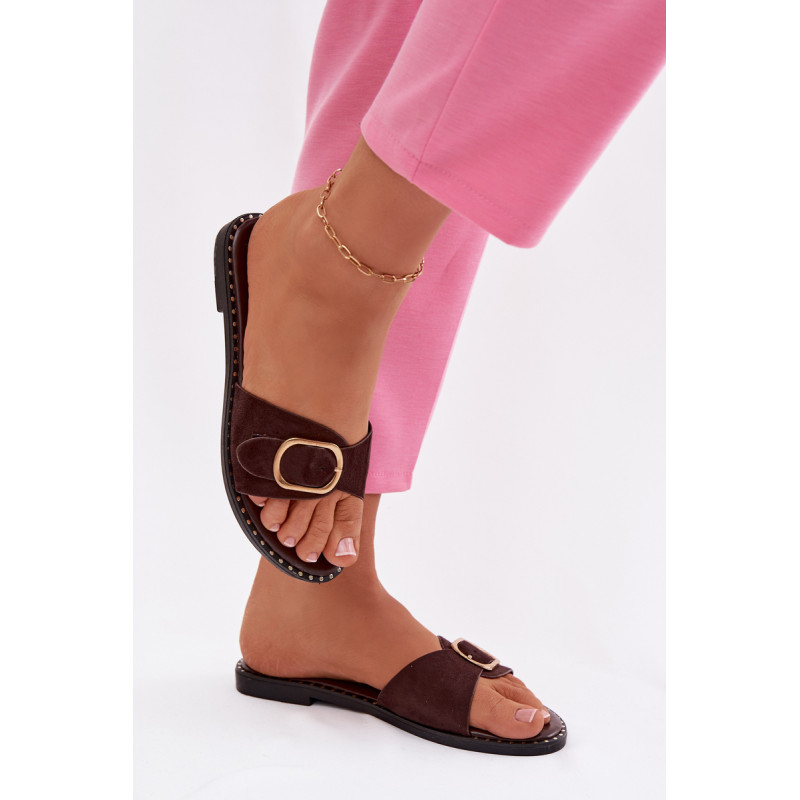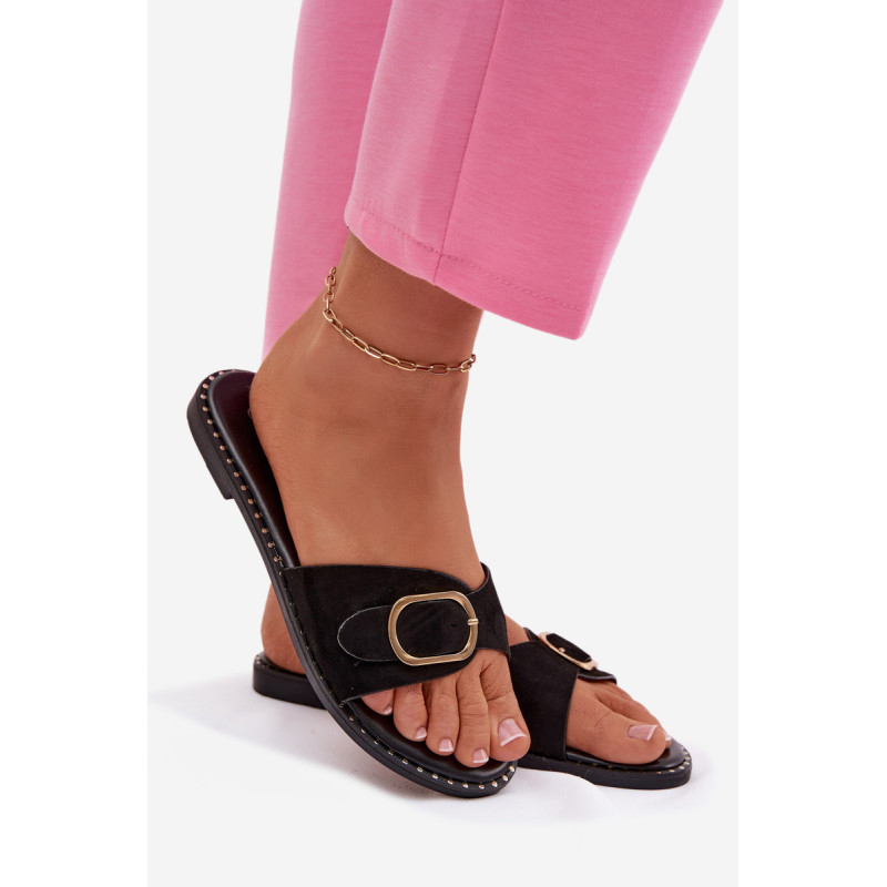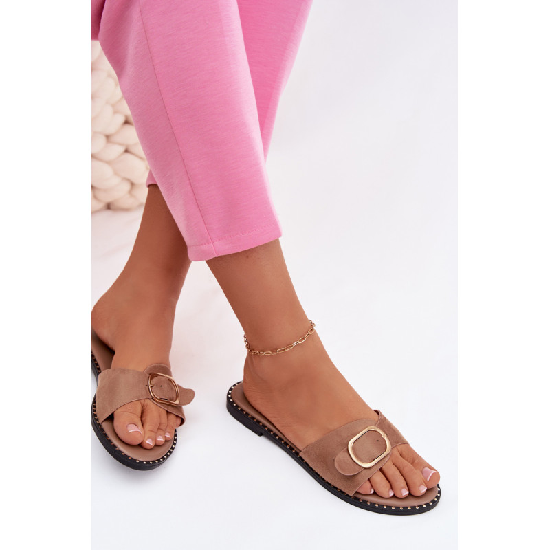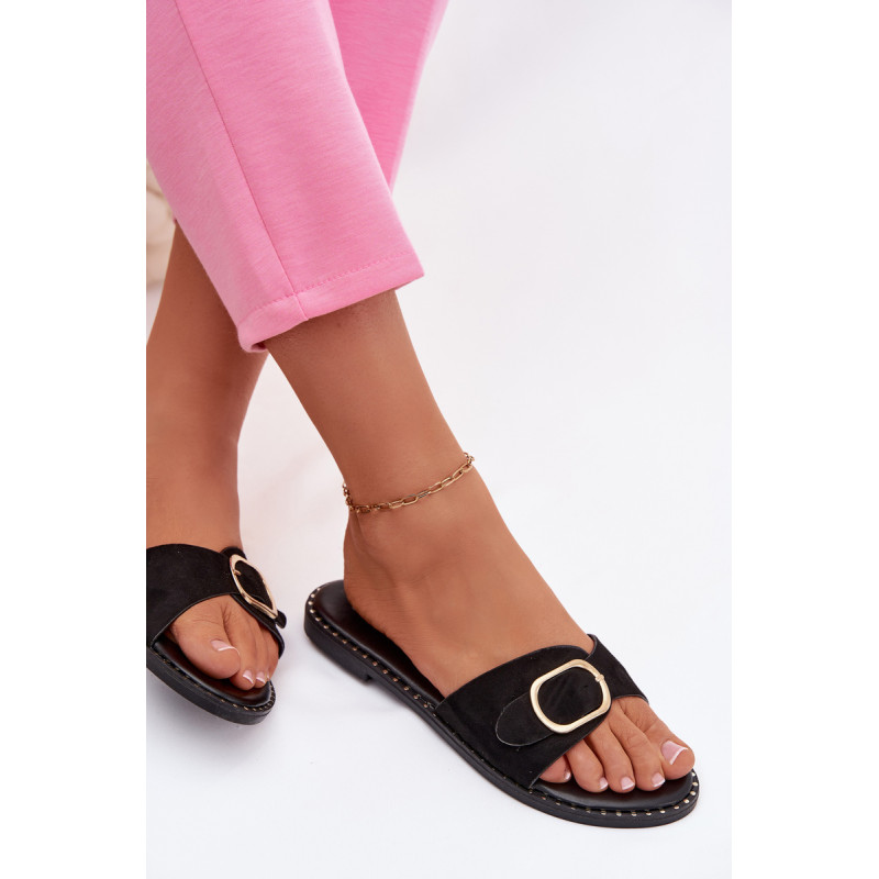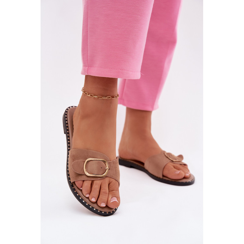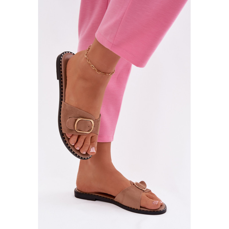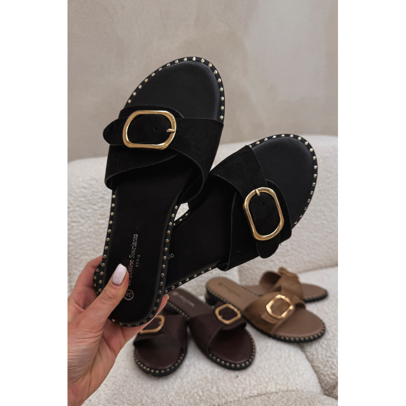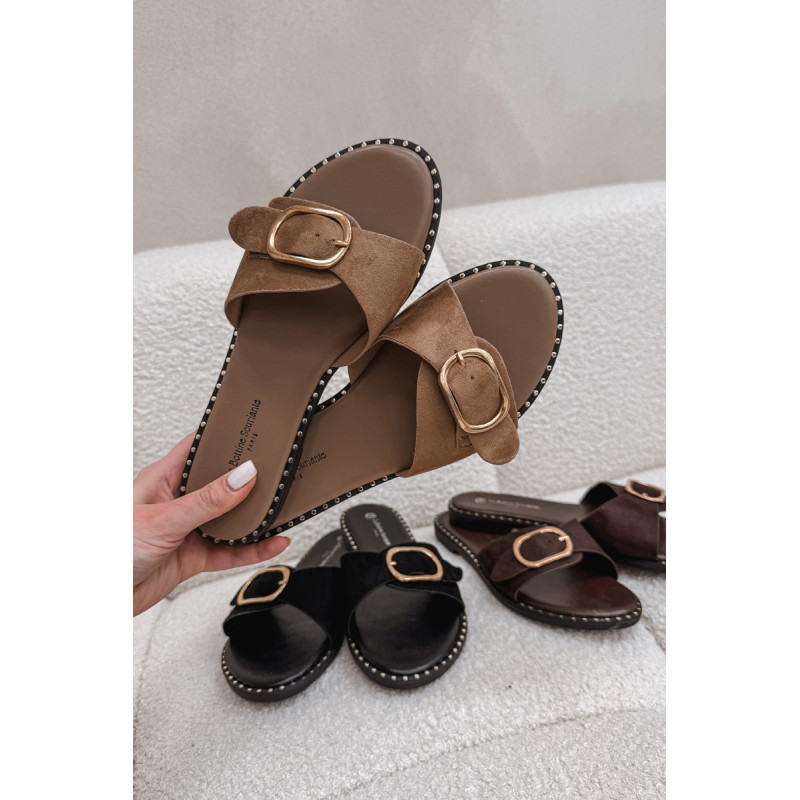 Stilingos moteriški basutės su plokščia padais yra patogus ir elegantiškas pasirinkimas šiltiems dienoms. Juostos, pagamintos iš eko zomšos, papuoštos auksine sagtimi, suteikia visumui rafinuotą charakterį ir yra įspūdingas akcentas. Paprastas dizainas leidžia šias basutes derinti tiek prie kasdieninių, tiek prie elegantiškesnių vasaros aprangos. Renkantis dydį, vadovaukitės dydžių lentele.