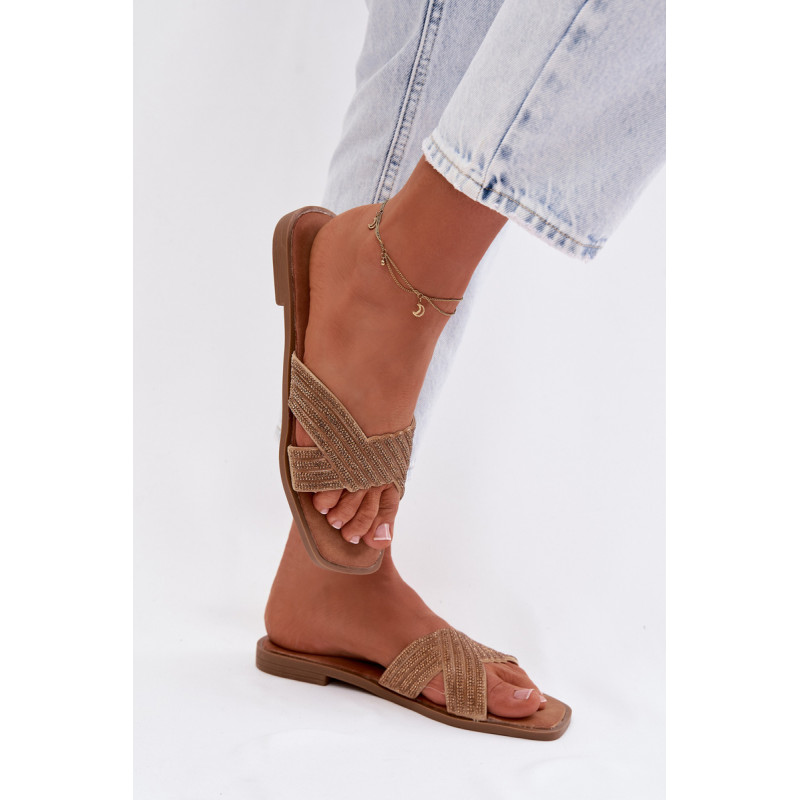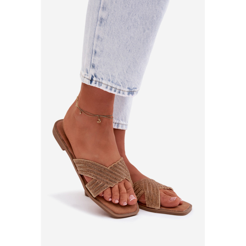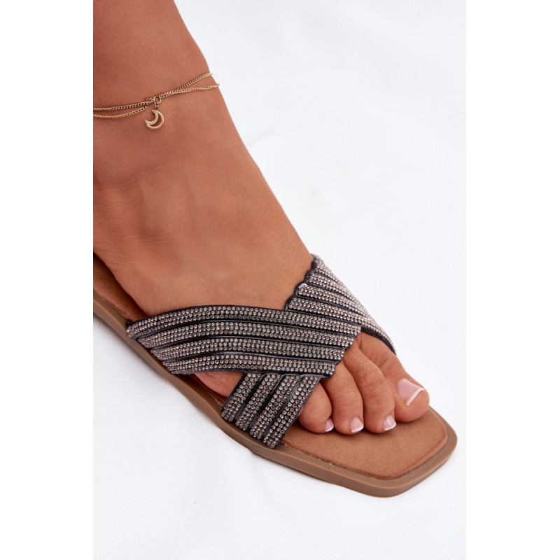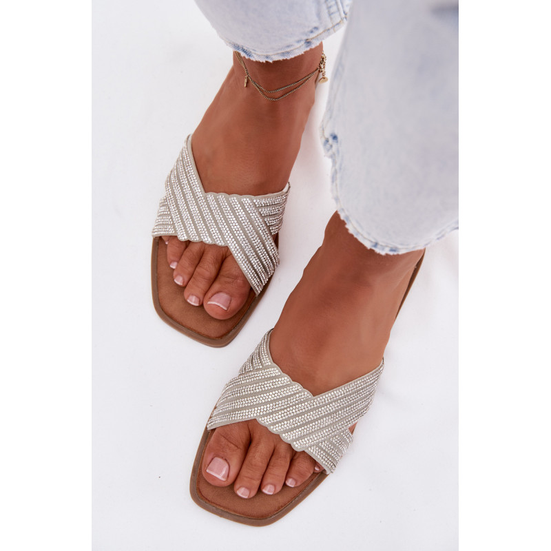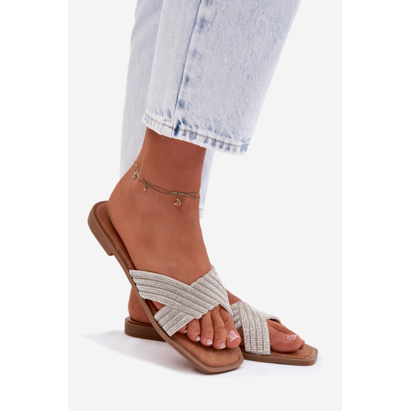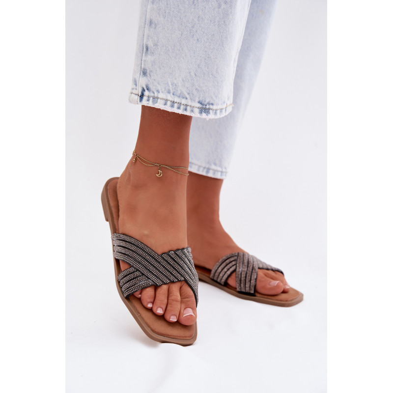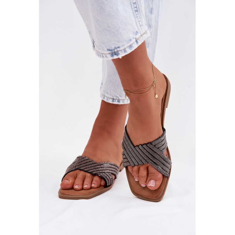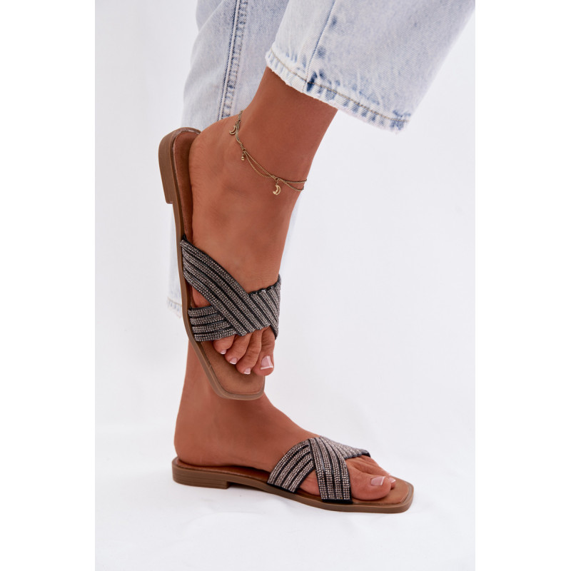 Moteriškos plokščios šlepetės yra stilingas pasirinkimas šiltiems orams. Juostos, papuoštos kristalais, patraukia dėmesį ir suteikia visumai subtilų žvilgesį. Paprastas dizainas užtikrina patogumą, todėl jos puikiai tinka tiek kasdieniams, tiek elegantiškesniems vasaros įvaizdžiams. Renkantis dydį, vadovaukitės dydžių lentele.