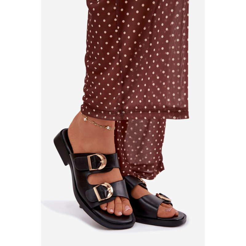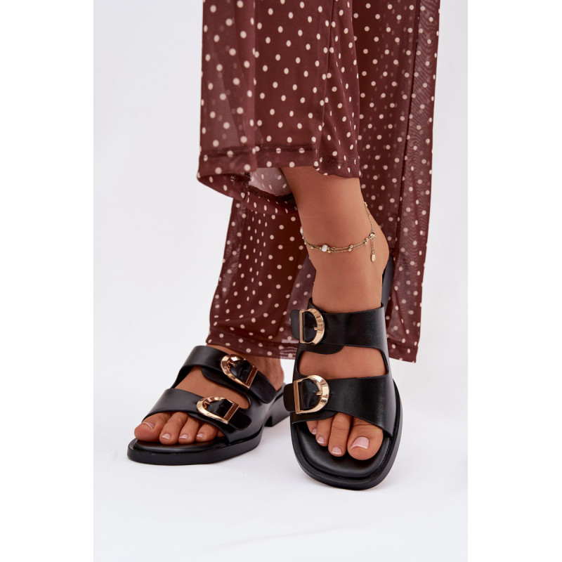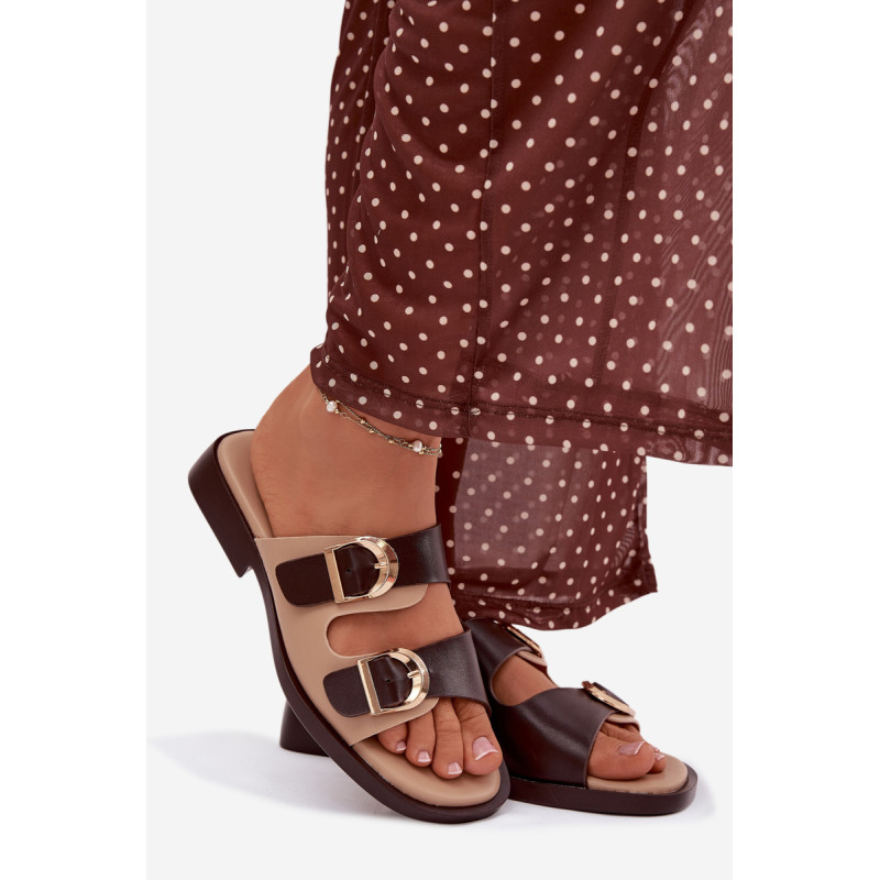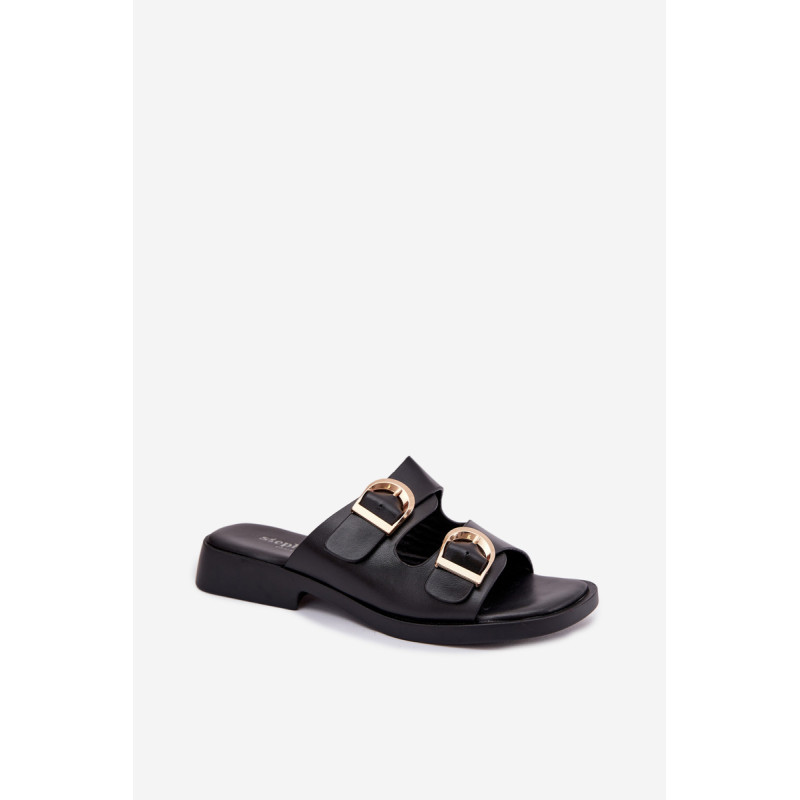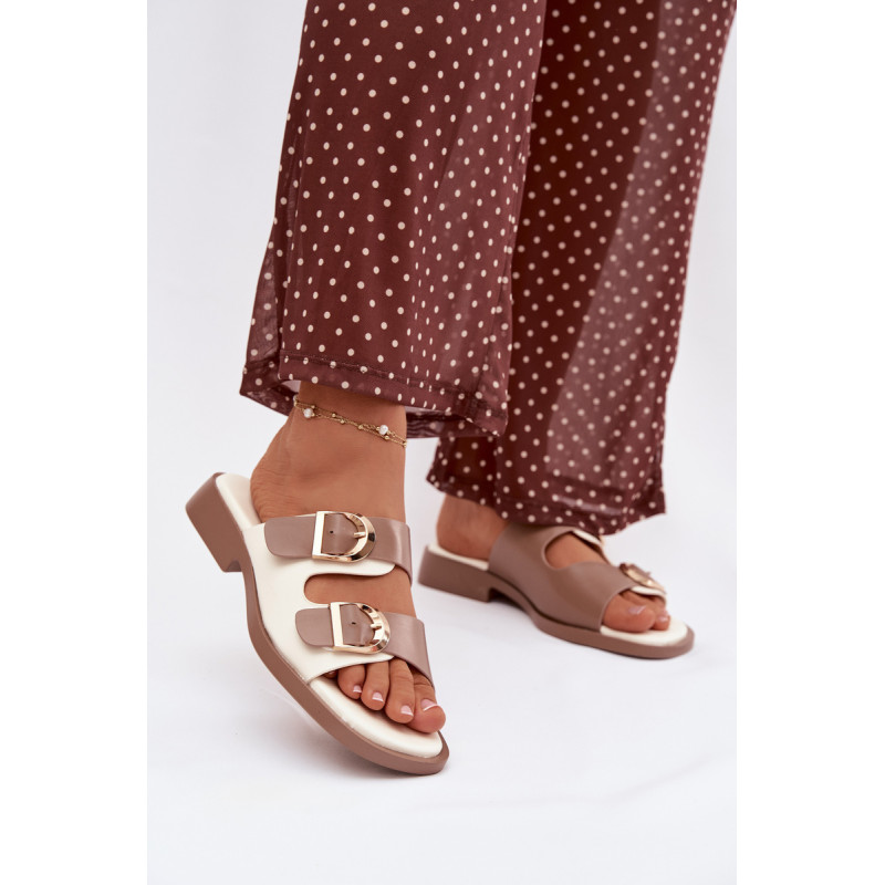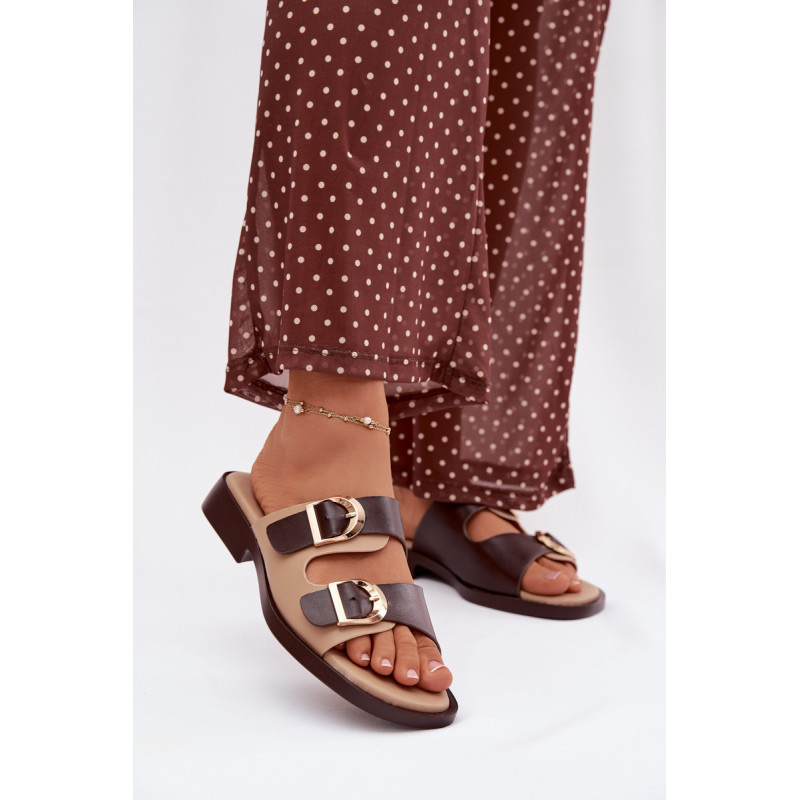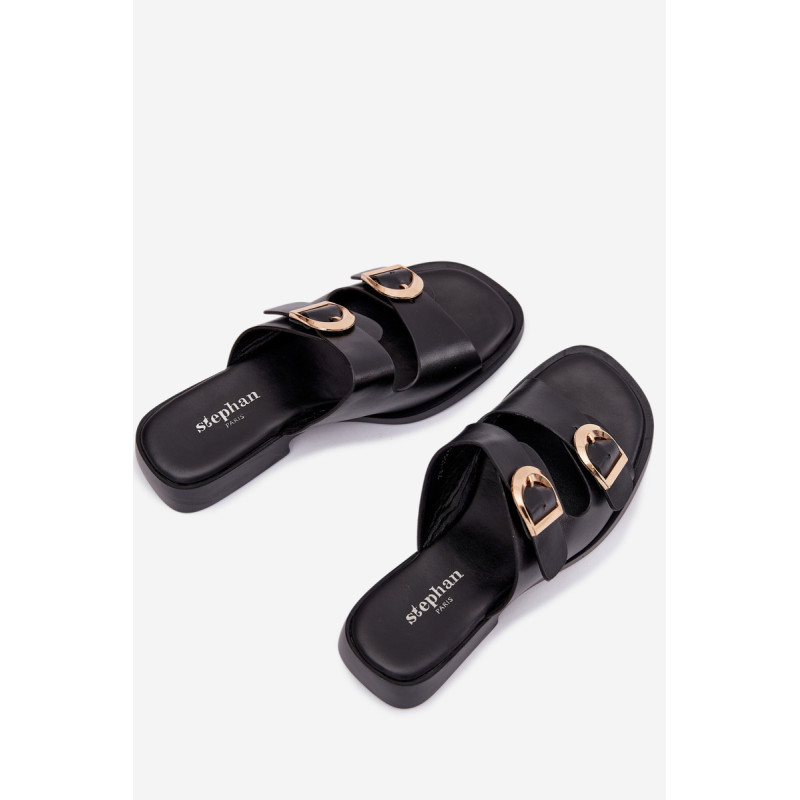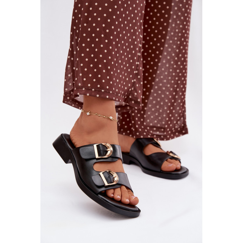 Moteriškos šlepetės iš ekologiškos odos – klasikinis pasirinkimas kasdienai. Modelis turi du dirželius su auksinėmis sagtimis, kurios suteikia visumui elegancijos ir stiliaus. Plokščias kulnas užtikrina patogumą ir laisvę vaikščiojant. Šlepetės puikiai tinka vasaros stiliams, derinamos tiek su suknelėmis, tiek su kasdieniais komplektais. Renkantis dydį, vadovaukitės dydžių lentele.