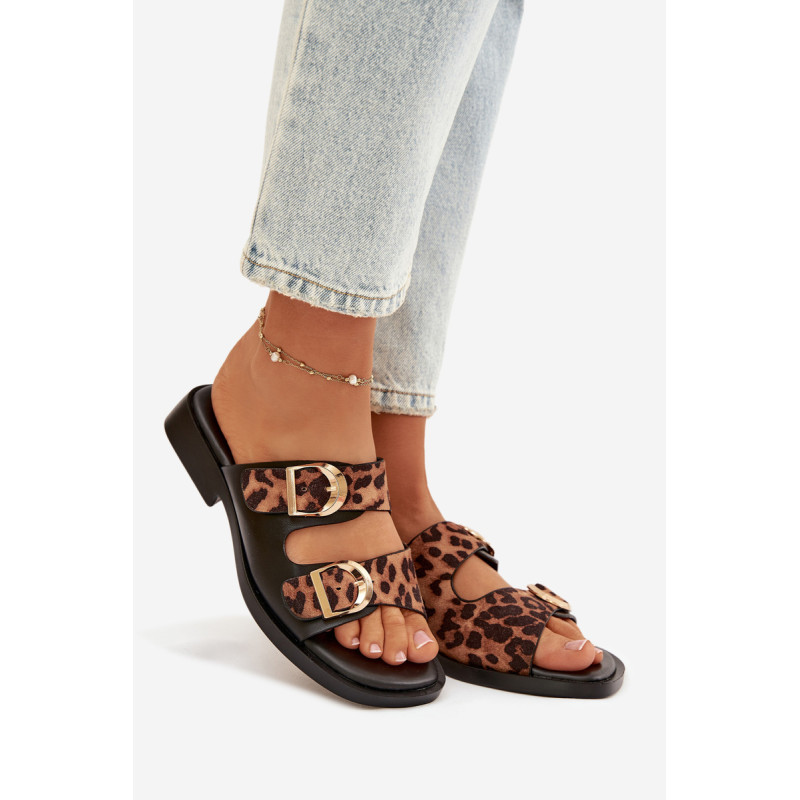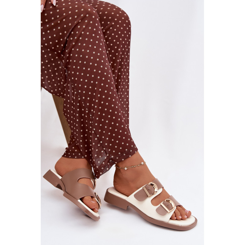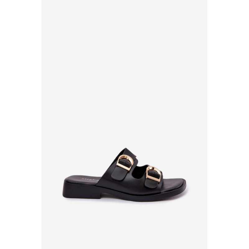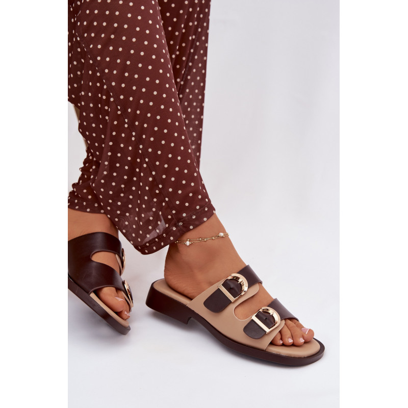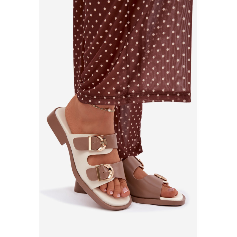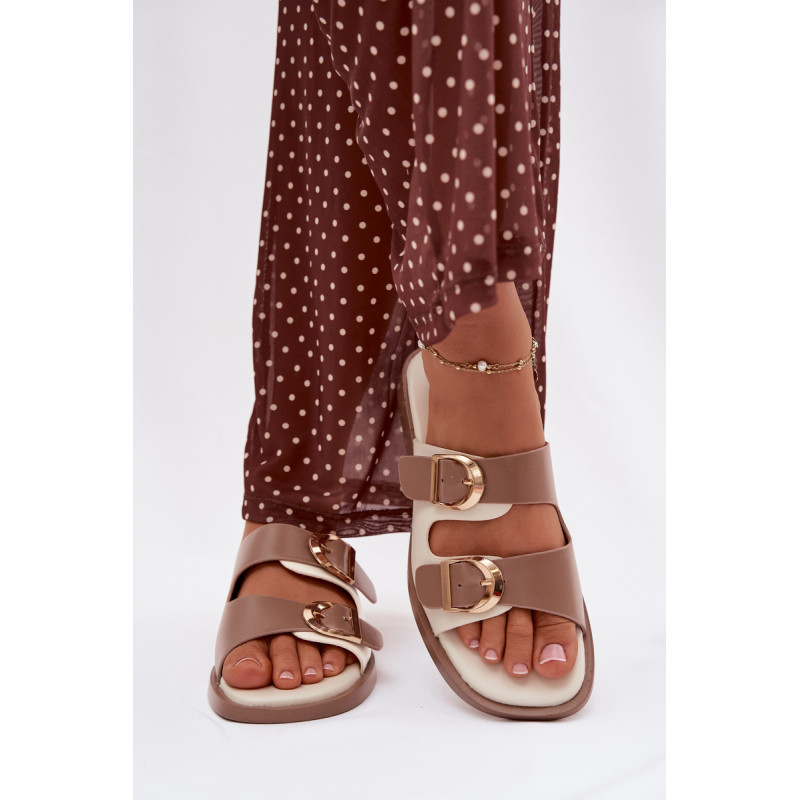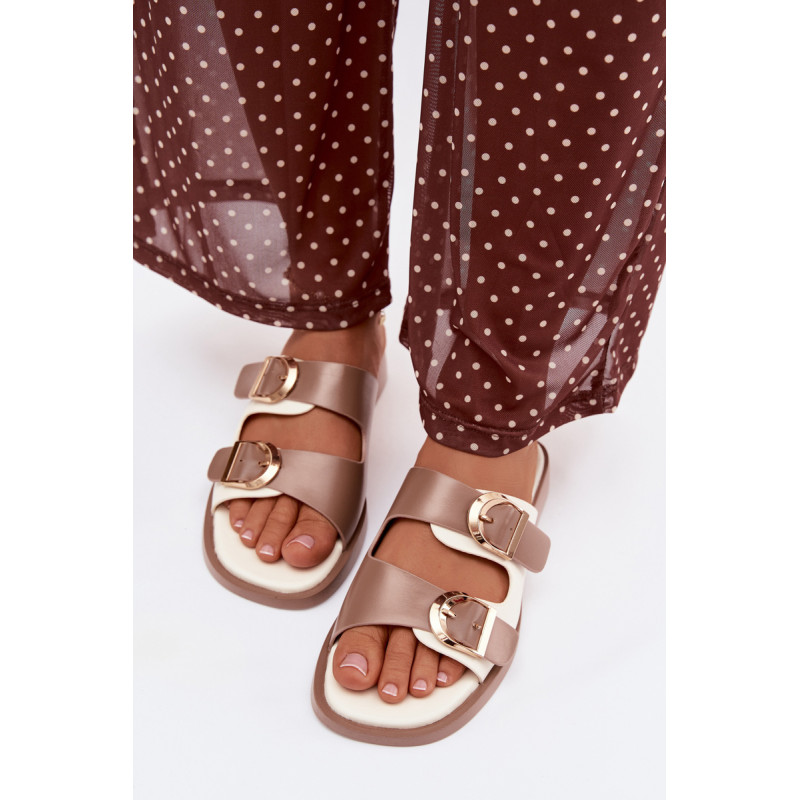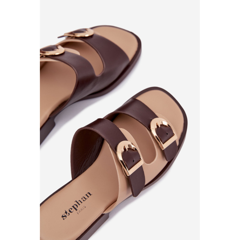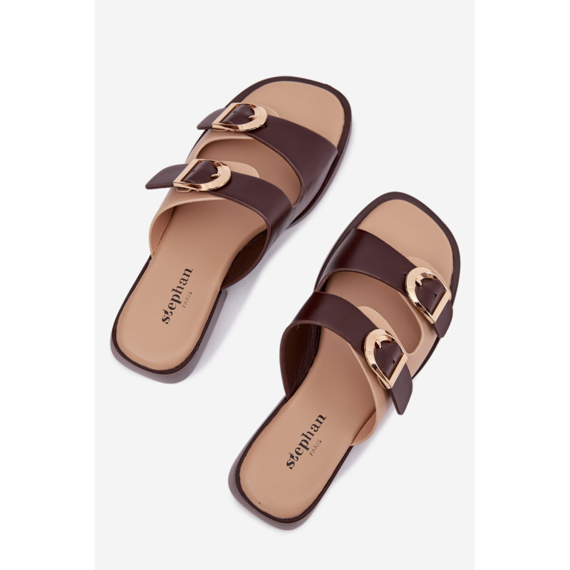 Moteriškos šlepetės iš ekologiškos odos – klasikinis pasirinkimas kasdienai. Modelis turi du dirželius su auksinėmis sagtimis, kurios suteikia visumui elegancijos ir stiliaus. Plokščias kulnas užtikrina patogumą ir laisvę vaikščiojant. Šlepetės puikiai tinka vasaros stiliams, derinamos tiek su suknelėmis, tiek su kasdieniais komplektais. Renkantis dydį, vadovaukitės dydžių lentele.