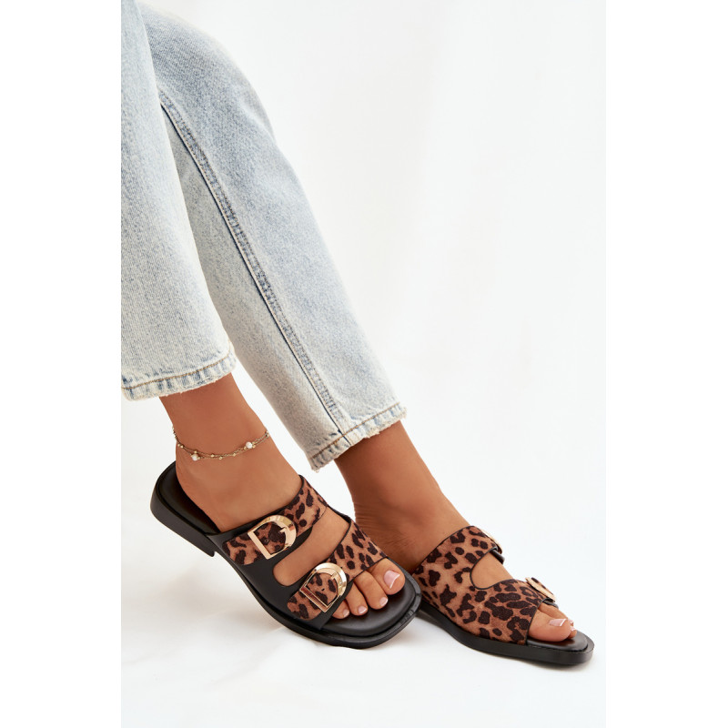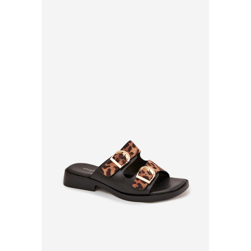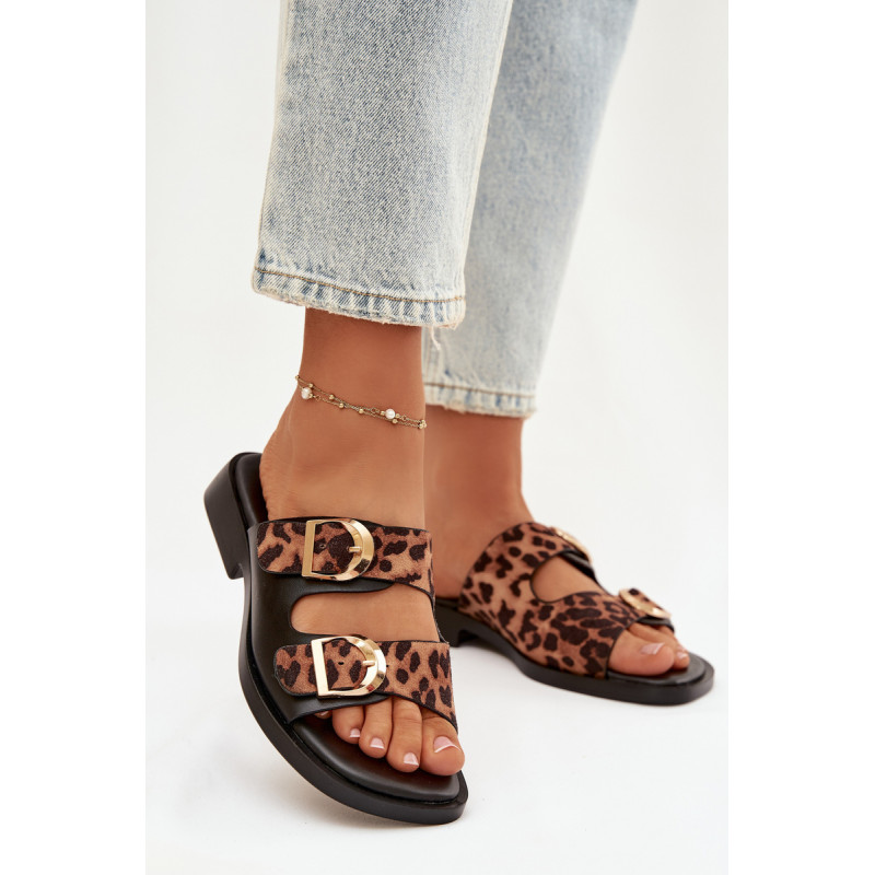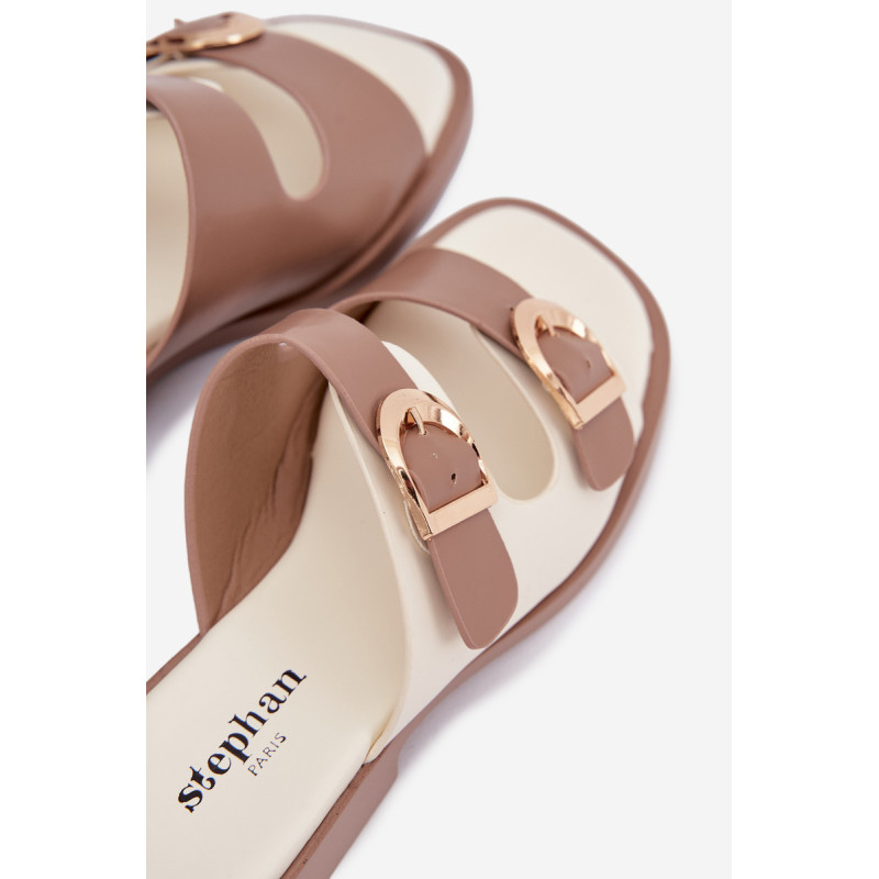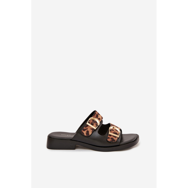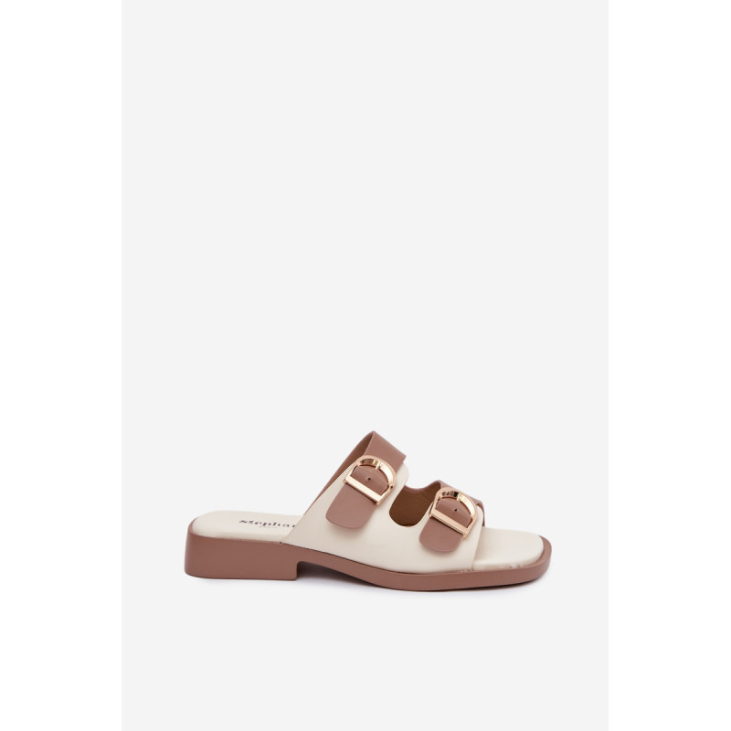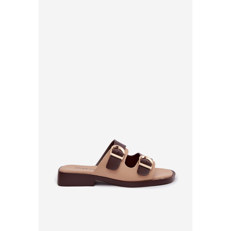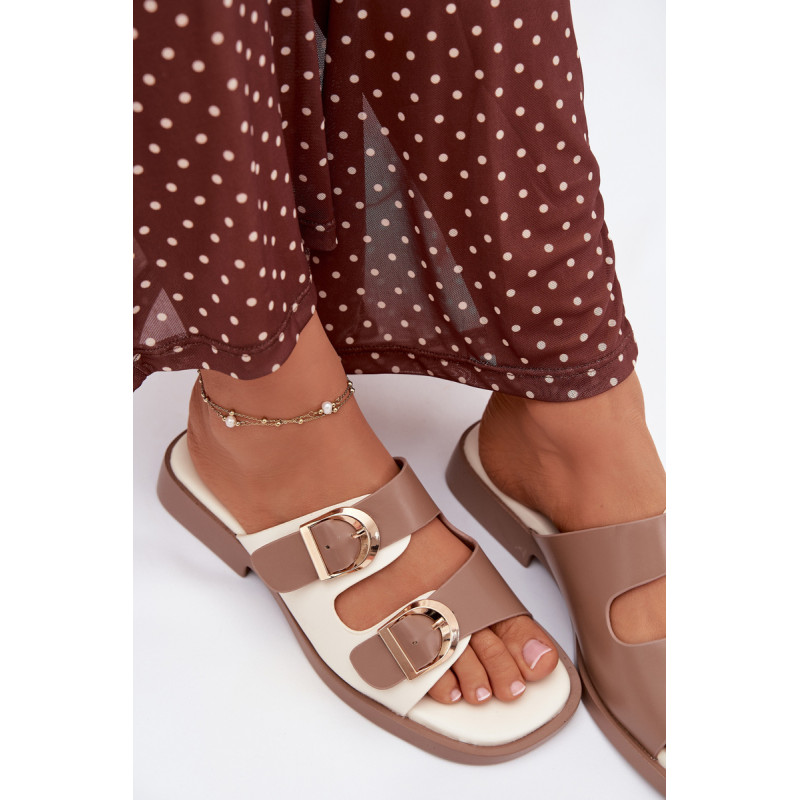Moteriškos šlepetės iš ekologiškos odos – klasikinis pasirinkimas kasdienai. Modelis turi du dirželius su auksinėmis sagtimis, kurios suteikia visumui elegancijos ir stiliaus. Plokščias kulnas užtikrina patogumą ir laisvę vaikščiojant. Šlepetės puikiai tinka vasaros stiliams, derinamos tiek su suknelėmis, tiek su kasdieniais komplektais. Renkantis dydį, vadovaukitės dydžių lentele.
