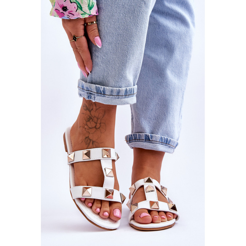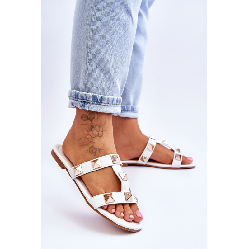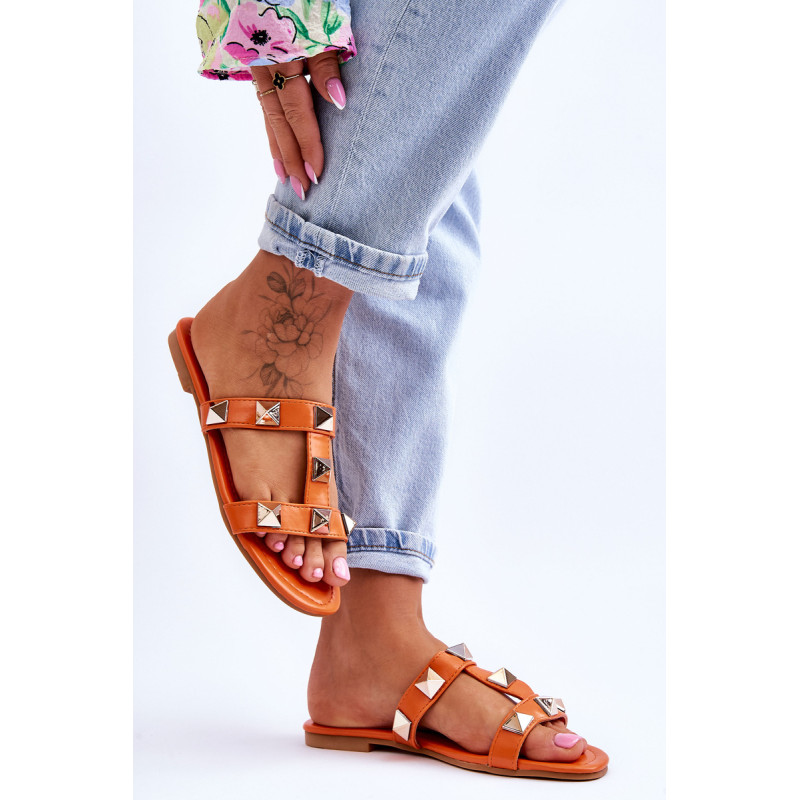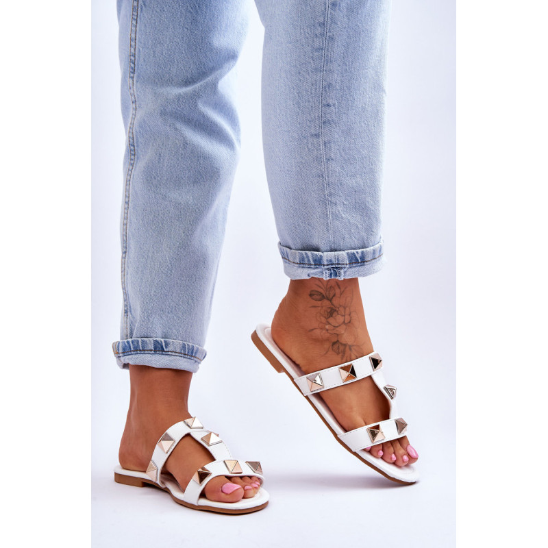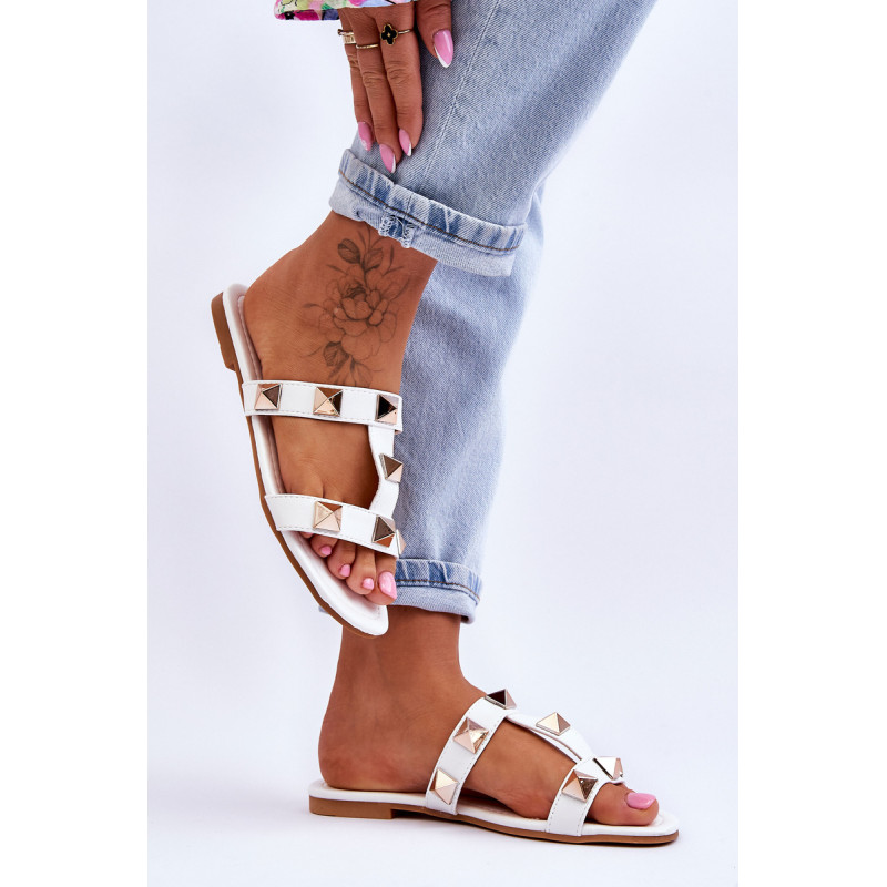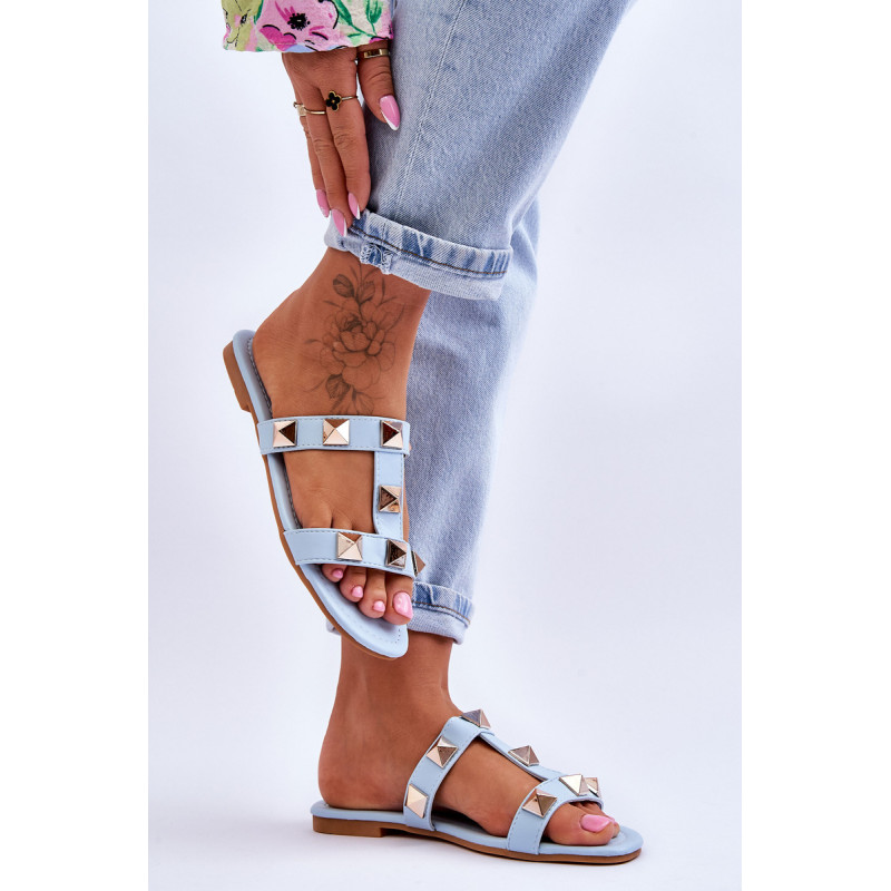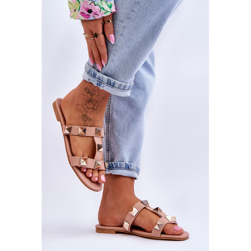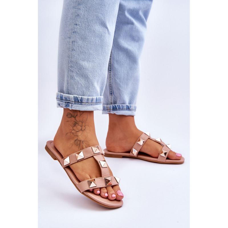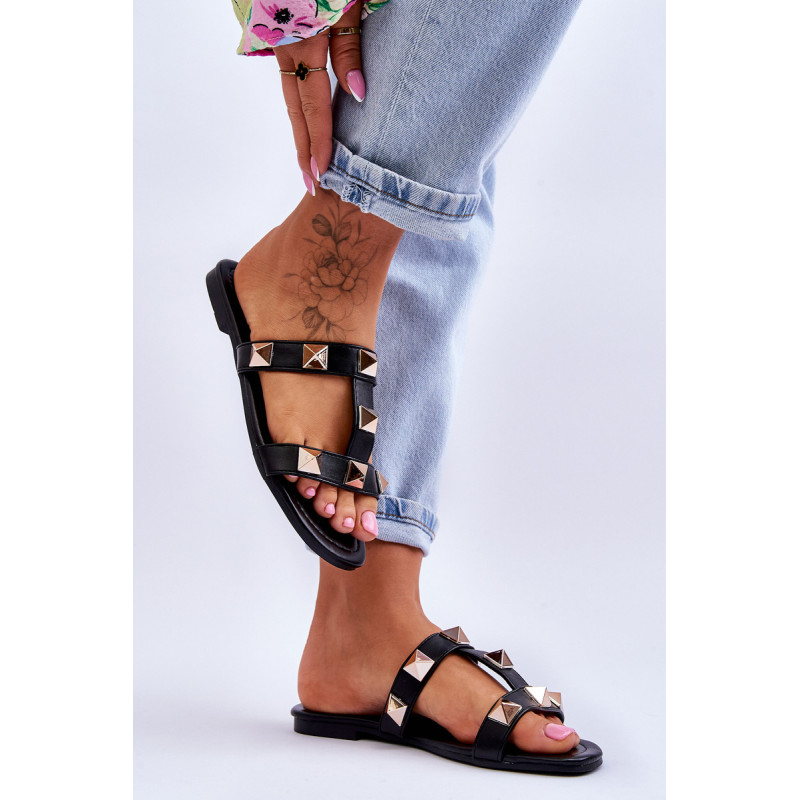 Klasikinės moteriškos šlepetės yra pagamintos iš ekologiškos odos. Jie turi madingus iškirpimus šonuose. Be to, jie buvo papuošti didelėmis smeigėmis. Šlepetės yra ant plokščio kulno su guminiu, neslidžiu padu. Šis modelis karštomis dienomis tikrai patiks kiekvienai moteriai. Minkštas, ekologiškos odos vidpadis leis patogiai dėvėti avalynę net ir visą dieną. Renkantis dydį, vadovaukitės dydžių lentele.
