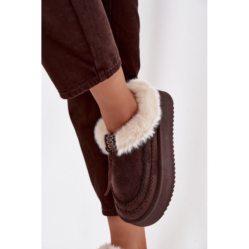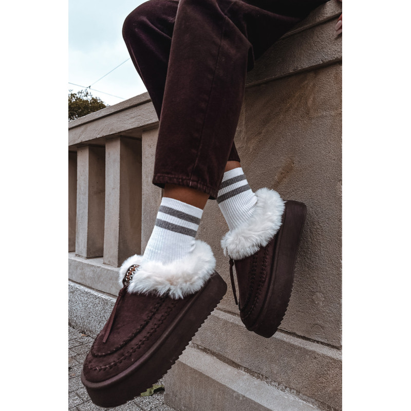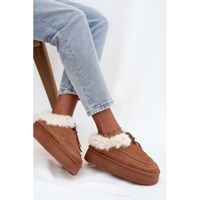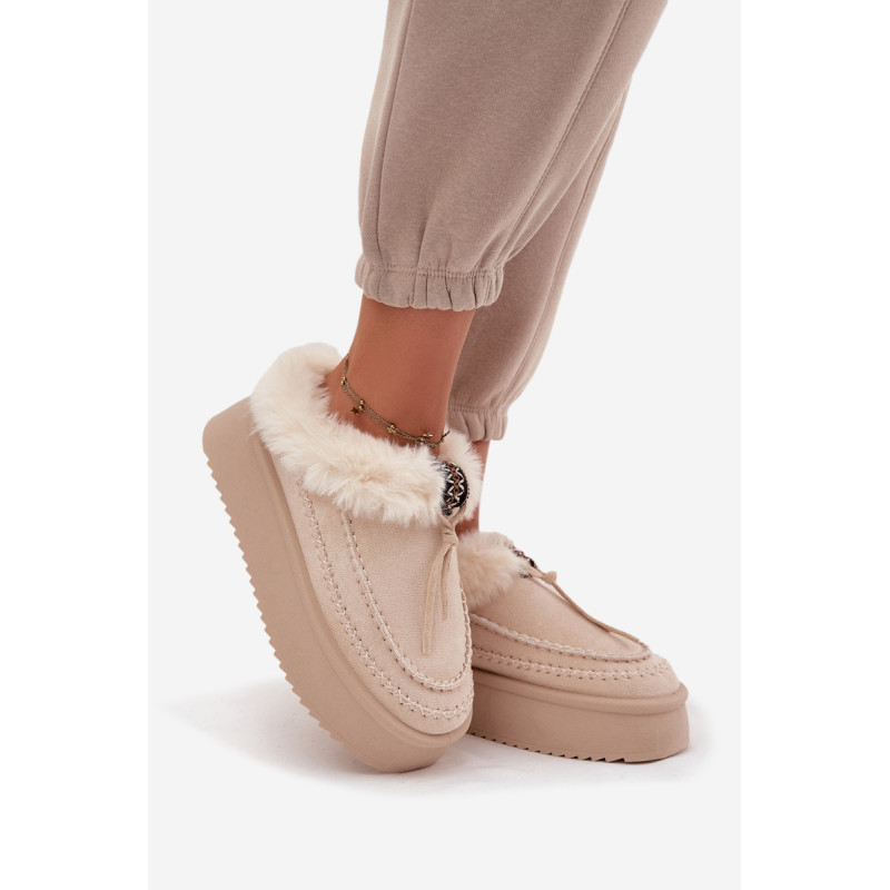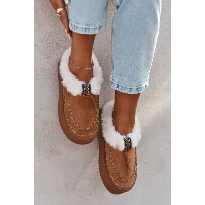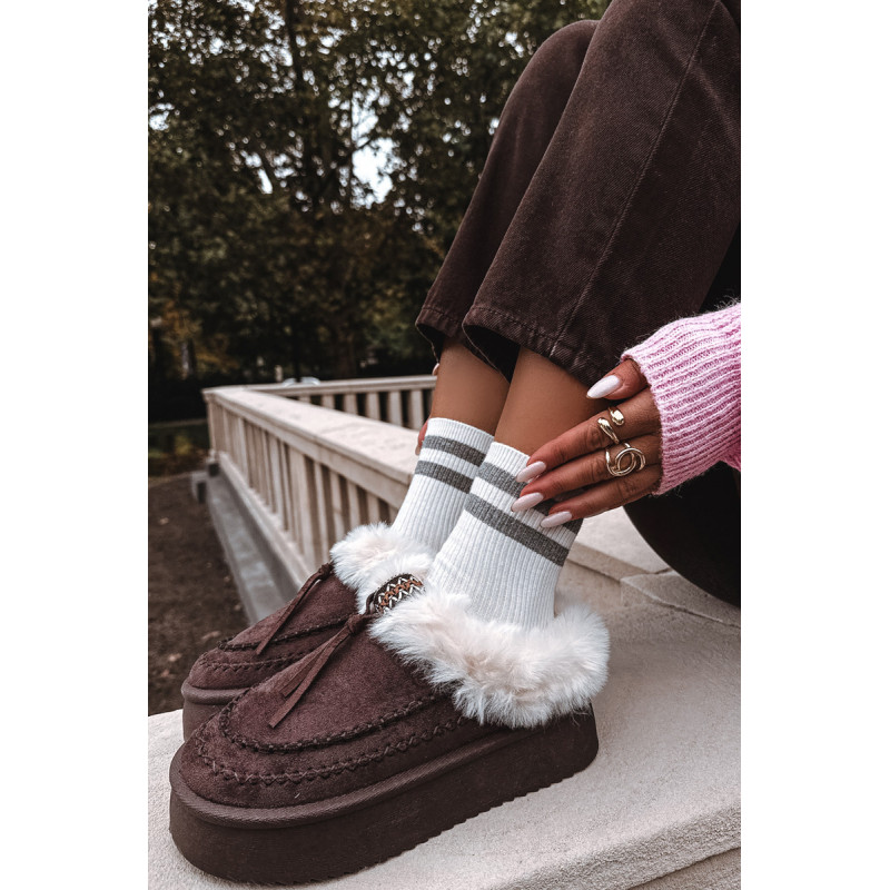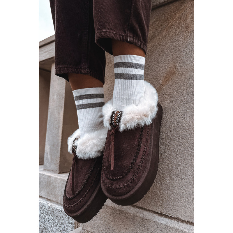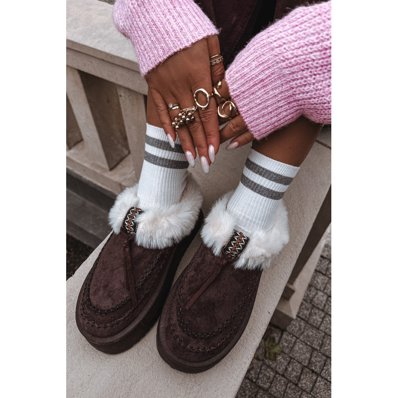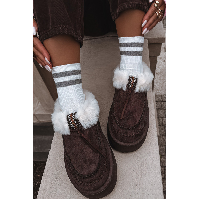 Moteriški sniegu batai, pagaminti iš ekologiško zomšos, yra puikus stiliaus ir patogumo derinys žiemą. Pastatyti ant platformos, kuri švelniai siaurina siluetą ir puikiai izoliuoja nuo šalto paviršiaus, jie užtikrina komfortą dėvint. Viršutinė bato dalis papuošta minkštu kailiu ir dekoratyvine juostele, suteikiančia visumui madingą žieminį įvaizdį. Bato vidus taip pat išklotas kailiu, užtikrinantį šilumą ir malonią apgaubiančią jausmą net ir šaltomis dienomis. Tai stilingi sniegų batai, puikiai tinkantys kasdieniams žieminiams deriniams. Renkantis dydį, vadovaukitės dydžių lentele.
