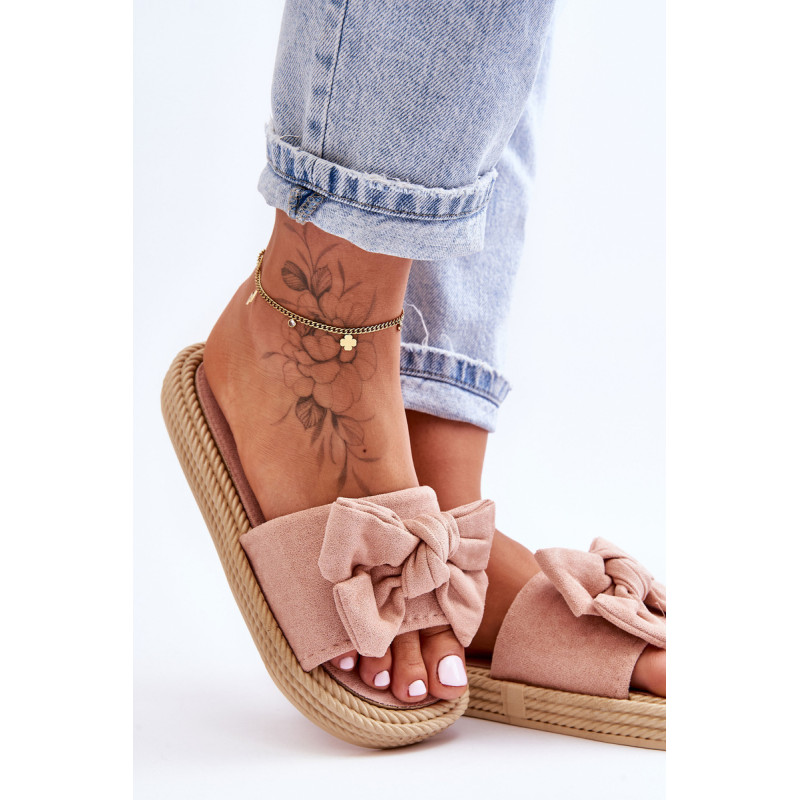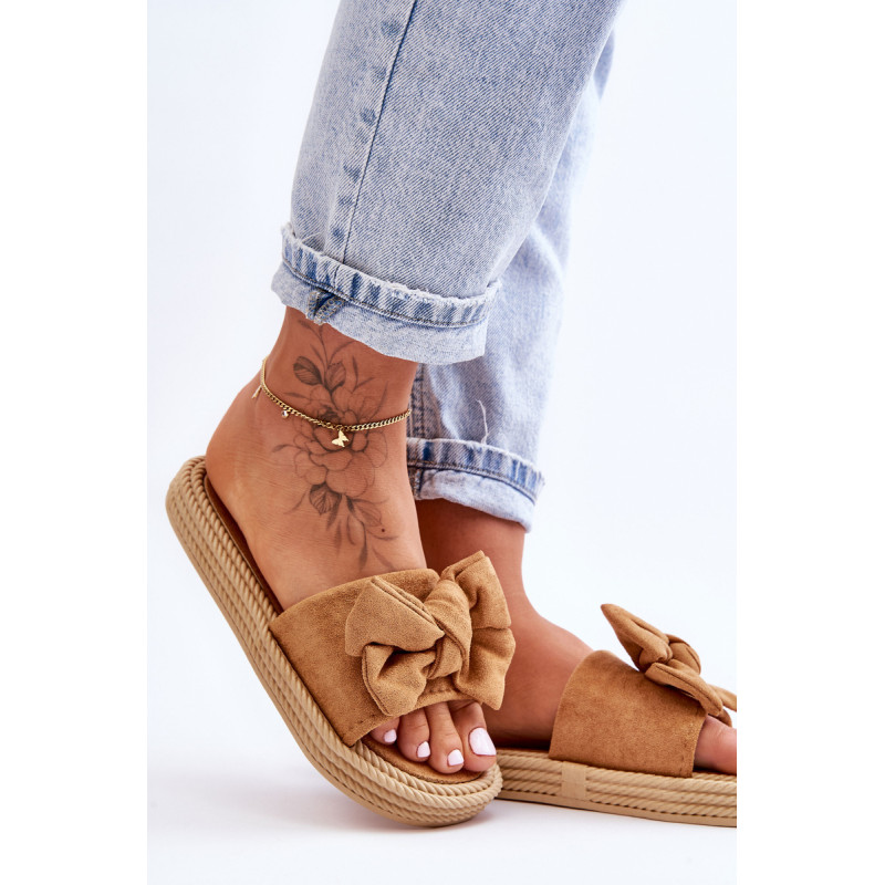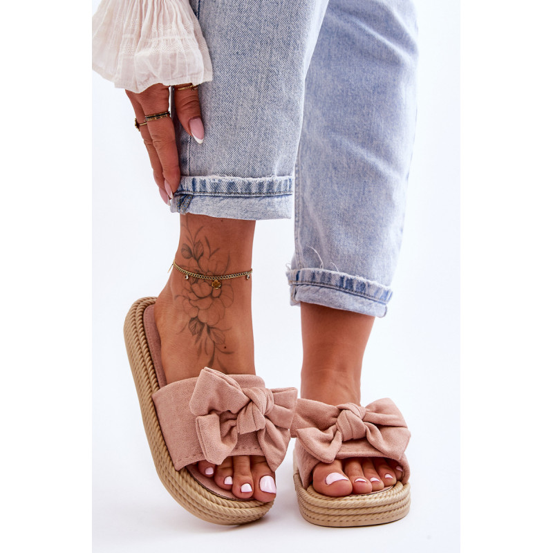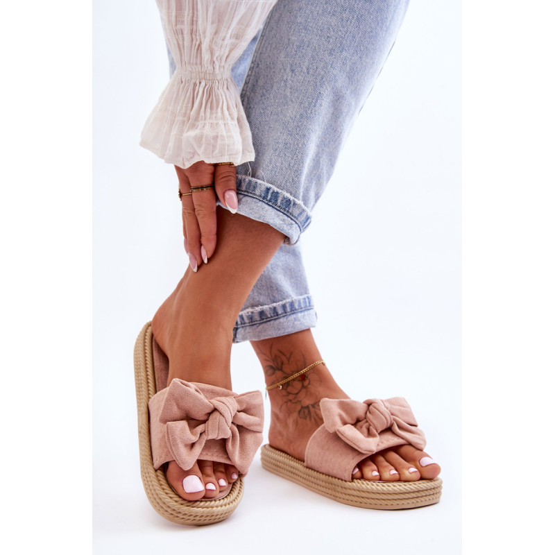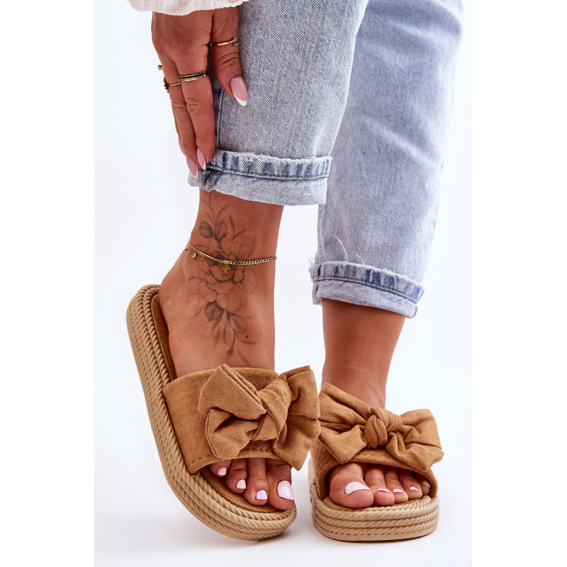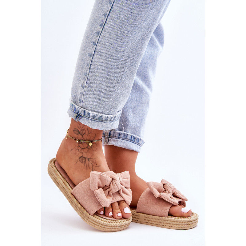 Moteriškos šlepetės pagamintos iš ekologiškos zomšos. Šio modelio priekyje yra žavus lankelis. Šlepetės buvo pastatytos ant didžiulės platformos. Šis modelis puikiai tiks šiltoms dienoms! Šios avalynės vidpadis taip pat pagamintas iš ekologiškos zomšos. Nelaukite ilgiau ir pirkite šiandien! Rinkdamiesi dydį, vadovaukitės dydžių lentele.