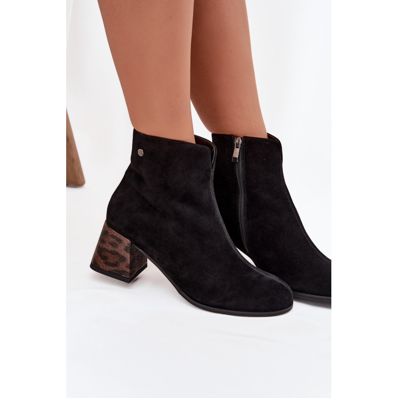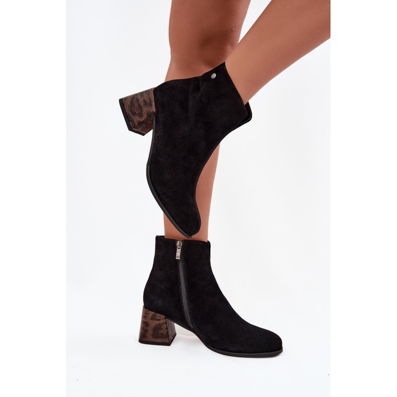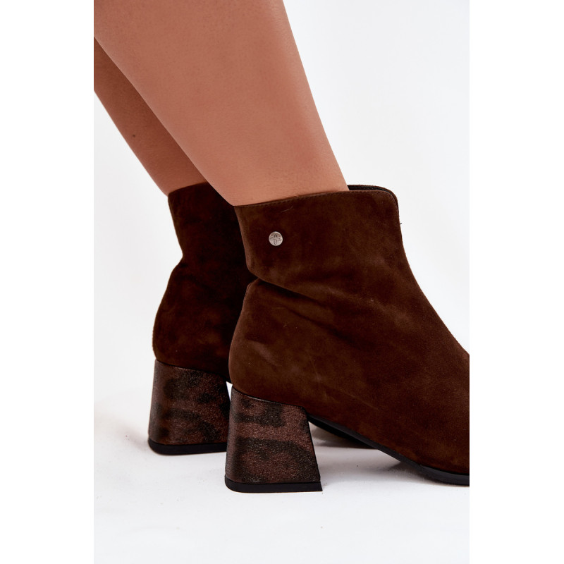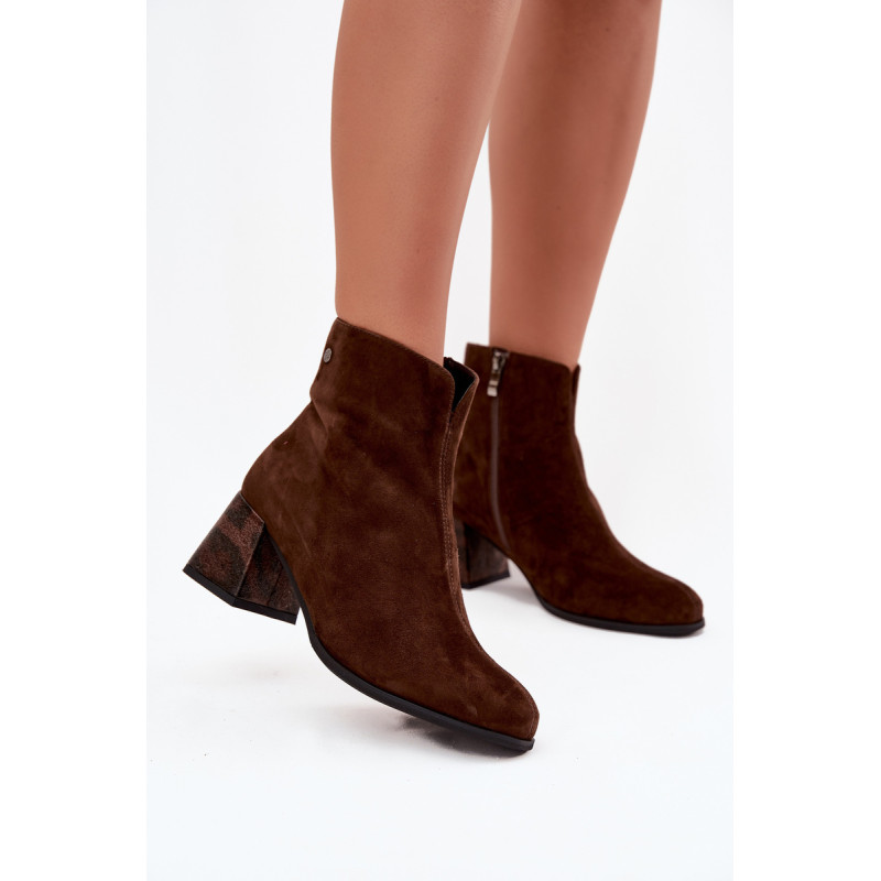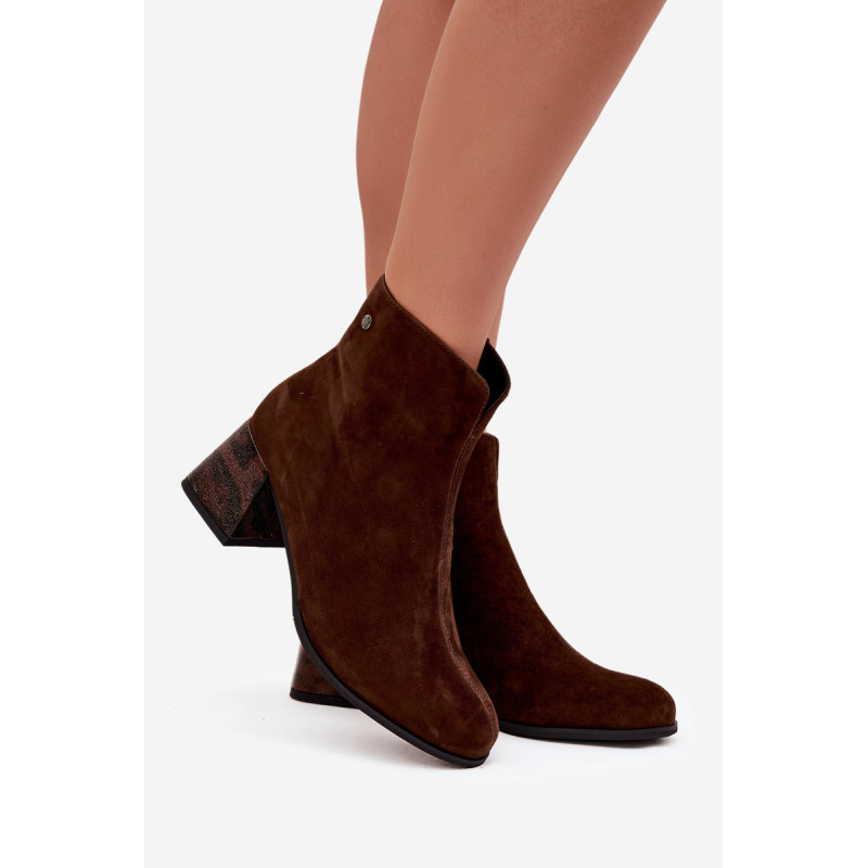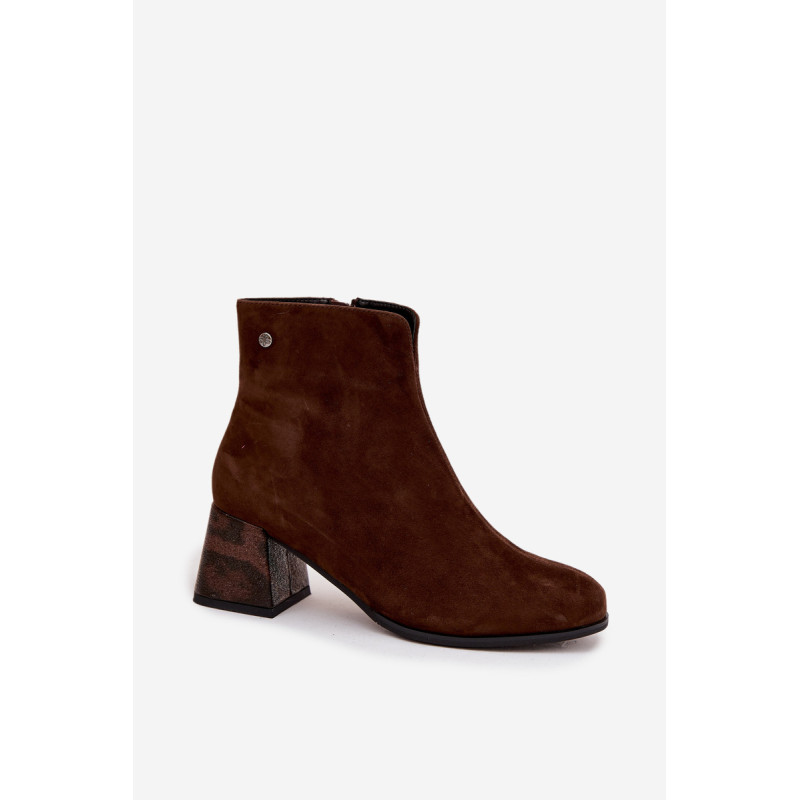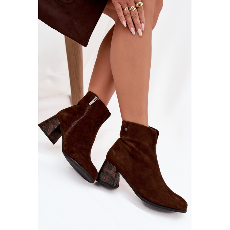 Moteriškos aulinukės Maciejka prekės ženklas. Pagamintos iš aukštos kokybės natūralios odos su zomšos apdaila, atrodo itin stilingai ir elegantiškai. Modelis išsiskiria dekoratyviniu stulpelio formos kulnu, kuris suteikia karakterio, tuo pačiu užtikrindamas stabilumą ir patogumą dėvint. Apvalios nosys pabrėžia jų moterišką išvaizdą, o praktiškas užtrauktukas palengvina užsidėjimą. Vidus išklotas minkšta avalynės antklode, užtikrinančia komfortą šaltomis dienomis. Papildomas dekoratyvinis elementas yra siūlė, einanti palei kulkšnį, optiškai siaurindama koją. Šios aulinės idealios rudeninėms ir žieminėms stilizacijoms, kurios jungia patogumą su laiko patikrintu stiliumi. Renkantis dydį, prašome vadovautis dydžių lentele. Renkantis dydį, vadovaukitės dydžių lentele.