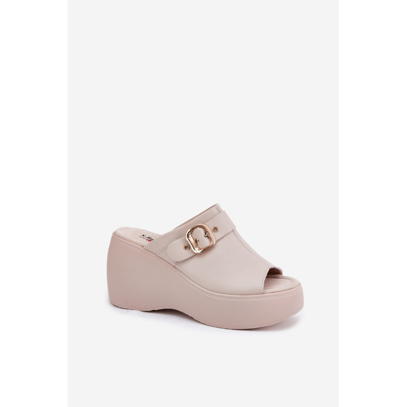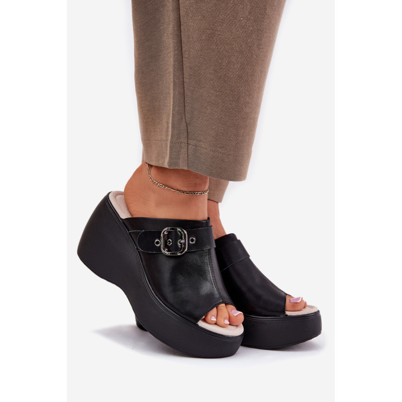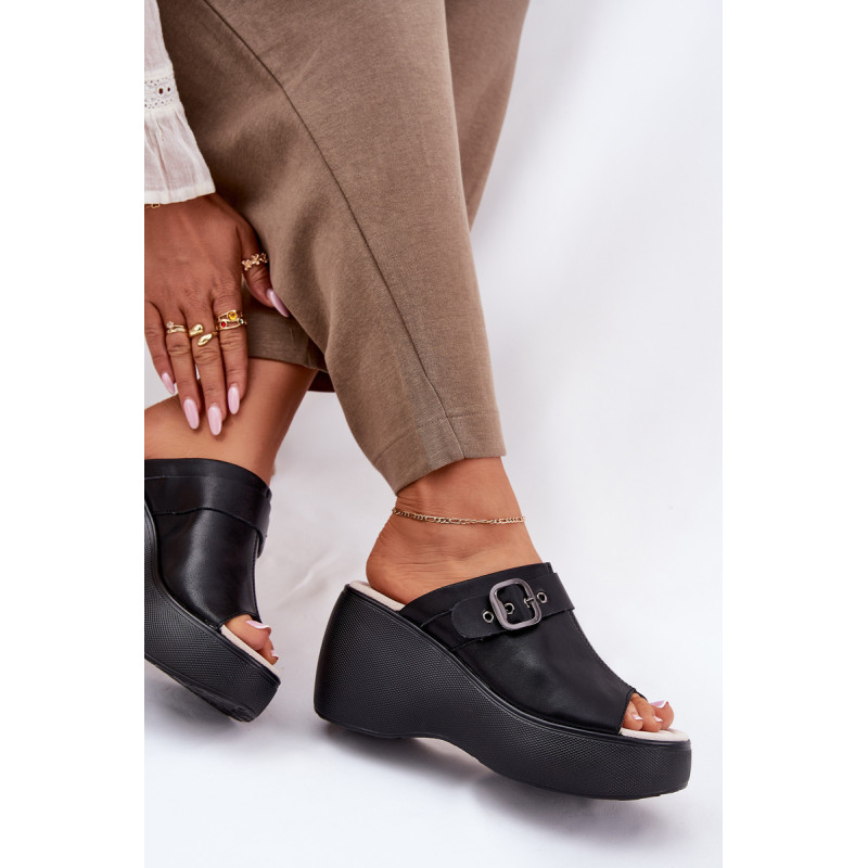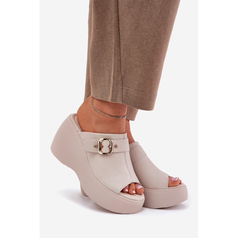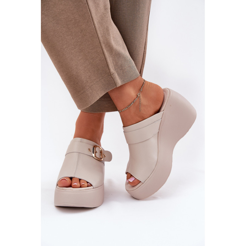 Moteriški šlepetės iš natūralios odos yra stilingas pasiūlymas šiltoms dienoms. Jos pasižymi pakulne ir platforma. Priekyje yra dirželis su sagtimi. Minkšta odinė padas užtikrina patogumą, o elegantiškas dizainas daro šias šlepetes puikiu vasaros aprangos akcentu. Puikiai tinka kasdieniams pasivaikščiojimams ir ypatingoms progoms. Renkantis dydį, vadovaukitės dydžių lentele.