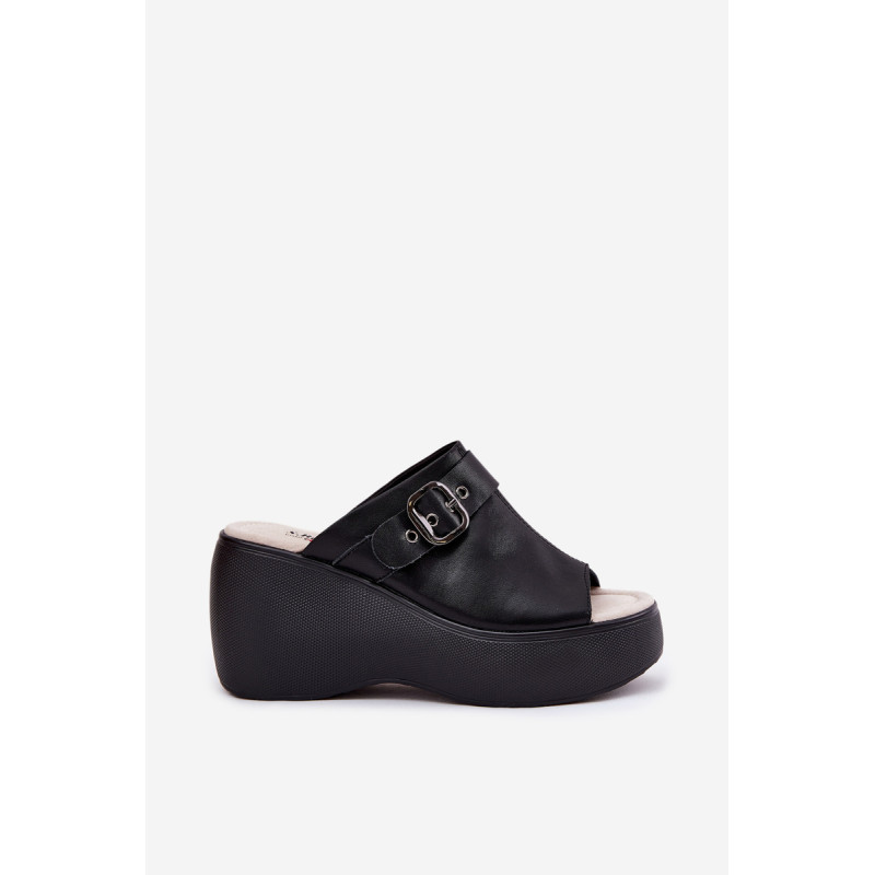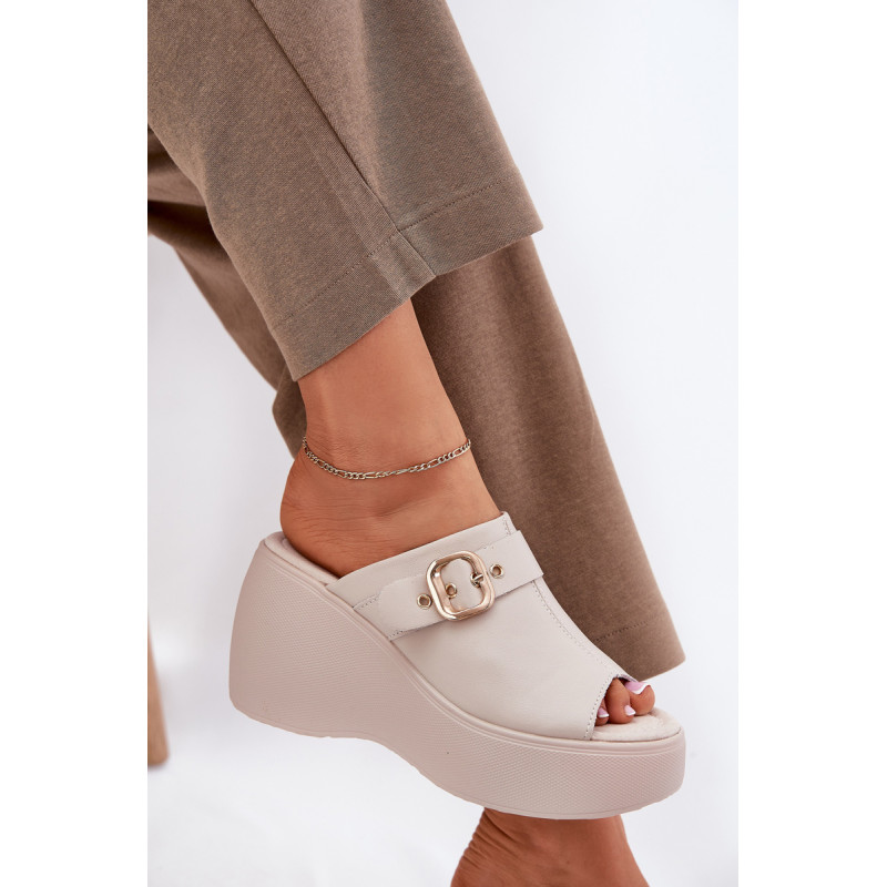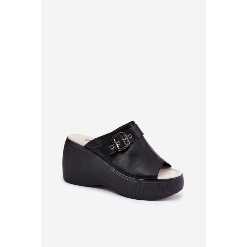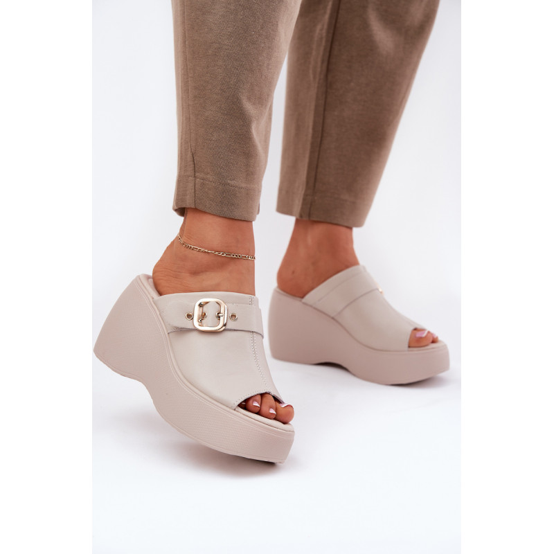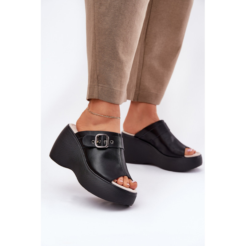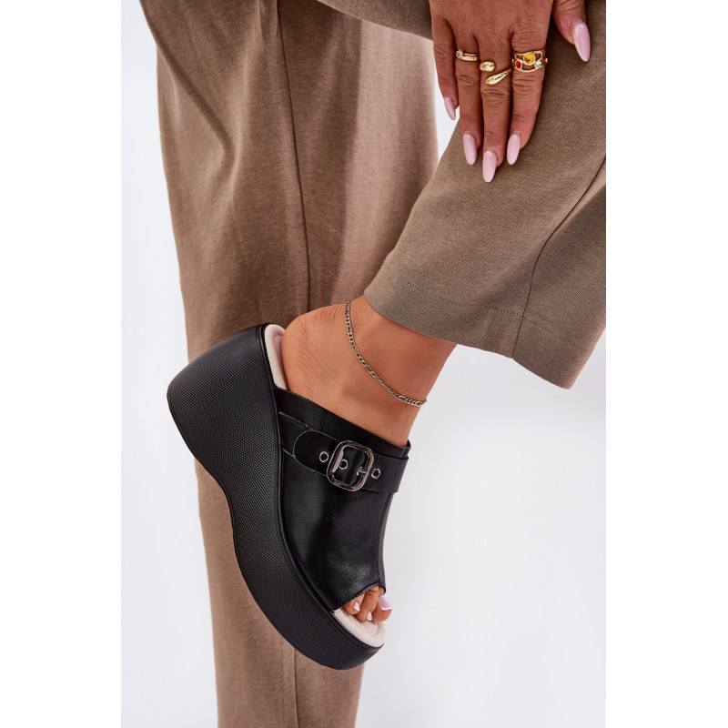 Moteriški šlepetės iš natūralios odos yra stilingas pasiūlymas šiltoms dienoms. Jos pasižymi pakulne ir platforma. Priekyje yra dirželis su sagtimi. Minkšta odinė padas užtikrina patogumą, o elegantiškas dizainas daro šias šlepetes puikiu vasaros aprangos akcentu. Puikiai tinka kasdieniams pasivaikščiojimams ir ypatingoms progoms. Renkantis dydį, vadovaukitės dydžių lentele.