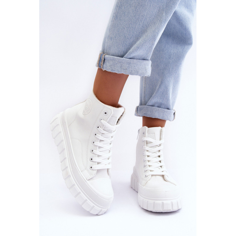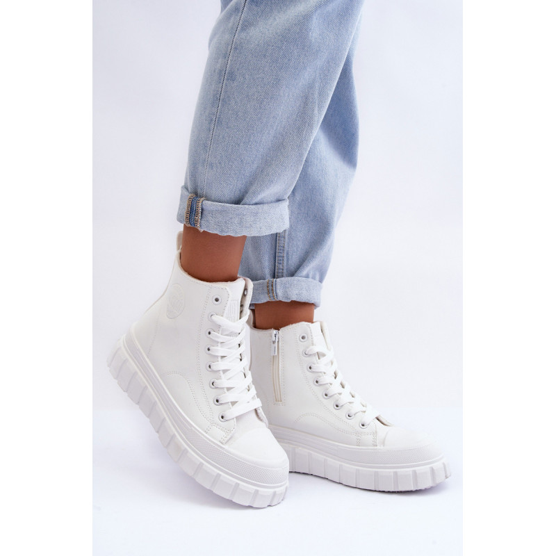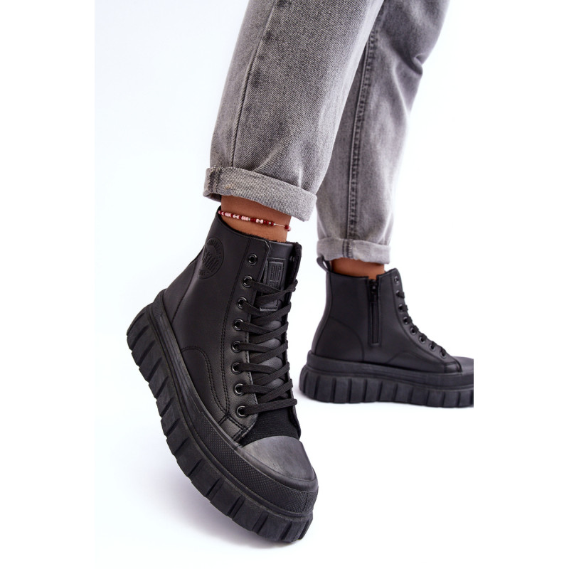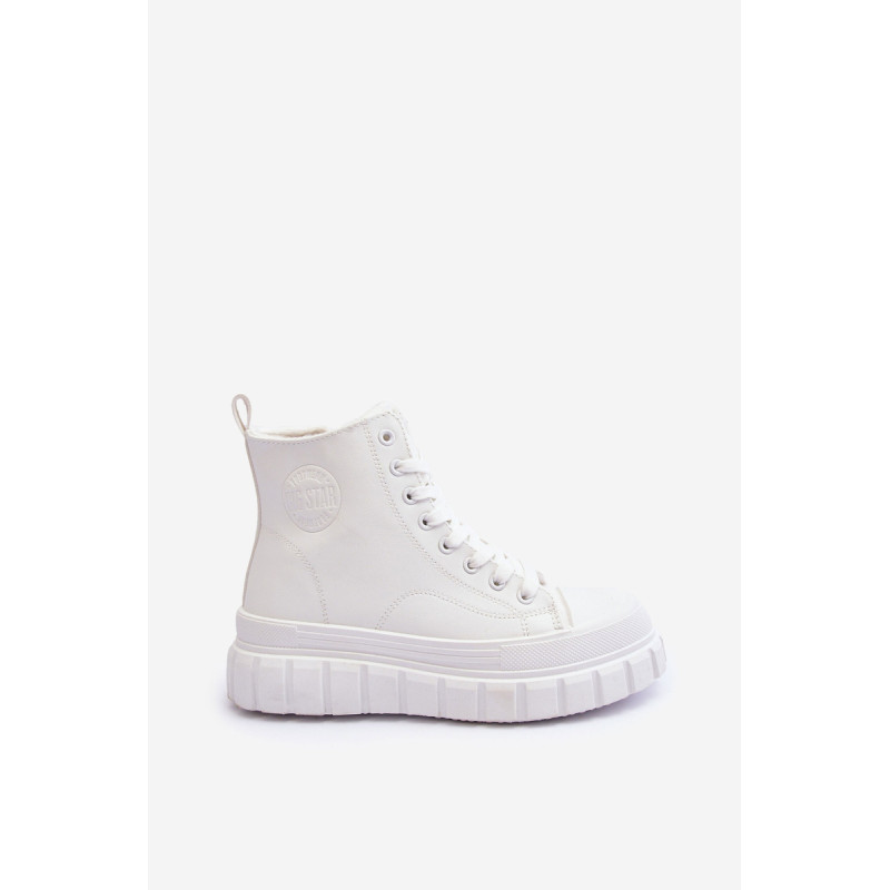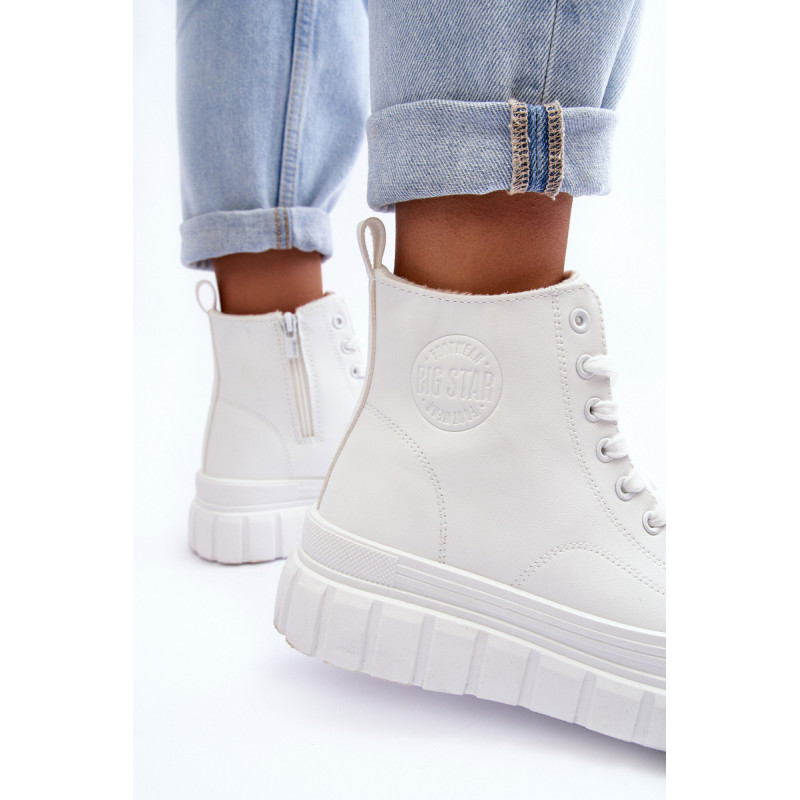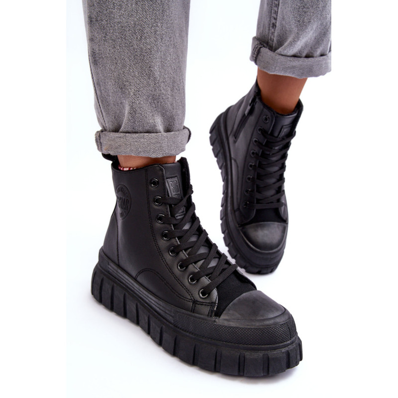 Big Star prekės ženklo aukšti moteriški sportbačiai, pagaminti iš ekologiškos odos. Įrengtas ant didžiulės platformos. Padas neslidus. Šis modelis šone užsegamas užtrauktuku ir papildomai suvarstomas. Vidus apšiltintas kailiu. Viršuje prekės ženklo logotipas ir siūlės. Renkantis dydį, vadovaukitės dydžių lentele.