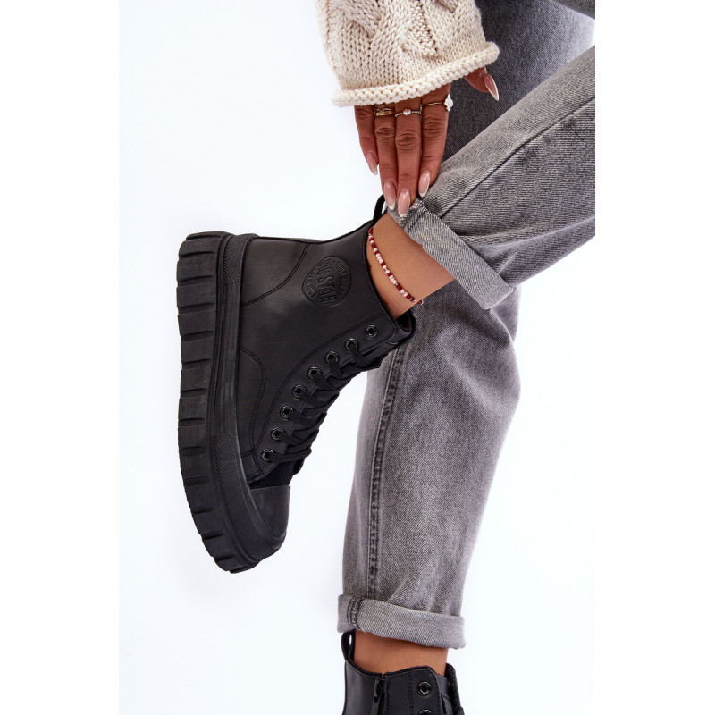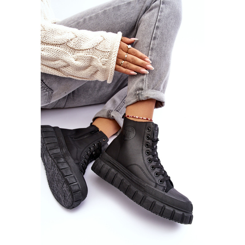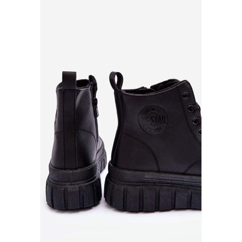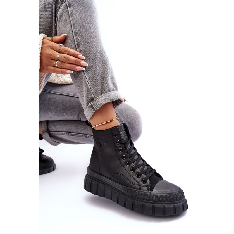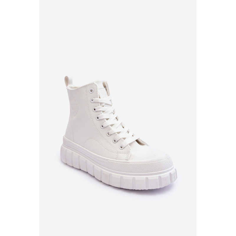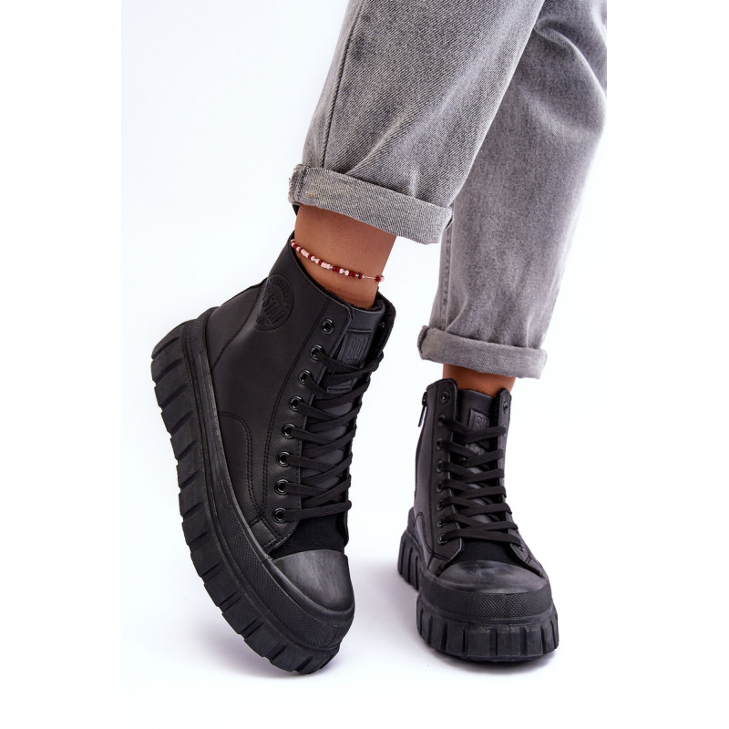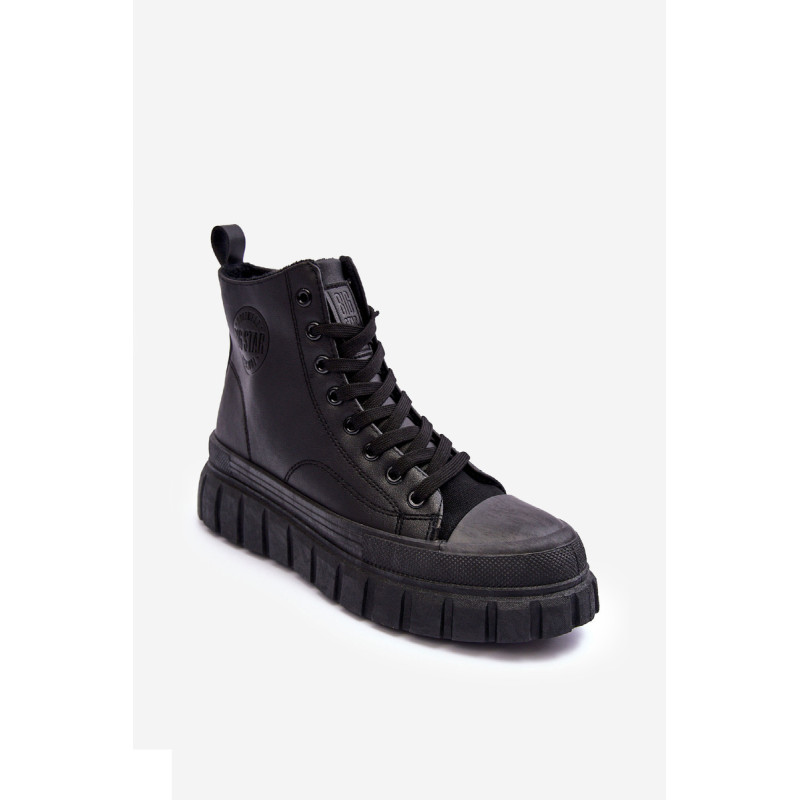 Big Star prekės ženklo aukšti moteriški sportbačiai, pagaminti iš ekologiškos odos. Įrengtas ant didžiulės platformos. Padas neslidus. Šis modelis šone užsegamas užtrauktuku ir papildomai suvarstomas. Vidus apšiltintas kailiu. Viršuje prekės ženklo logotipas ir siūlės. Renkantis dydį, vadovaukitės dydžių lentele.
