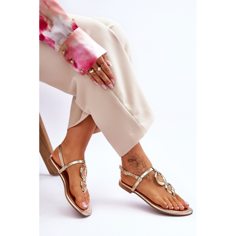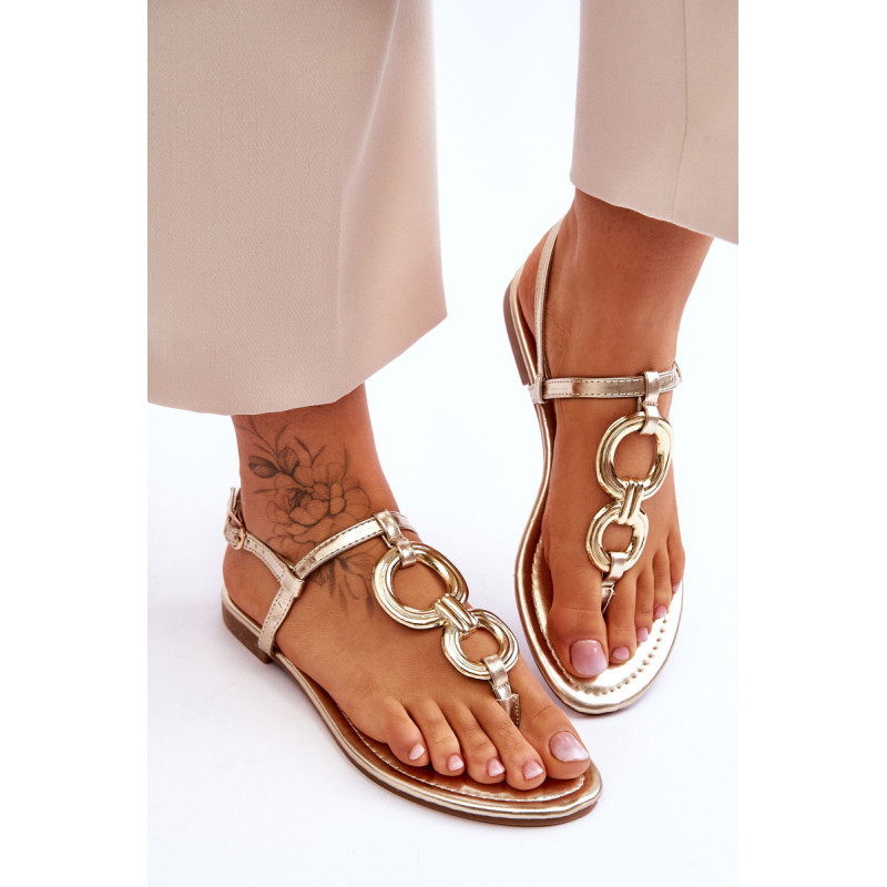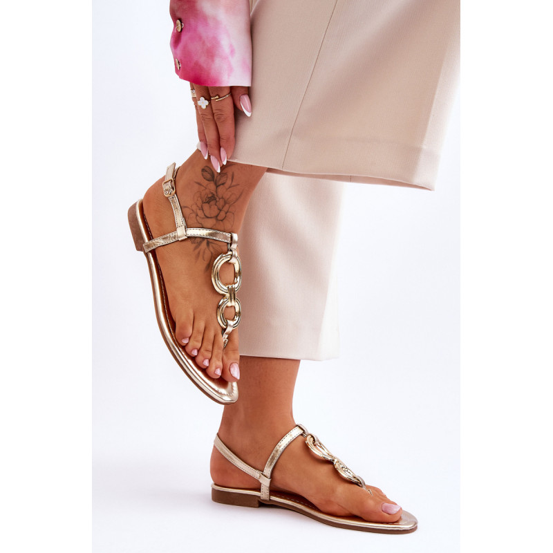 Unikalūs šlepečių stiliaus sandalai yra pagaminti iš ekologiškos odos. Šio modelio dirželis turi plastikinį papuošimą. Sandalai yra ant plokščio kulno su neslidžiu padu. Šis modelis užsegamas reguliuojamu dirželiu su sagtimi. Jų tikrai turėtumėte turėti savo garderobe! Rinkdamiesi dydį, vadovaukitės dydžių lentele.